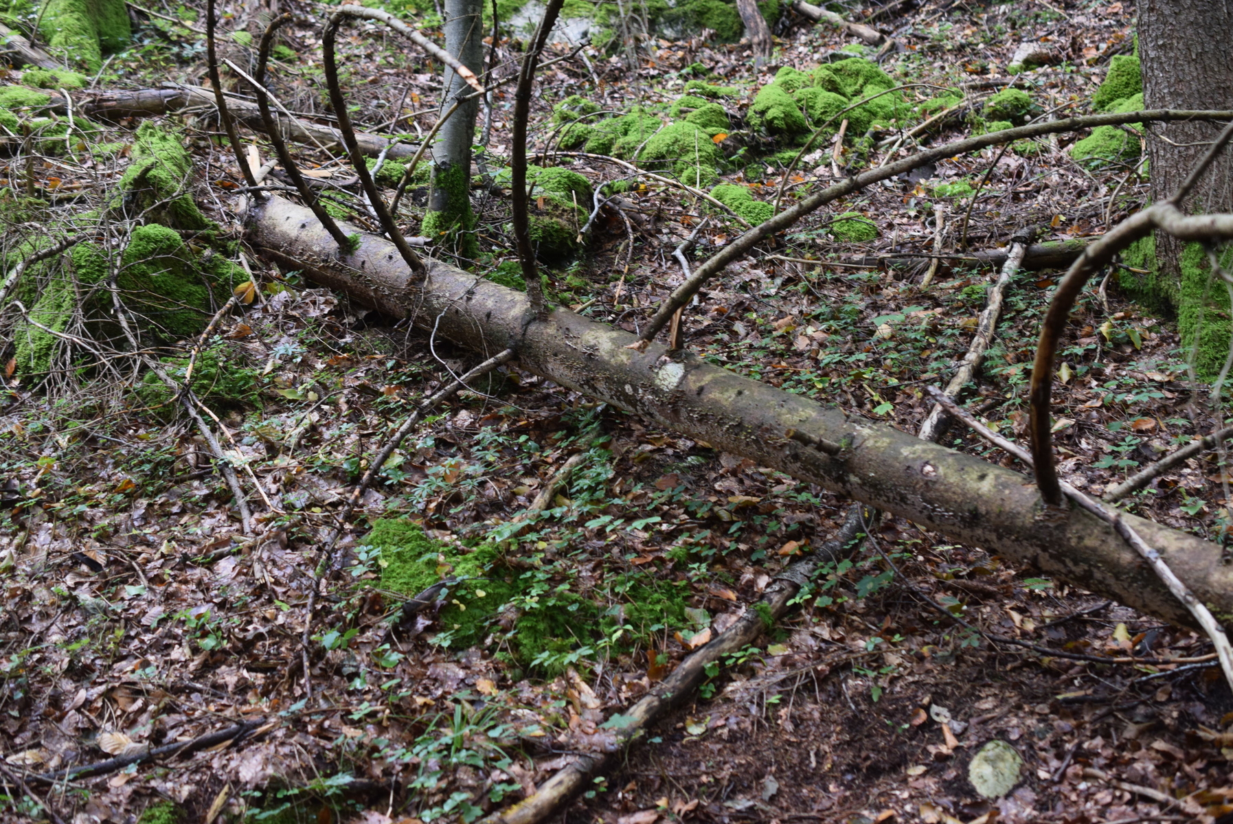 Trichaptum abietinum hunderte Exemplaren an liegende Fichte
