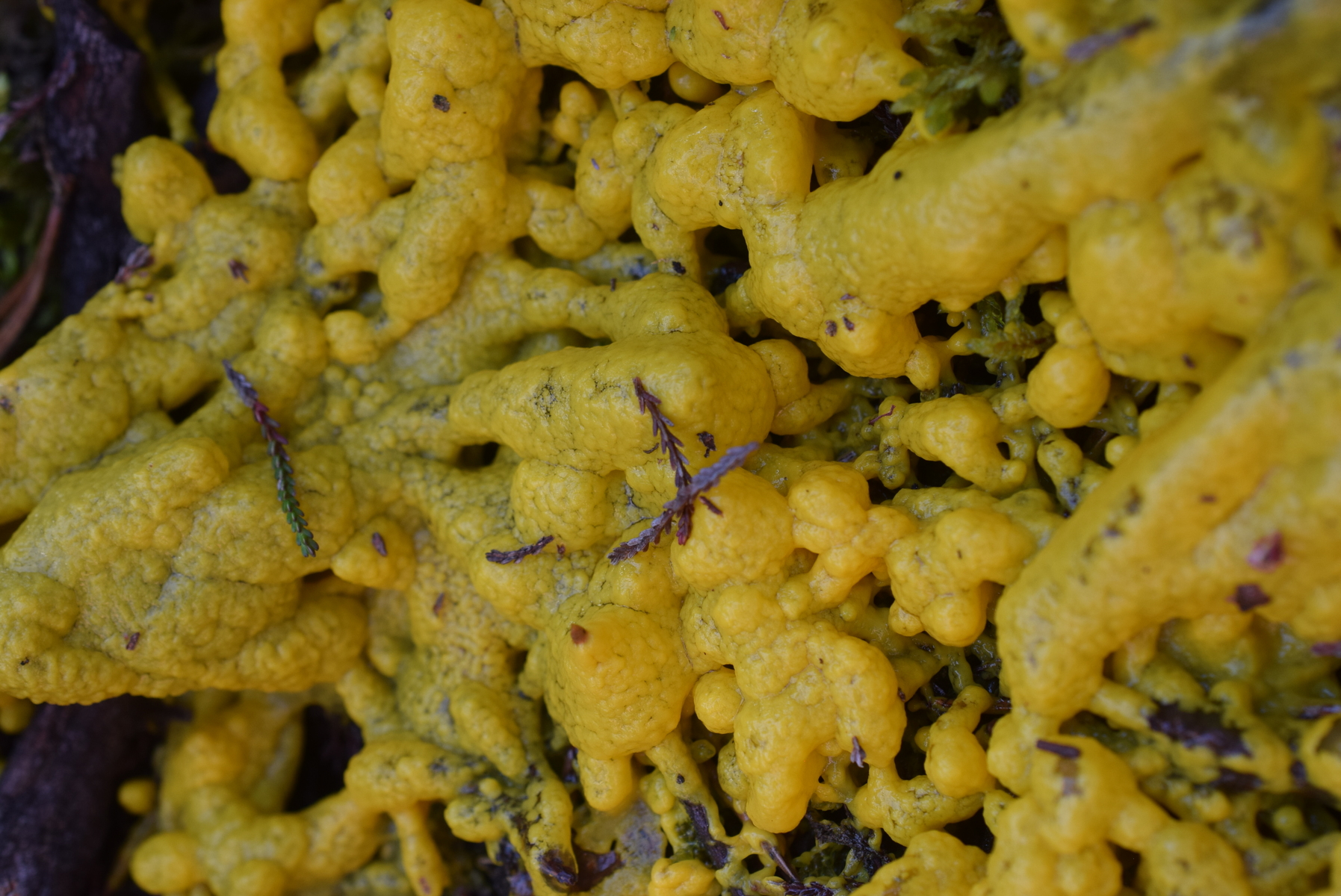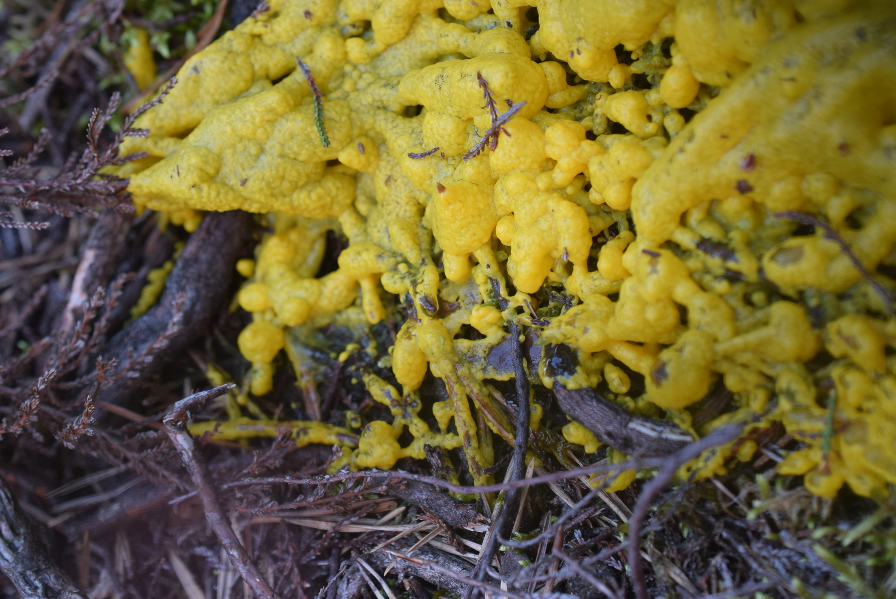 Dein Fund ist leider noch unreif. Da kommt sowohl eine Fuligo in Frage oder auch z.B.Physarum virescens (an Moosen im Fichterwald). Das läßt sich leider nur nach diesen Fotos nicht sagen.