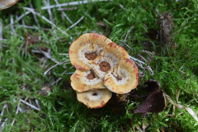 Coltricia perennis , ein Gigant , so dicke Stiel ?. Auf den ersten blick war ich von der Große verwirrt , aber ich stellte fest , das mehrere Exemplare zu einem zusammengewachsen waren