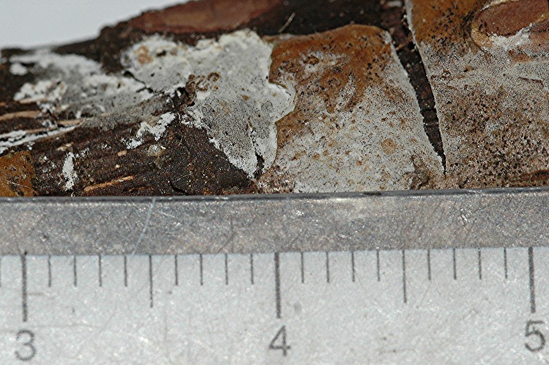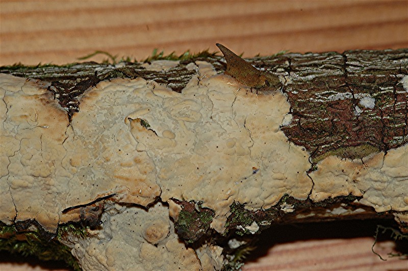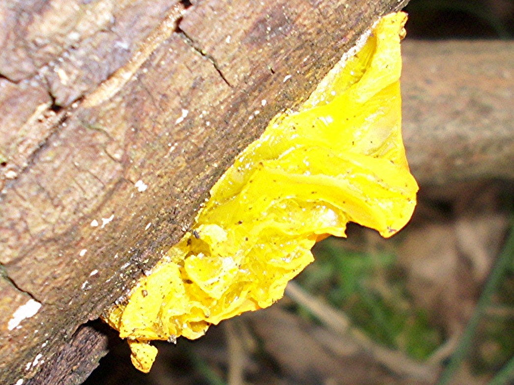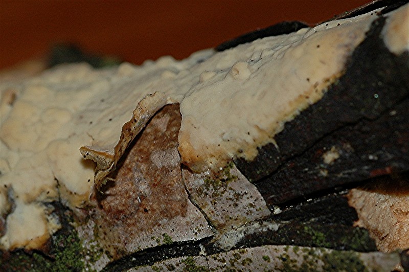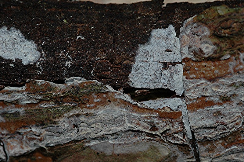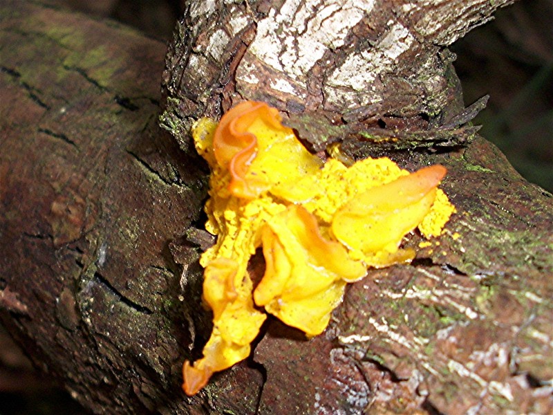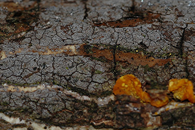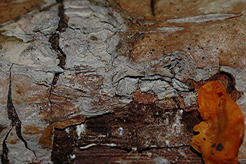 leider habe ich keine Ahnung, was das für ein Pilz sein könnte, der zusätzlich durch Frost und Vertrocknung in Mitleidenschaft gezogen ist. Auffällig war im Gelände, weshalb er sofort ins Auge stach, diese dunkelorangene Färbung, die allerdings bei den feuchten Anteilen des Pilzes nicht immer so intensiv war. Weiter fiel mir auf, daß der Pilz fast immer mehr als die Hälfte von Rinde bedeckt war. Nicht alle Photos stammen von mir, da ich im Gelände keinen Photo dabei hatte.