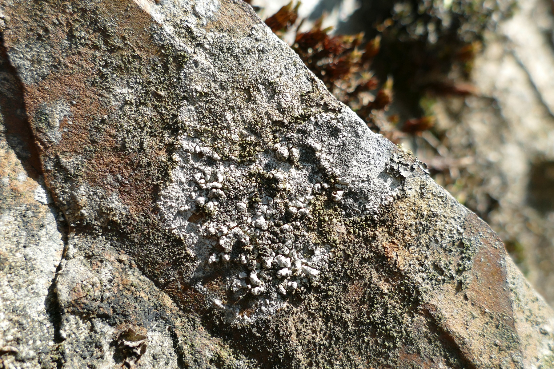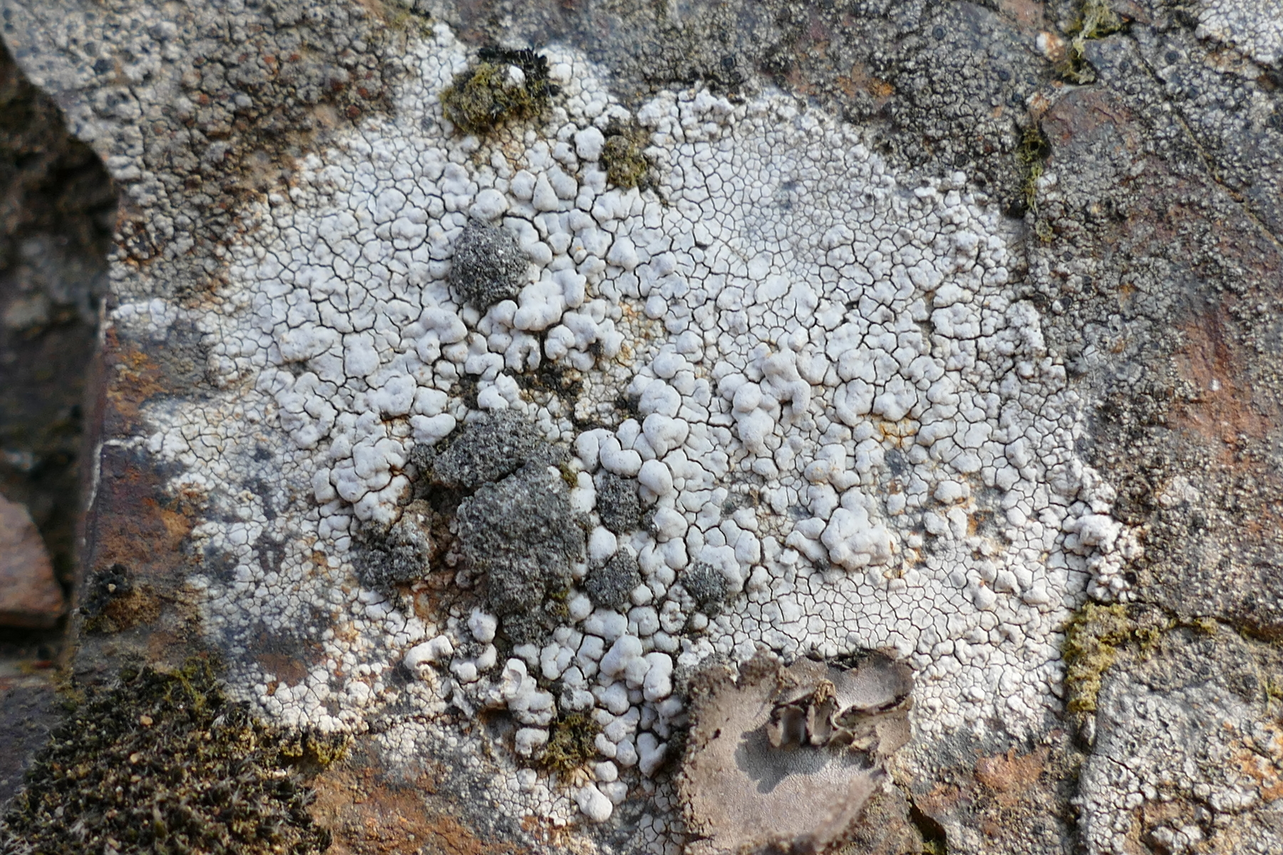 Die grauen Püschel auf dem kreidigen Lager sind wohl Sorale und weißen m.E. auf eine Lecanora pannonica hin.
