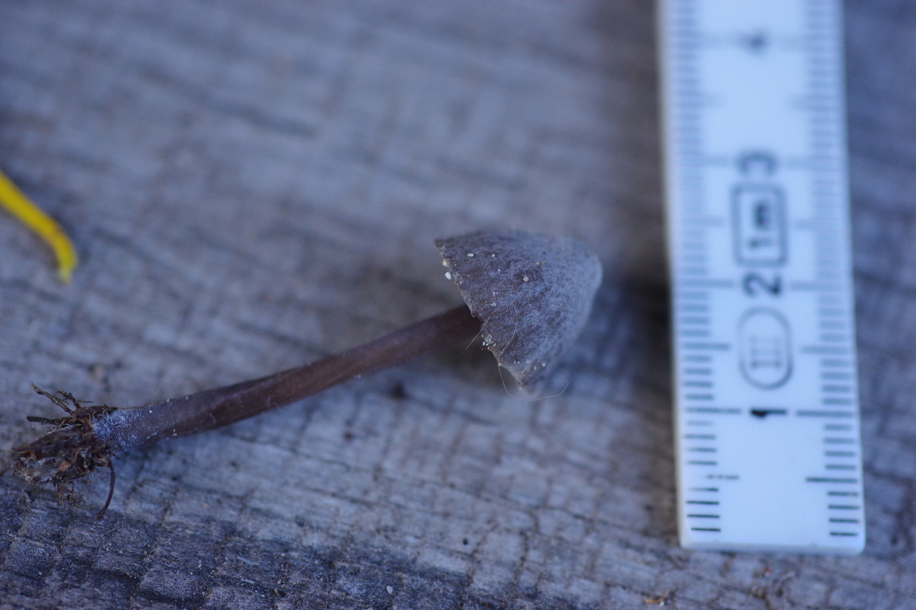 2) eine kräftigere Mycena mit dunklem auffällig gedrehtem Stiel