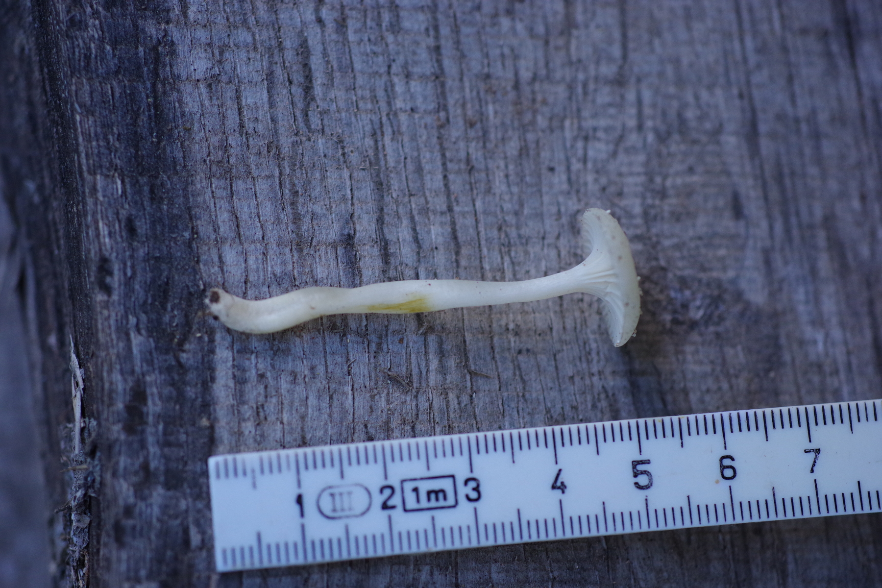 3) eine filigranere Mycena mit deutlich nach unten überlappender Huthaut
