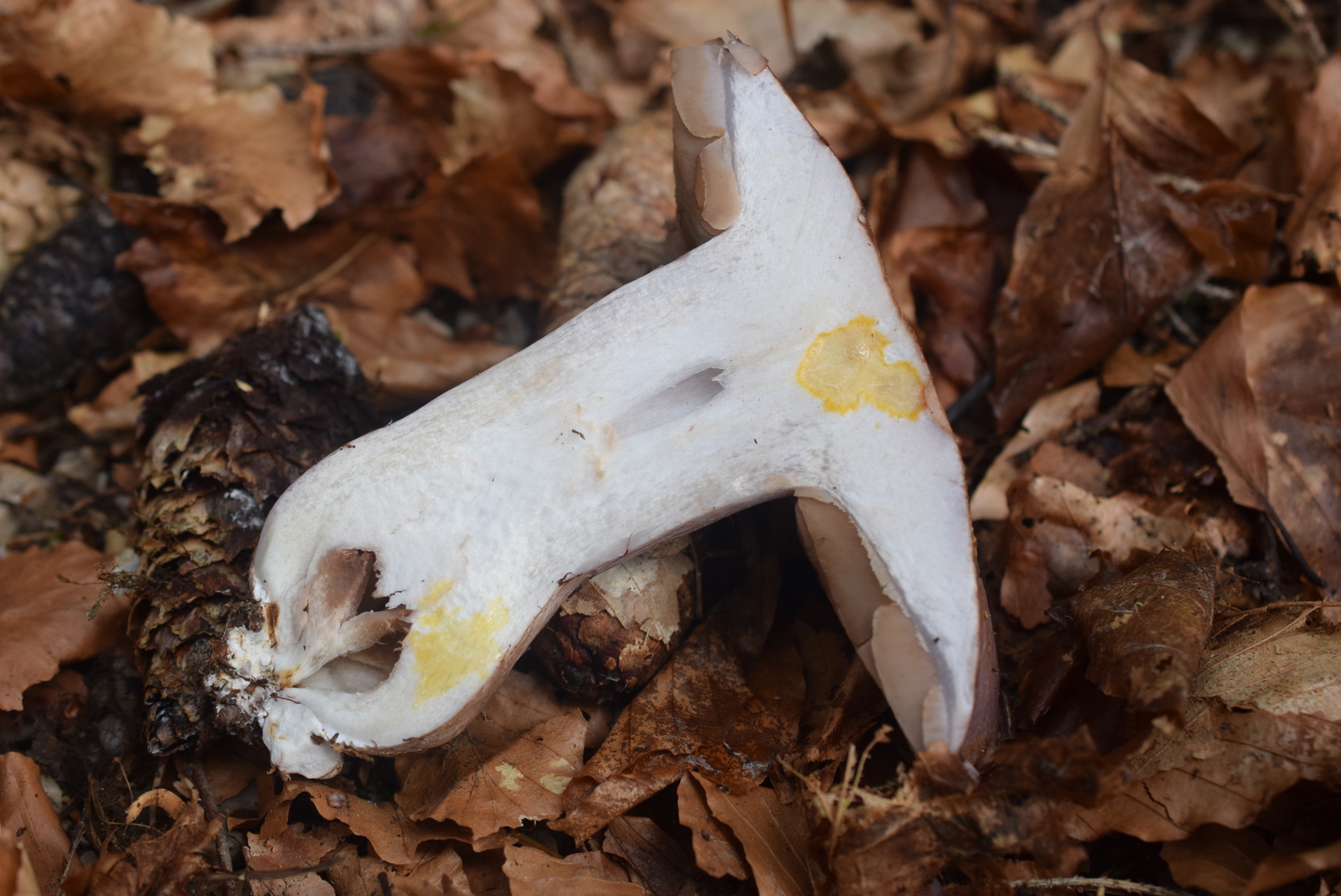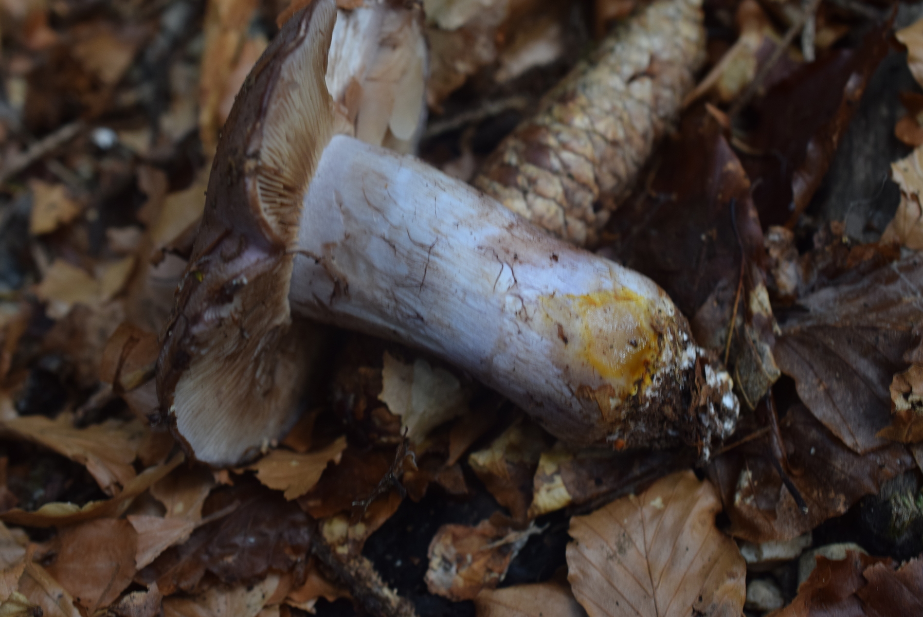 Vorkommen bei Buche, Hut lilabraun (siehe Bilder), Lamellen auch jung gänzlich ohne Lilatöne, Fleisch weiß, ganz festfleischig