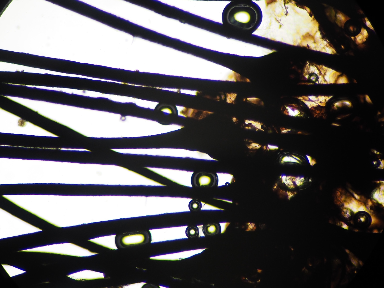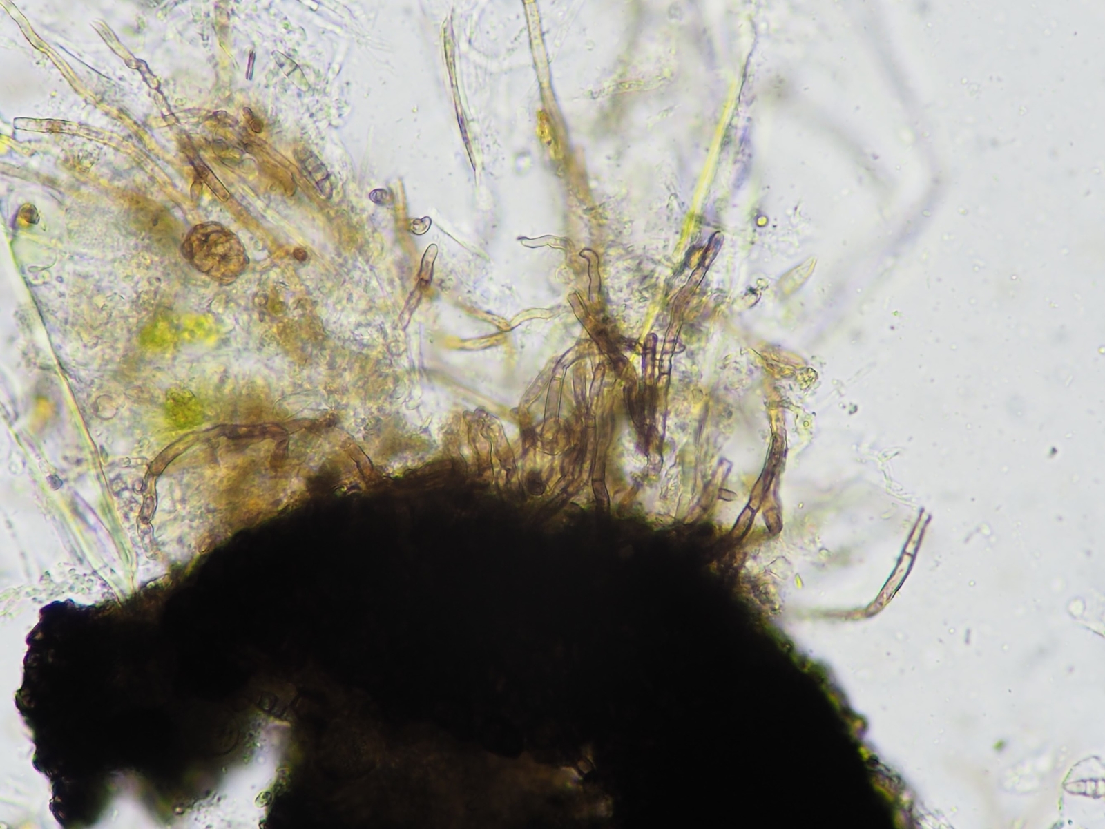 Die Haare sind sehr stabil (Pomade?) sodass ich mir maximal irgendwelche Pyrenos vorstellen könnte. Unter dem Mikro geben sie leider ihre Herkunft nicht preis, zwar waren ein paar Hyphen und Sporen im Detritus darunter zu finden, jedoch konnte ich keine direkte Beziehung zu den Haaren finden und vorallem keine Sporenträger. Und dass so ein morsches Holz voller Hyphen ist erstaunt mich nicht. (und wenn man genau hinschaut sieht man winzige Pyrenokügelchen überall auf dem Holz von denen die Sporen stammen werden)
