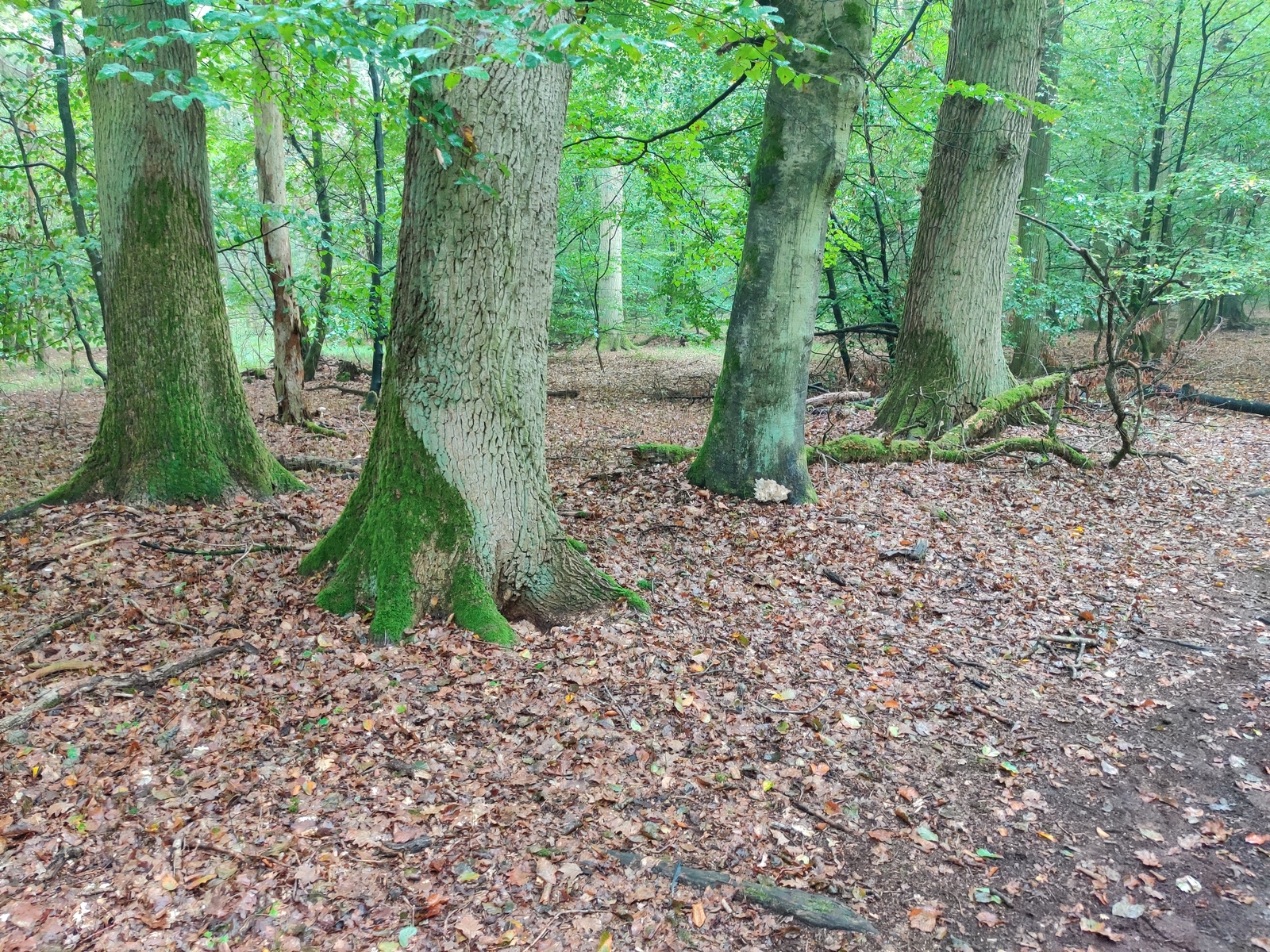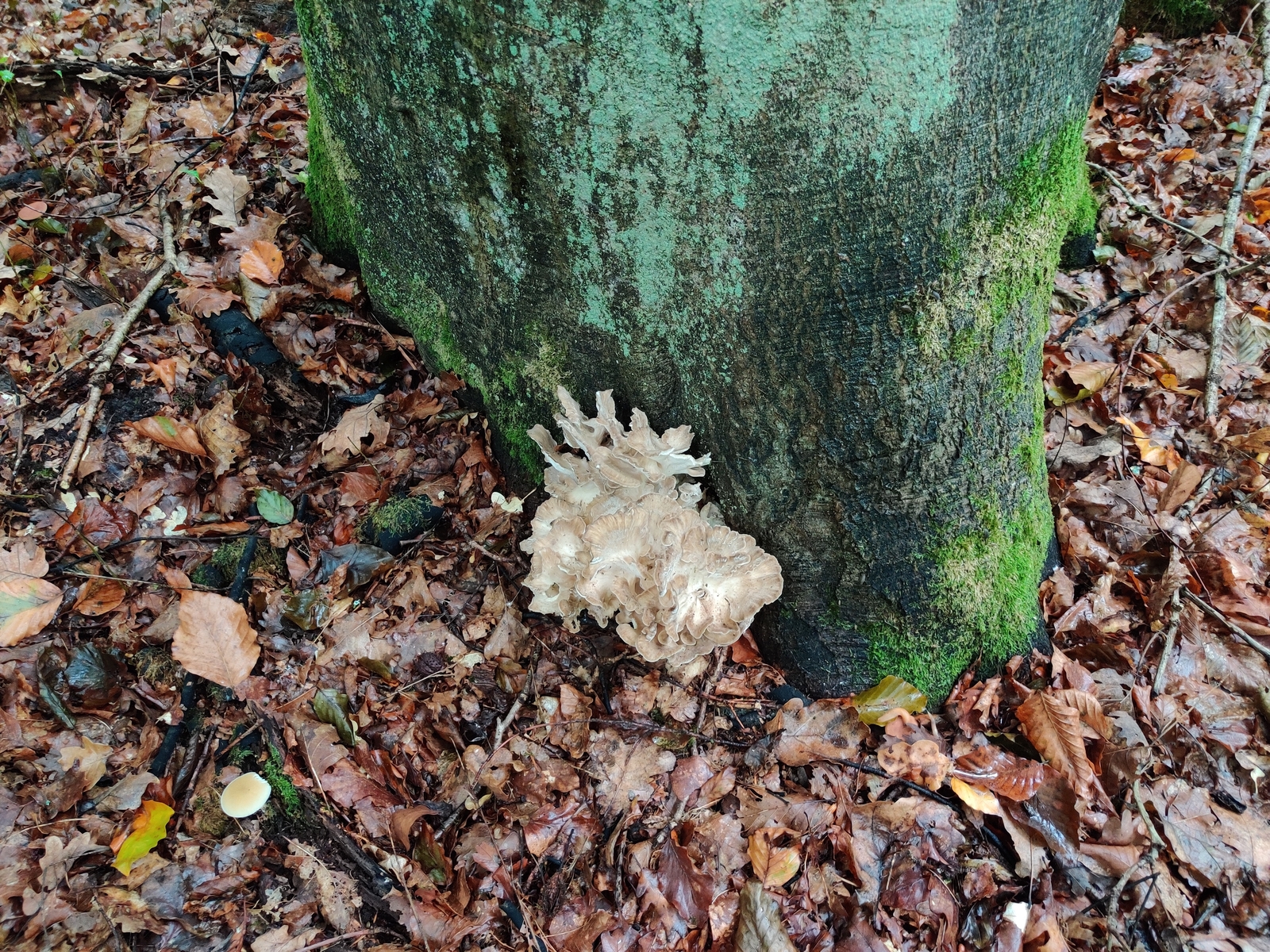 Auf die Bäume im weiteren Umkreis hatte ich auch kein Auge, da es für mich offensichtlich schien, dass der Pilz an (der Wurzel) der Buche wächst. Dass im Umkreis von 50 m eine Kiefer stand ist wahrscheinlich, Tanne und Fichte sollte es dort keine gegeben haben. Dennoch denke ich eher, dass der Pilz auf der Wurzel der Buche parasitierte.