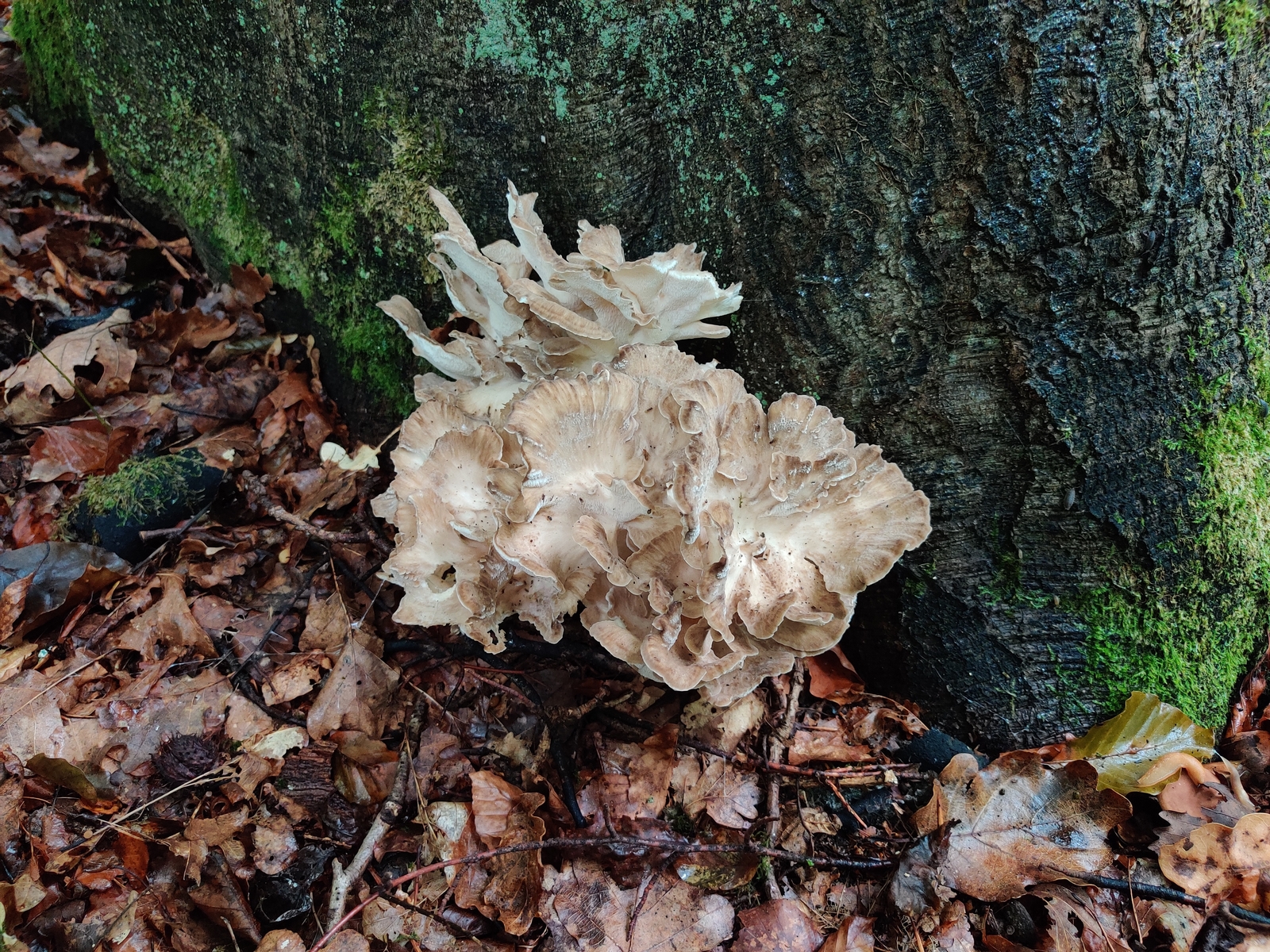 Auch wenn das Aussehen einigermaßen passen würde - eingermaßen, nicht perfekt - wäre die Wahrscheinlichkeit für einen komisch gewachsenen Klapperschwamm wesentlich höher. Grifola ist zwar vorwiegend an Eichen zu finden, aber Rotbuche geht schon auch.