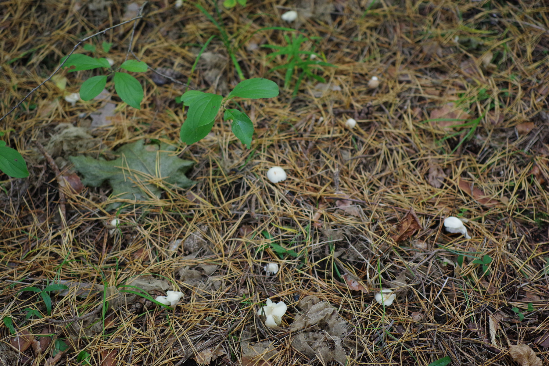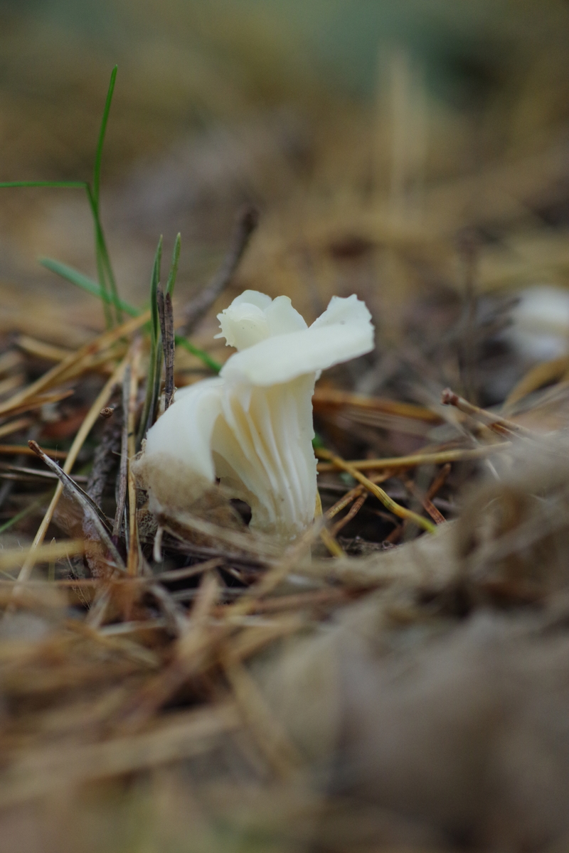 Aus dem Kiefernwald (sonst kommt höchstens noch ein einzelner Ahorn und weiter weg stehende Fichte in Frage) habe ich diesen reinweißen Ellerling, der in größerer, lockerer Ansammlung steht. Hutgröße bis 3 cm. Lamellen sehr weit herablaufend. Geruch angenehm pilzig, Geschmack unauffällig.