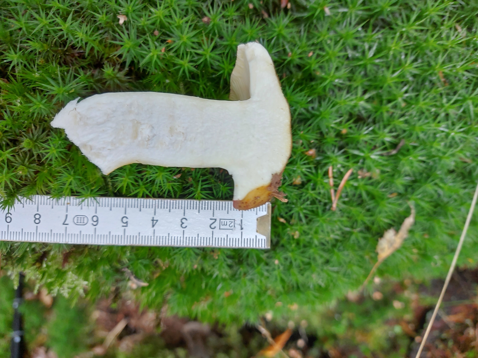 Wenn er sich beim Anritzen mit dem Fingernagel dann noch gelb verfärbt, könnte man ihn noch als Gelbfelckenden Täubling bestimmen (in Kombination mit der Schärfe und dem weißen Sporenpulver), sonst bleibt es nur beim Speitäubling.