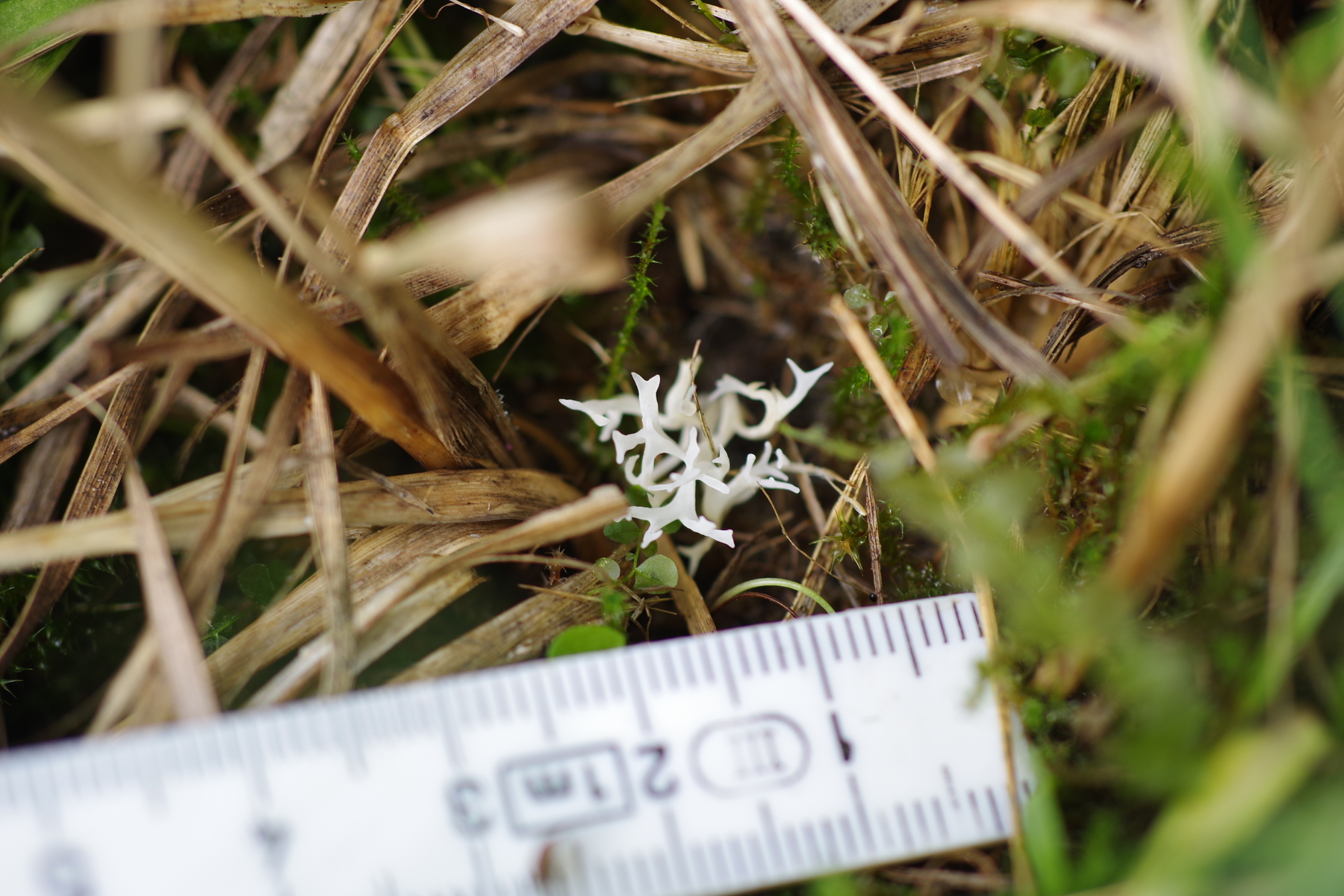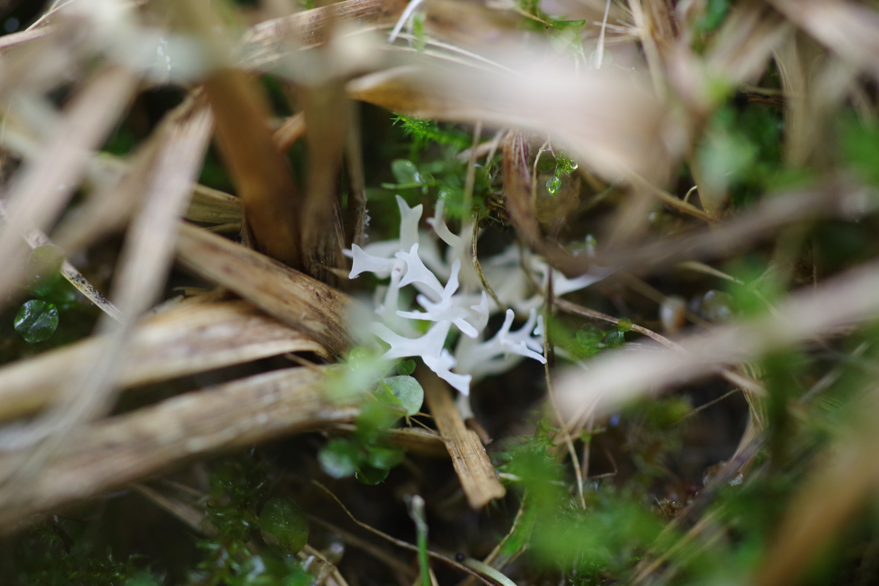 2) ein Einzelstück, eine winzige filigrane weiße Koralle (Ramariopsis sp.)