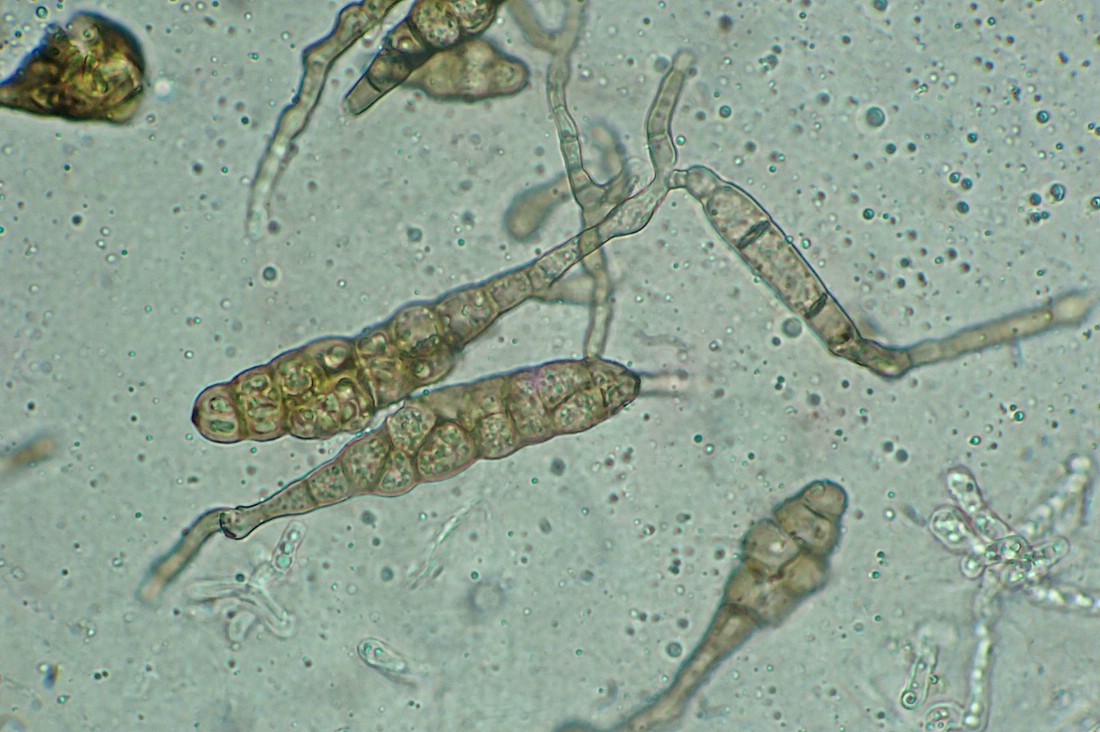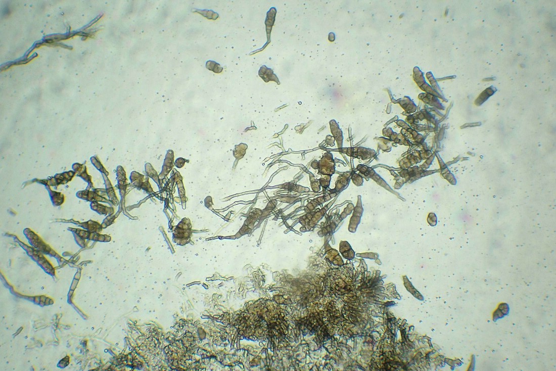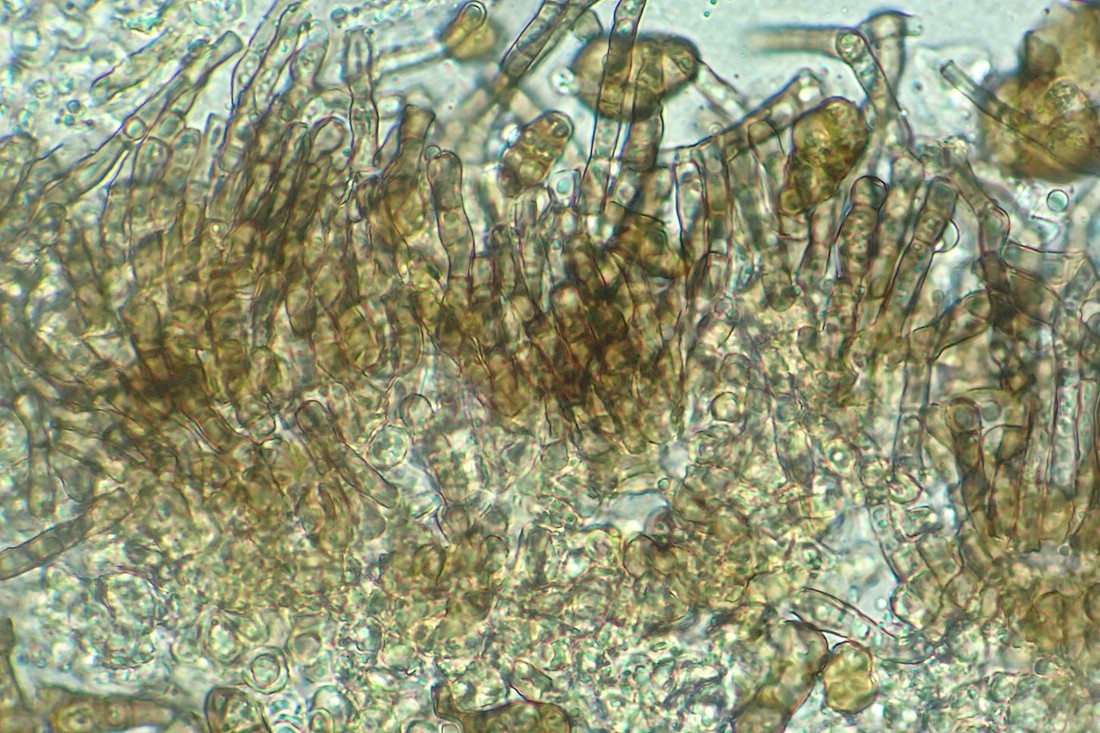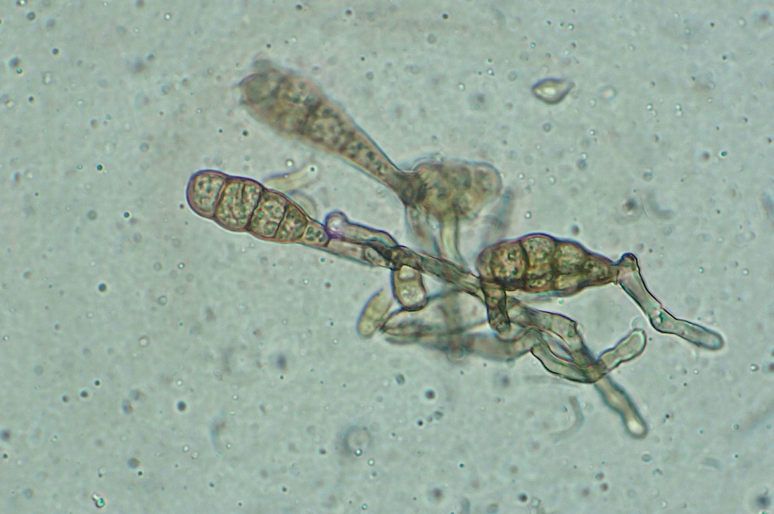 Mikroskopisch waren die 5 bis 9-fach querseptierten goldgelben Sporen mit je einem Längsseptum auffällig.