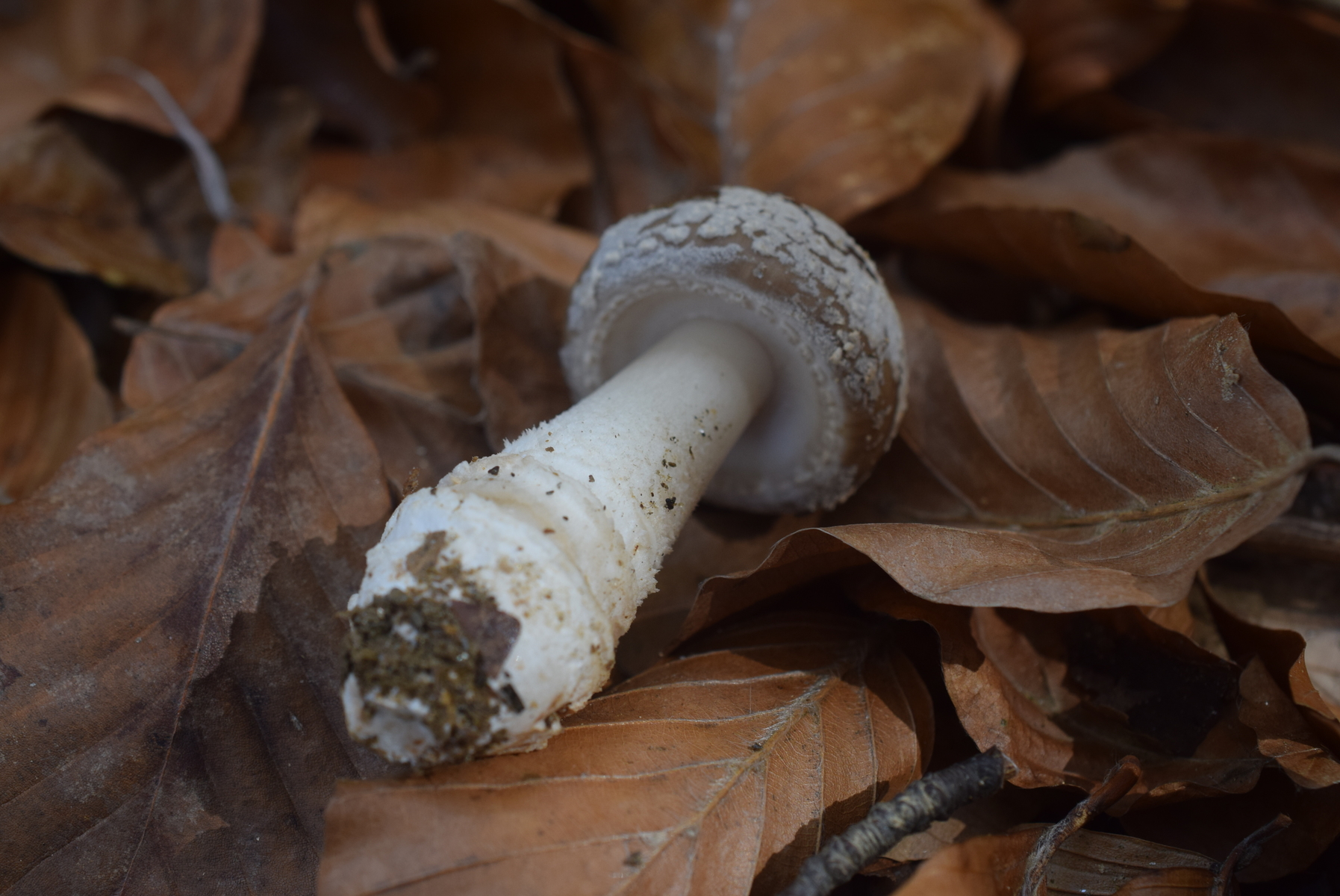 • Folgendes Baby habe ich heute in einem kleinen Waldstück mit Buchen und Eichen entdeckt. Unter der aufgebrochenen Gesamthülle ist so eine gallertartige Schicht wie ich sie vom Hexenei der Stinkmorchel kenne, aber dieser Pilz sieht mir eher nach grauem Wulstling aus. Haben Wulstlinge im sehr jungem Stadium auch so eine „Glibberhülle“?