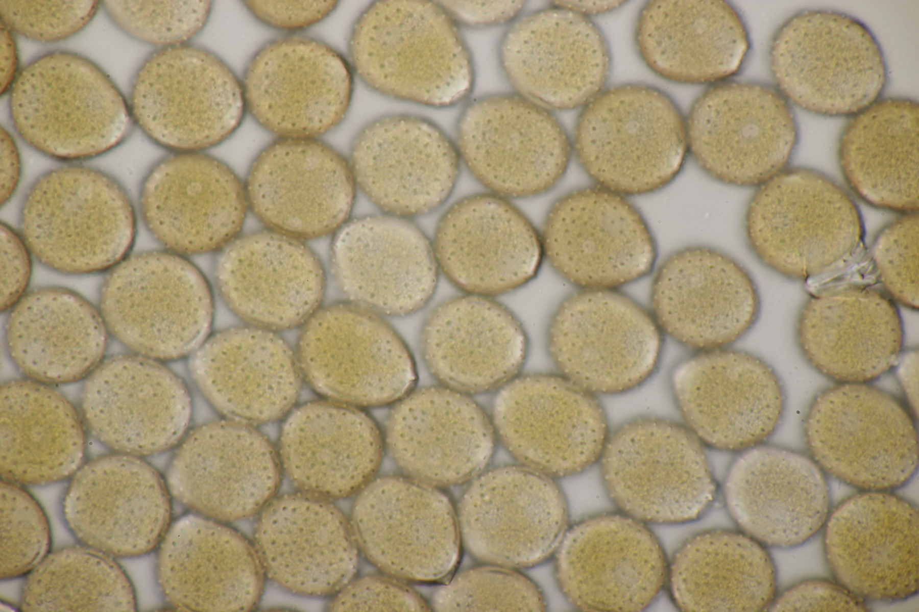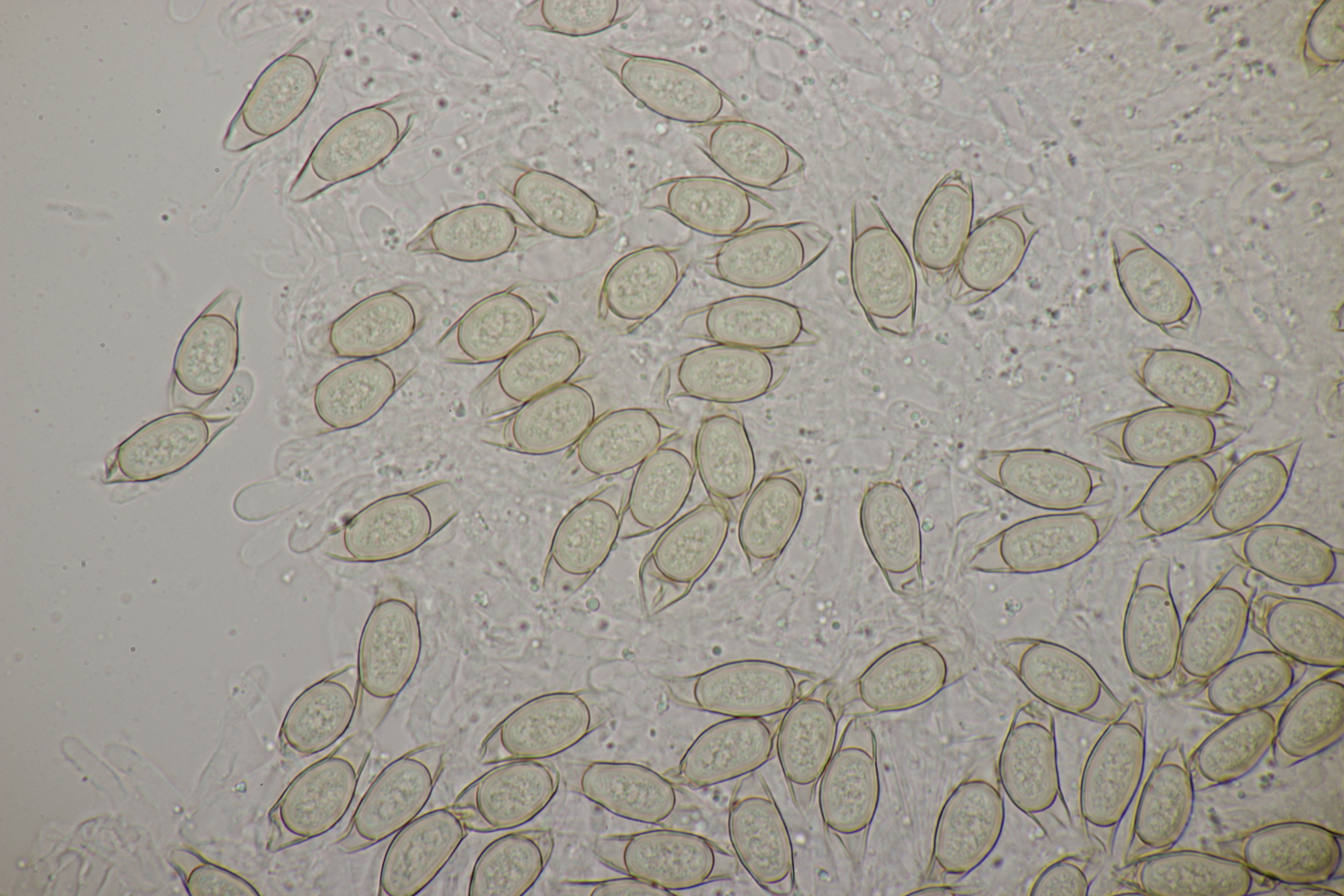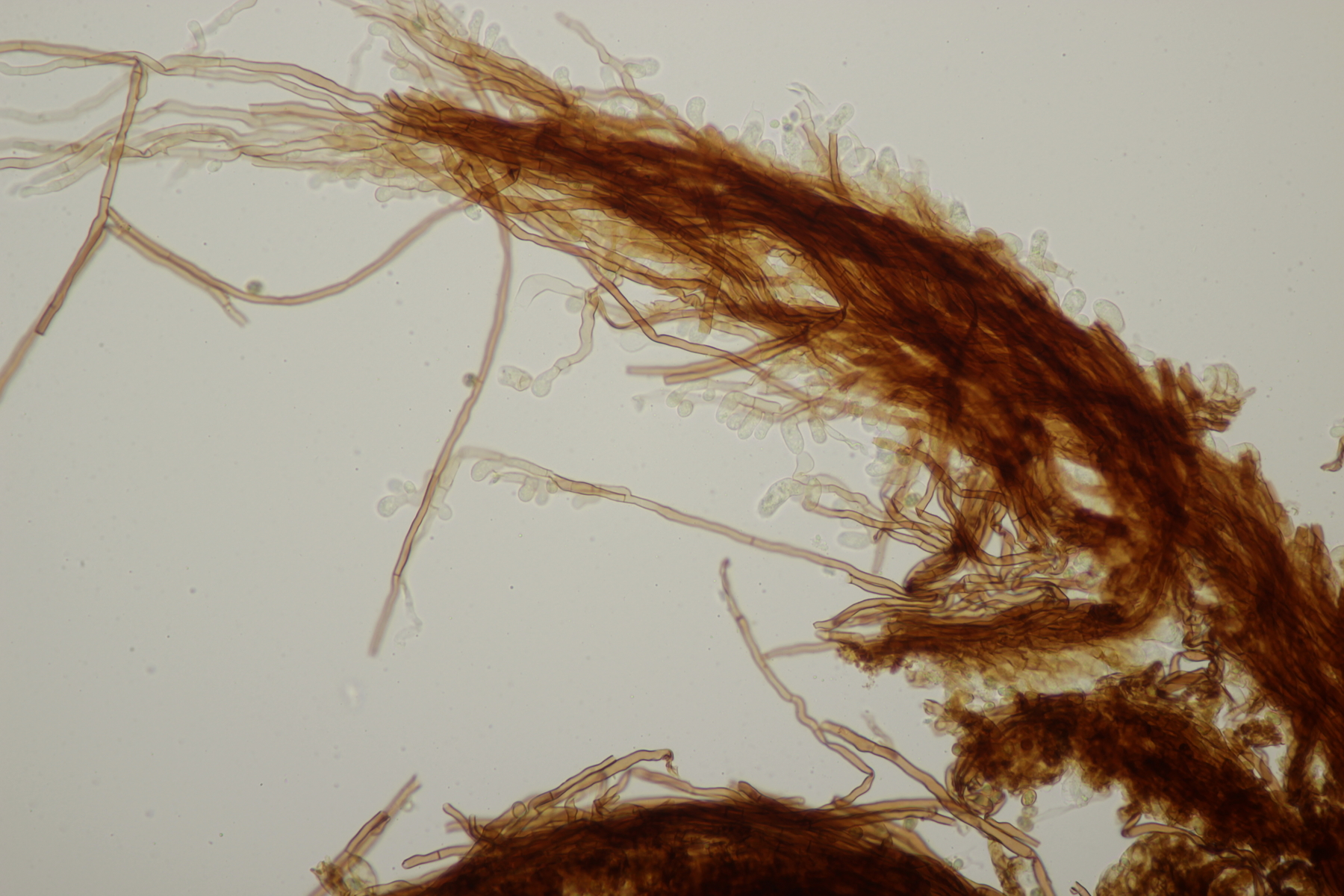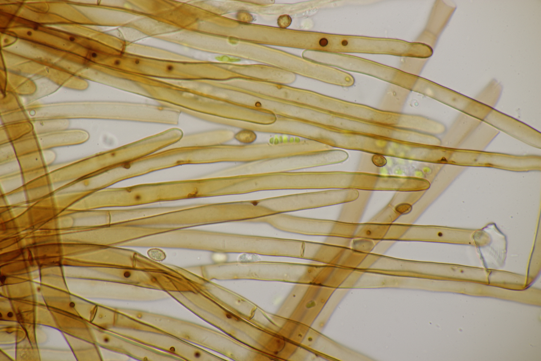 13. Dann gab es da noch eine Coltricia von der ich leider kein Makrofoto habe. Auffallend war aber, daß die Hutoberseite wie ein Tigerauge (der Edelstein) schillerte. Sporen messen (7.5+-0.5) µm x (5.3+-0.4) µm, Q=1.4+-0.1, bzw. (6.6-8.4) µm x (4.3-6.4) µm, Q=1.2-1.6. Die Huthaut besteht mikroskopisch nur aus glatten Hyphen. Wenn ich mit dem neuen Polypores-Band von Bernicchia schlüssele, lande ich dann bei C. cinnamomea. Was meint ihr dazu?