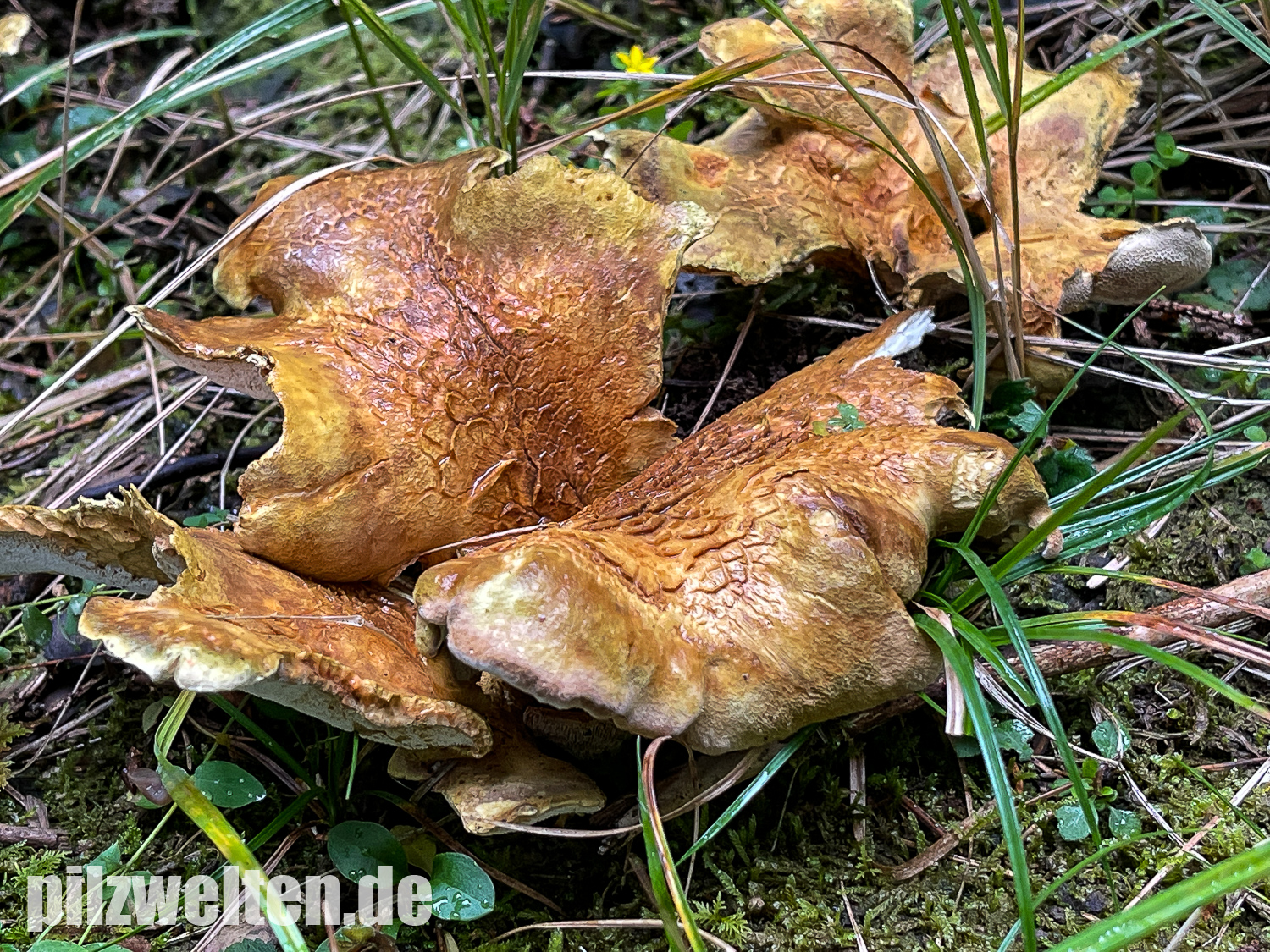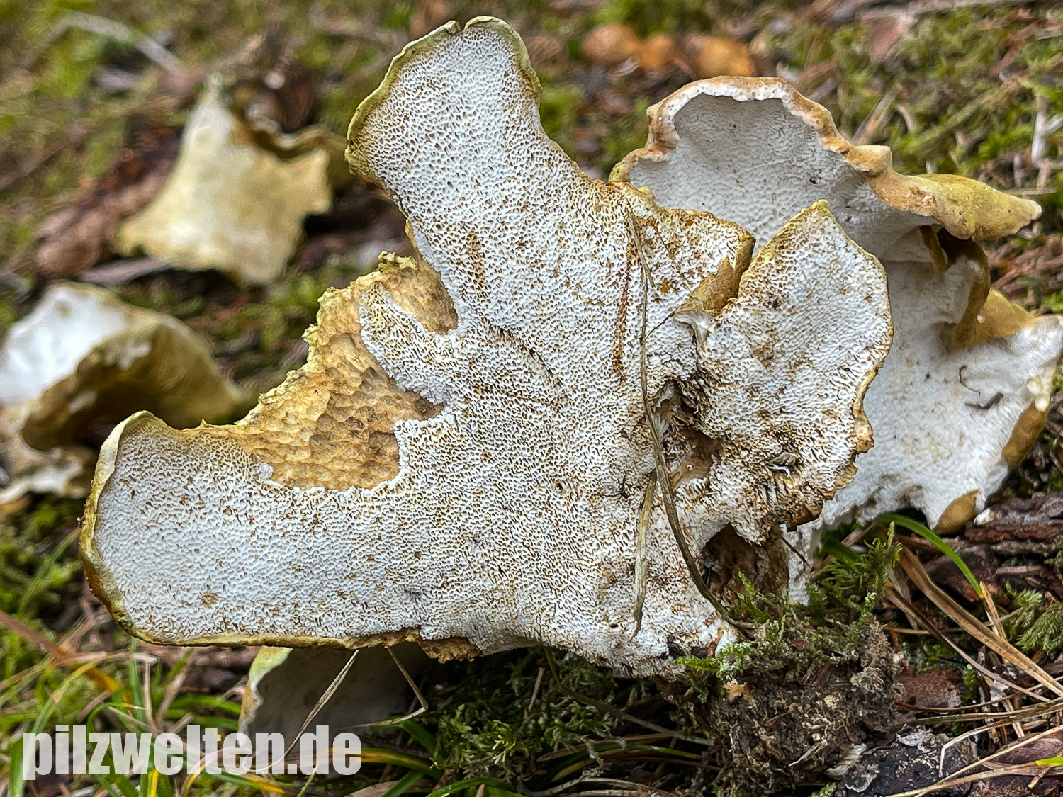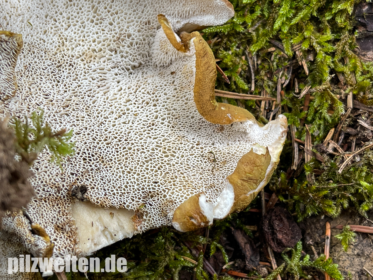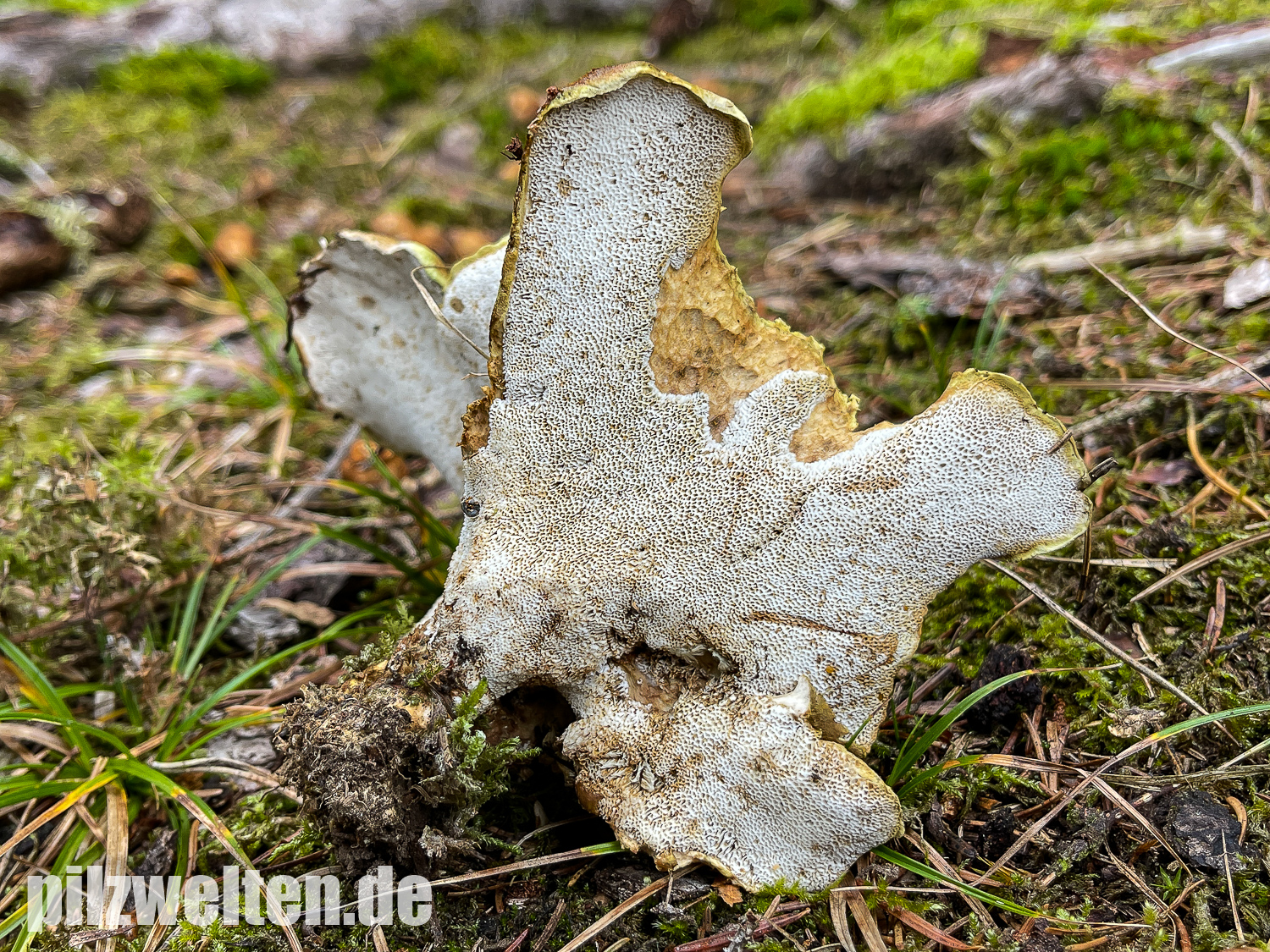 den folgenden Porlingsfund konnten wir im reinen Nadelwald machen. Wuchs dort mit zahlreichen Fruchtkörpern an einem sehr trockenen Südhang bei Kiefern, Fichten & Tannen. Wegen der gelben Farbe haben wir uns im Eck um Albatrellus citrinus umgesehen, aber mit "am boden wachsenden Porlingen" haben wir noch gar keine Erfahrung gemacht. Uns ist in all den Jahren nicht ein Fund in die Richtung in unseren Wäldern untergekommen - umso gespannter sind wir natürlich, ob sich dazu anhand der Bilder vielleicht was sagen lässt?