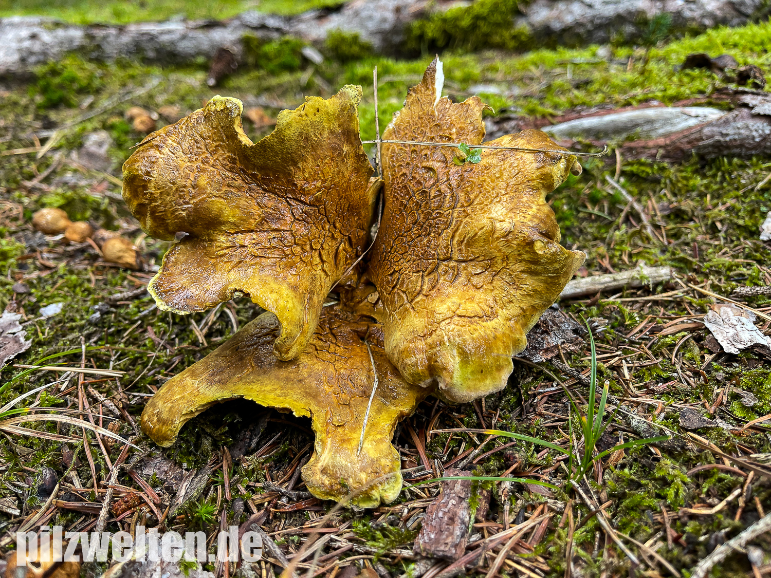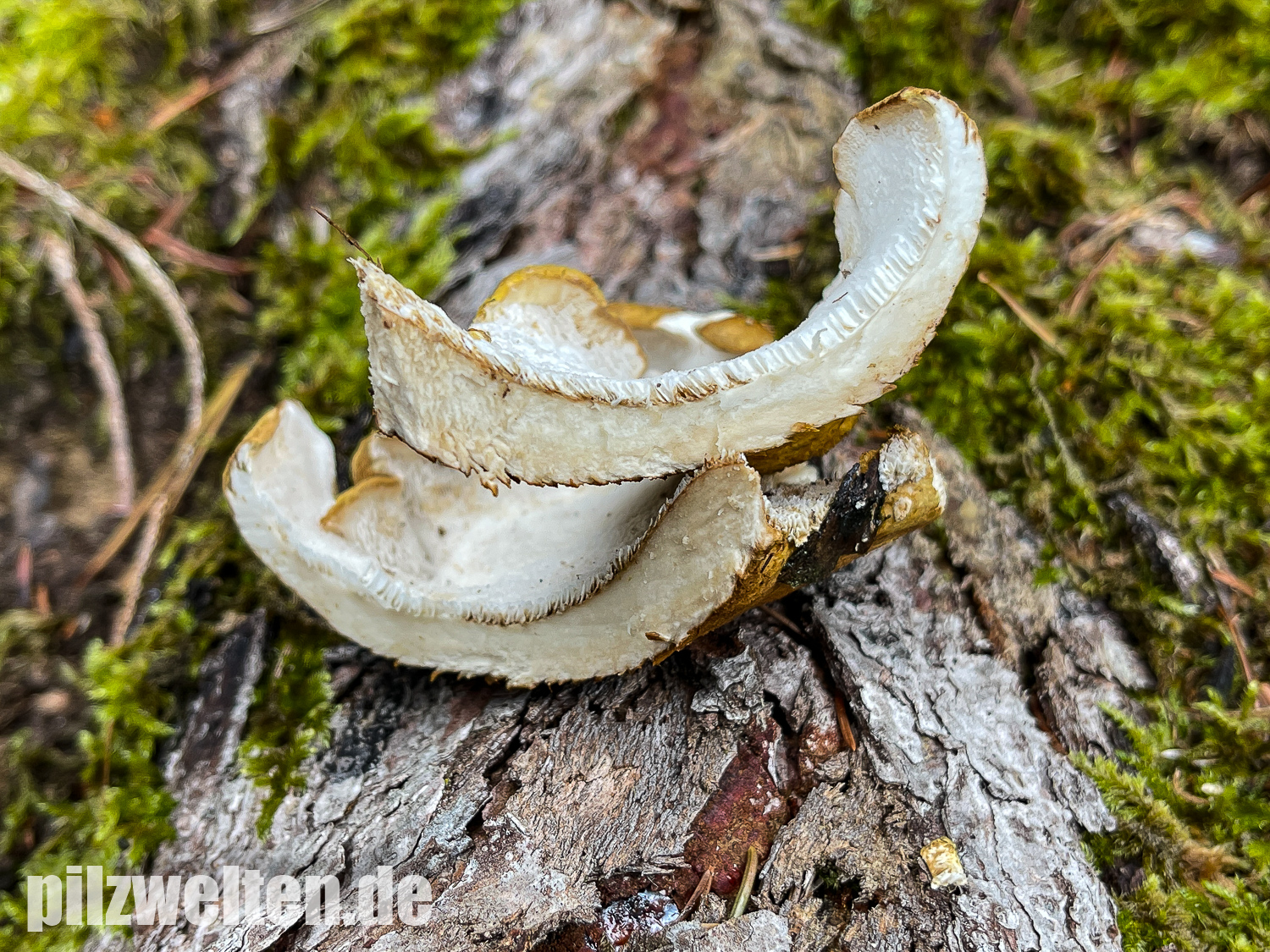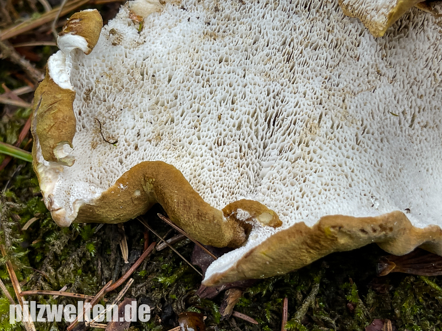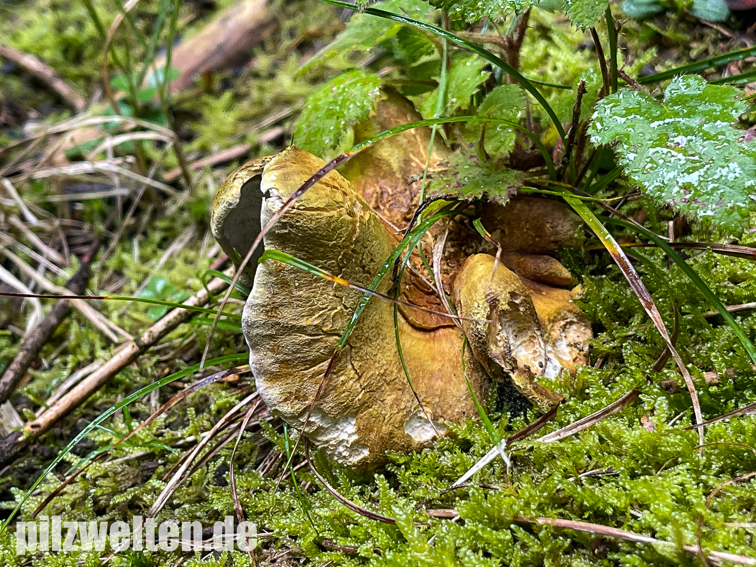 den folgenden Porlingsfund konnten wir im reinen Nadelwald machen. Wuchs dort mit zahlreichen Fruchtkörpern an einem sehr trockenen Südhang bei Kiefern, Fichten & Tannen. Wegen der gelben Farbe haben wir uns im Eck um Albatrellus citrinus umgesehen, aber mit "am boden wachsenden Porlingen" haben wir noch gar keine Erfahrung gemacht. Uns ist in all den Jahren nicht ein Fund in die Richtung in unseren Wäldern untergekommen - umso gespannter sind wir natürlich, ob sich dazu anhand der Bilder vielleicht was sagen lässt?
