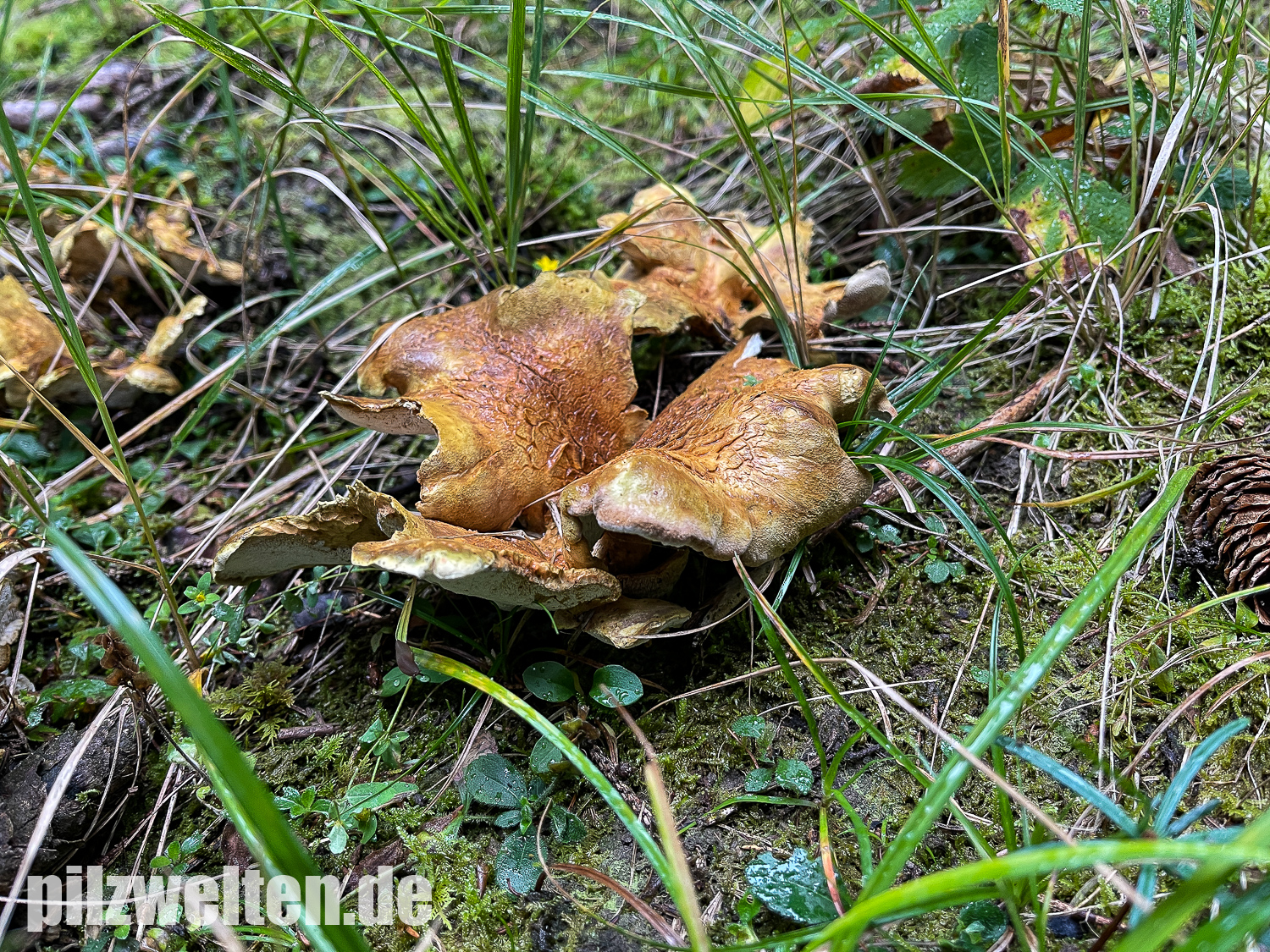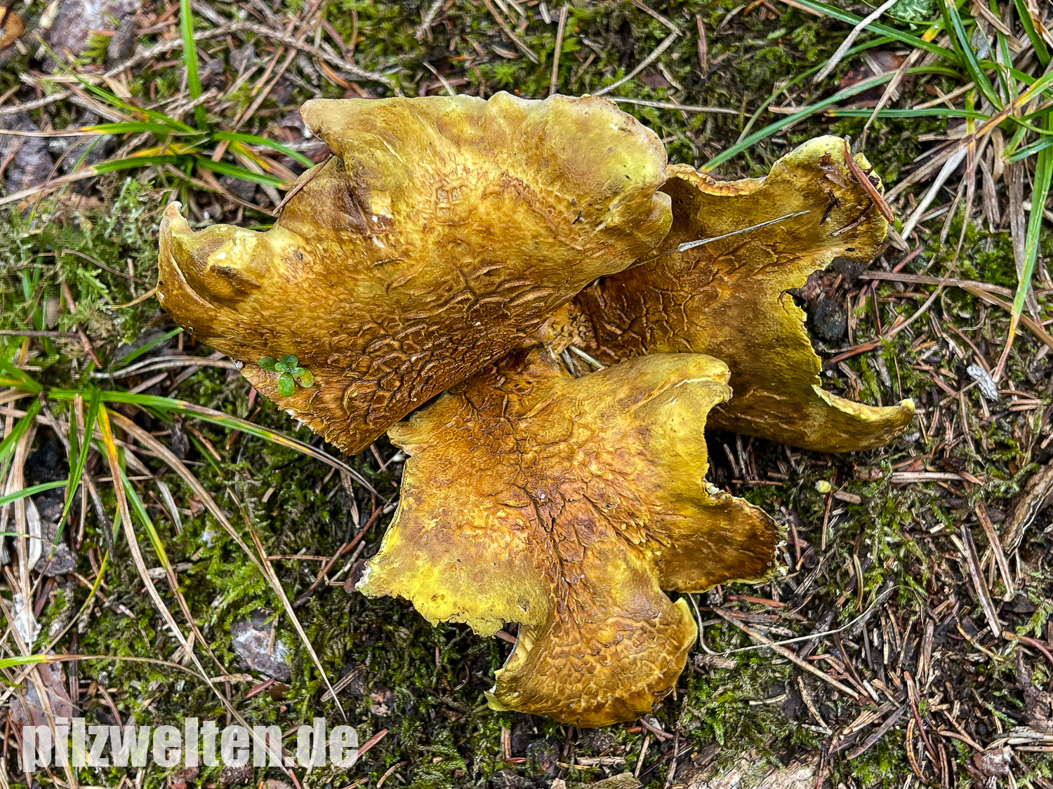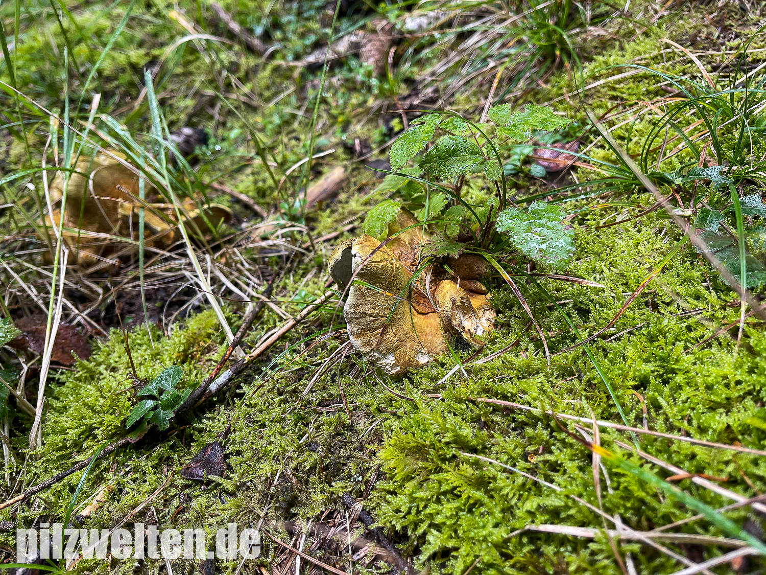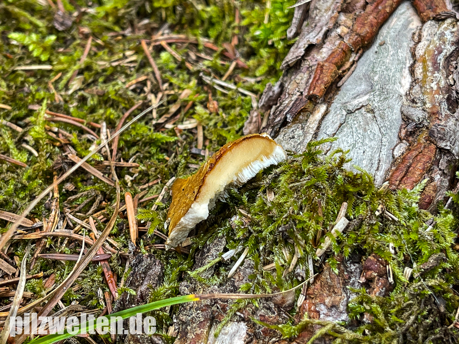 den folgenden Porlingsfund konnten wir im reinen Nadelwald machen. Wuchs dort mit zahlreichen Fruchtkörpern an einem sehr trockenen Südhang bei Kiefern, Fichten & Tannen. Wegen der gelben Farbe haben wir uns im Eck um Albatrellus citrinus umgesehen, aber mit "am boden wachsenden Porlingen" haben wir noch gar keine Erfahrung gemacht. Uns ist in all den Jahren nicht ein Fund in die Richtung in unseren Wäldern untergekommen - umso gespannter sind wir natürlich, ob sich dazu anhand der Bilder vielleicht was sagen lässt?