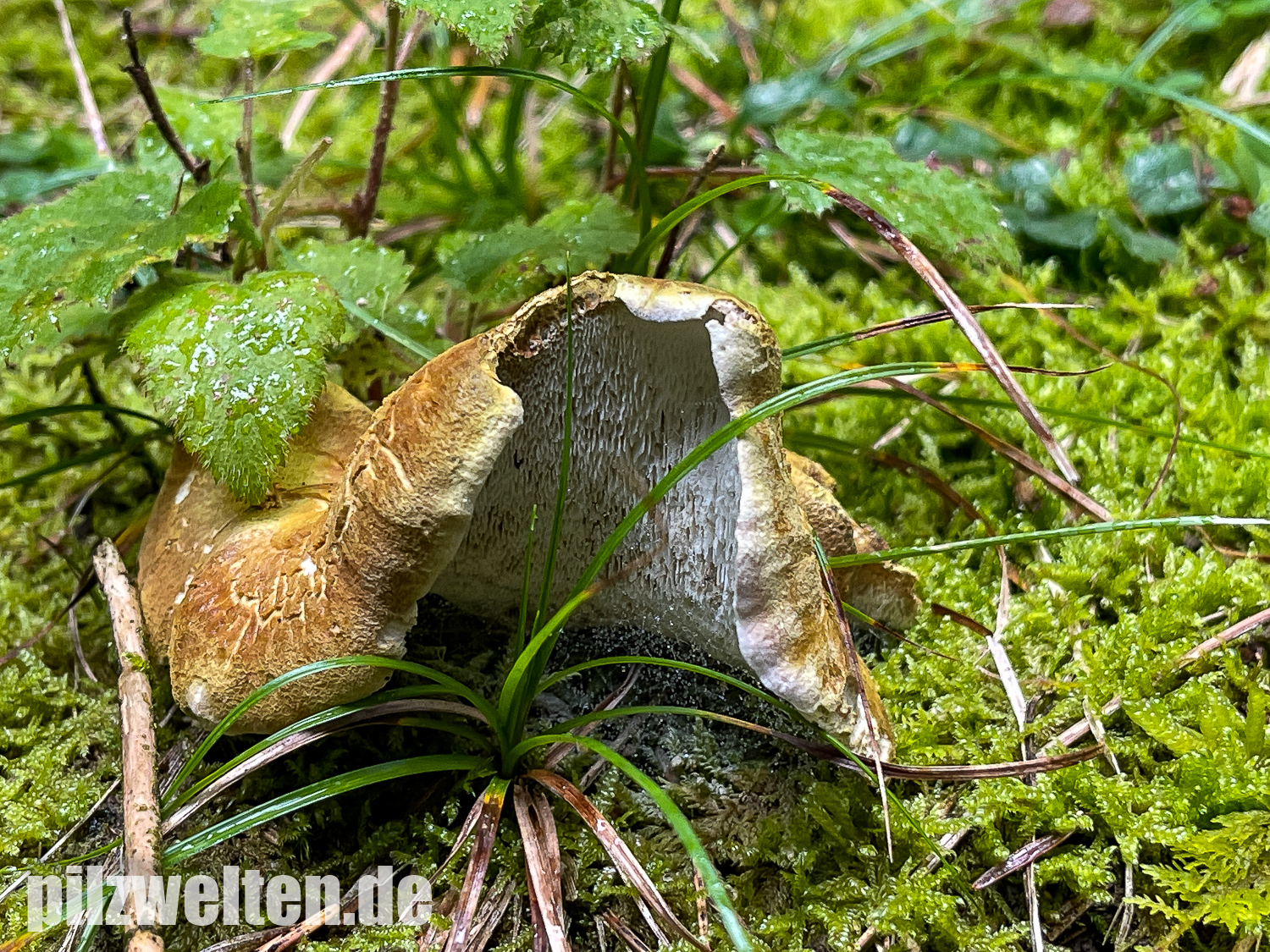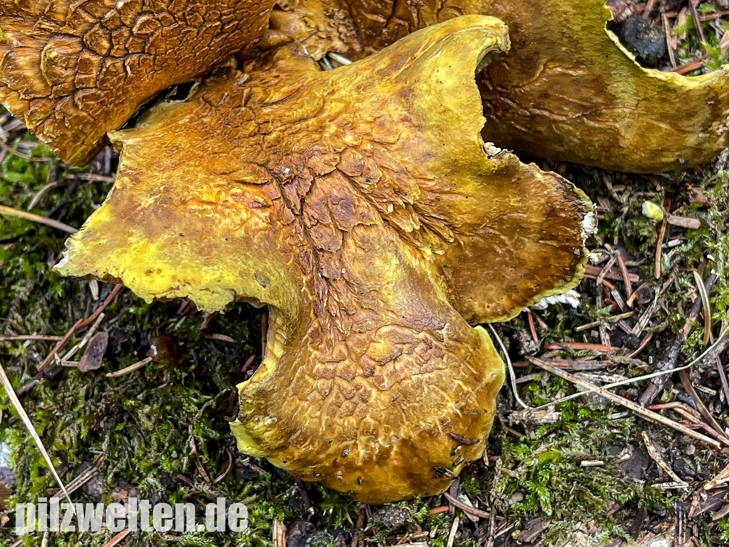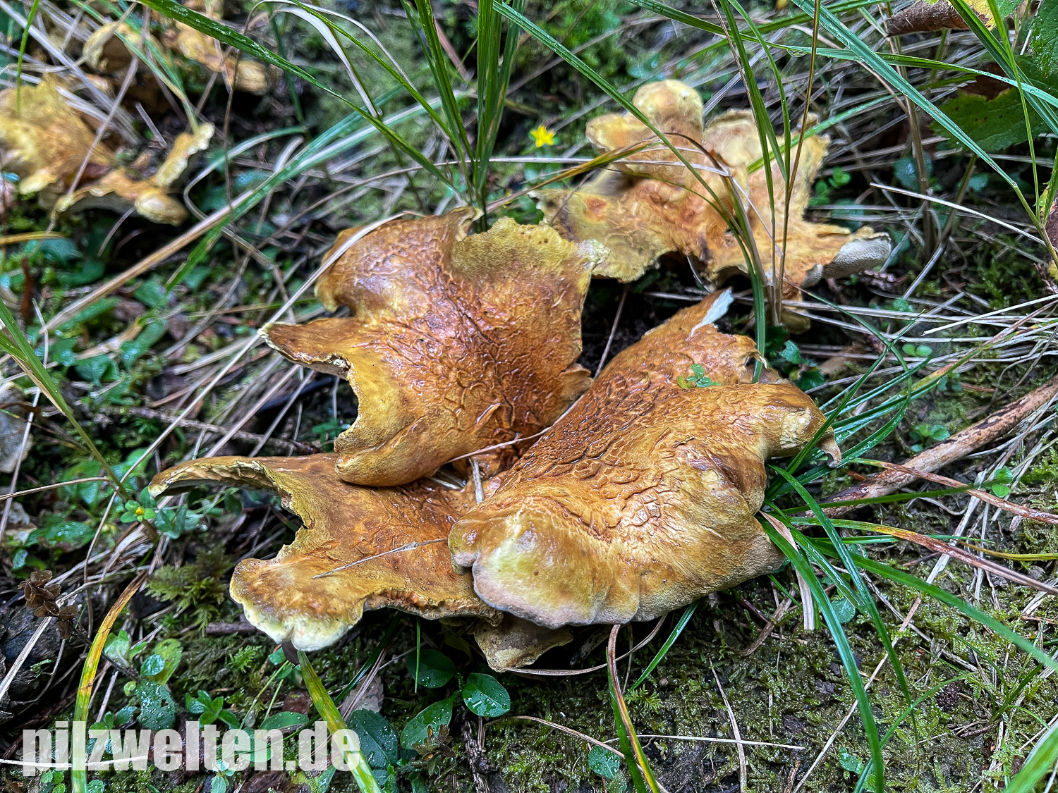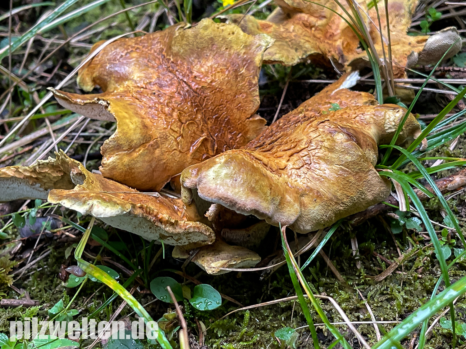 den folgenden Porlingsfund konnten wir im reinen Nadelwald machen. Wuchs dort mit zahlreichen Fruchtkörpern an einem sehr trockenen Südhang bei Kiefern, Fichten & Tannen. Wegen der gelben Farbe haben wir uns im Eck um Albatrellus citrinus umgesehen, aber mit "am boden wachsenden Porlingen" haben wir noch gar keine Erfahrung gemacht. Uns ist in all den Jahren nicht ein Fund in die Richtung in unseren Wäldern untergekommen - umso gespannter sind wir natürlich, ob sich dazu anhand der Bilder vielleicht was sagen lässt?