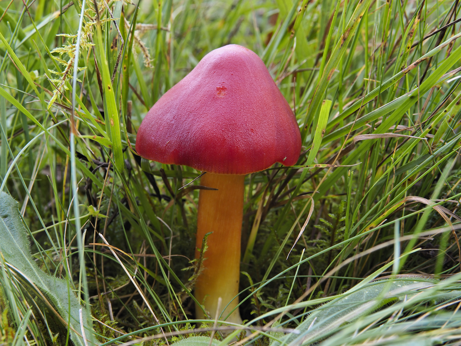 der Farbverlauf am Stiel (oben orange, dann gelb, unten dann weiß) ist ganz typisch für den Granatroten Saftling (H. punicea). H. coccinea ist ein eher schmächtiges Pilzchen.
