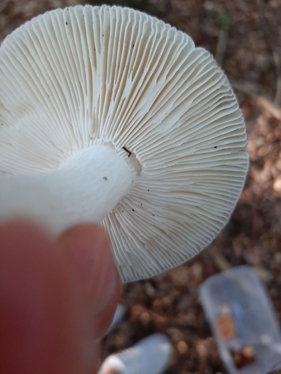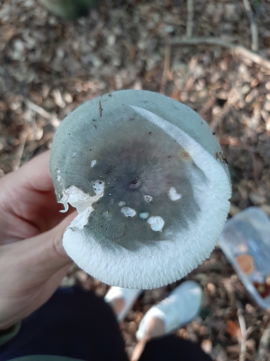 das ist ein Täubling, das ist schonmal sicher. Frauentäublinge erkennst du an verschmierenden Lamellen. Die verschmieren regelrecht. Das meine ich sogar im zweiten Bild zu sehen, wo die Lamellen zur Seite gestrichen sind und sich überlappen. Einfach mehrmals über die Lamellen streichen. Wenn das nicht der Fall sein sollte, dann Tippe ich auch R. parazurea oder einer Griseinae.