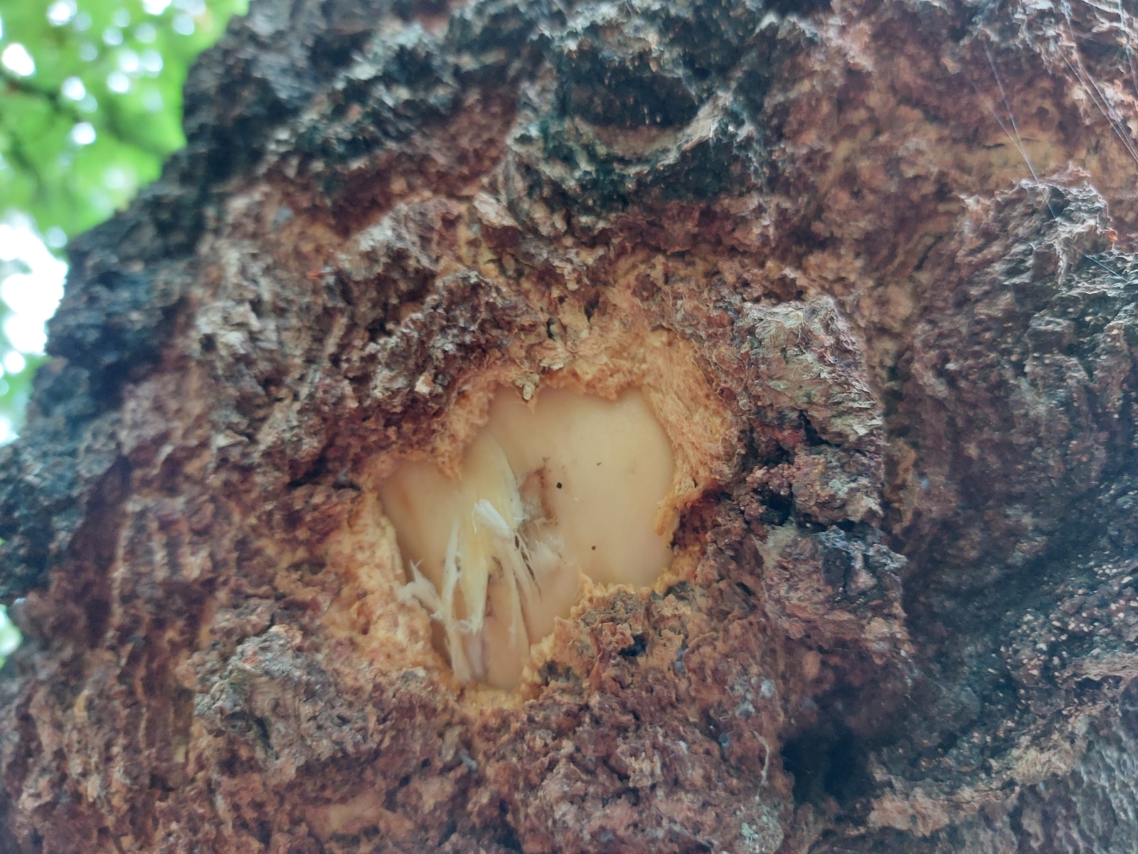 Hier mal ein Bild von einem etwas größeren Chaga der letzten Wochen, die Hauptknolle ist etwa 30*30*30 cm, und setzt sich dann noch etwa 1,5 m in der Verletzung nach oben fort.