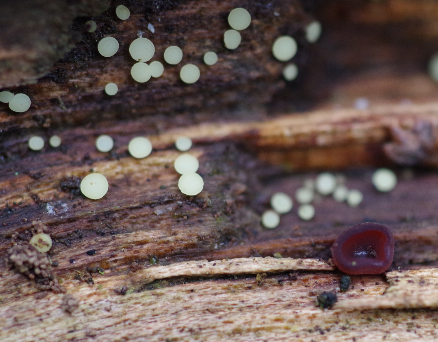 1) dass der grellgelbe Becher Bisporella citrina ist, ist wohl klar, die Frage ist, ob der auch so hell sein kann, oder ob dass eine der Schwesterarten B. pallidens, subpallida sein könnte. Auf Schwarzerle.