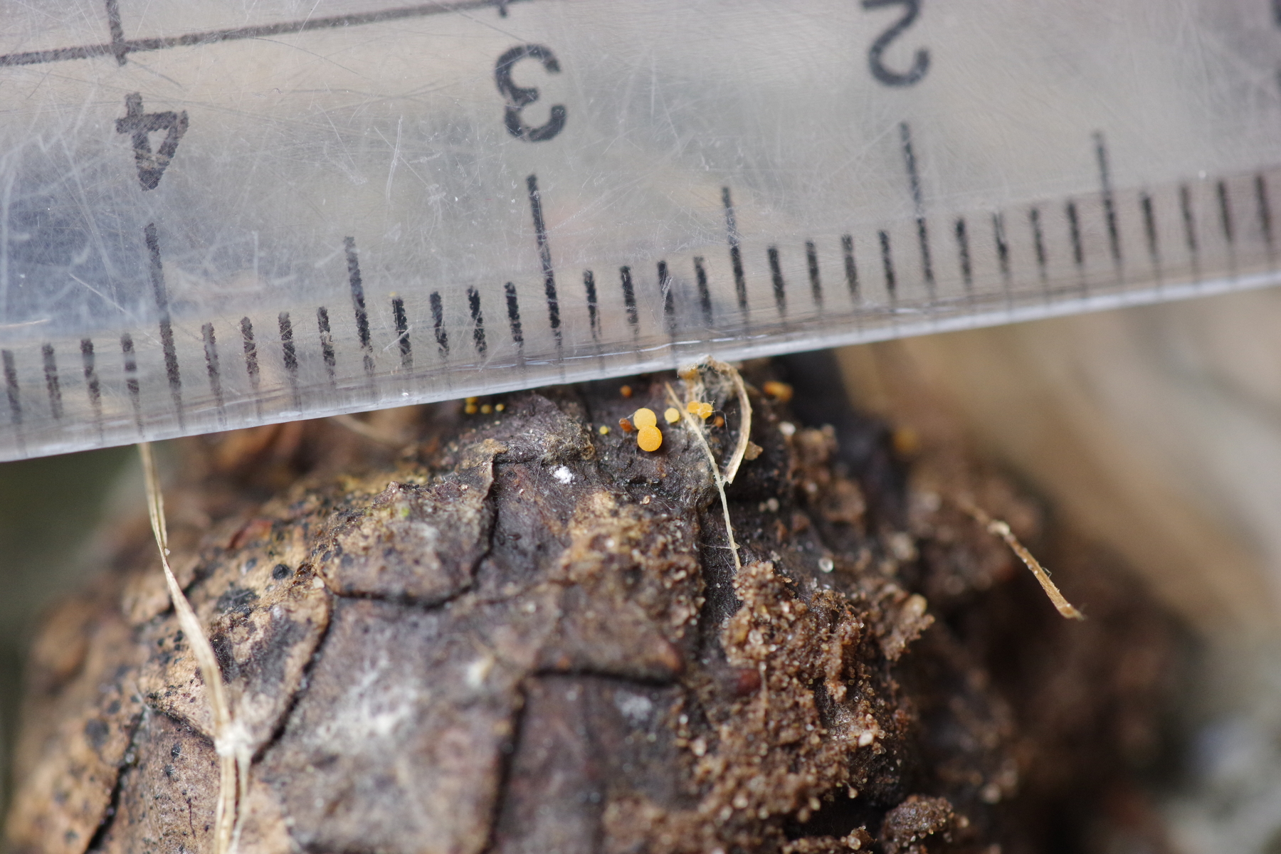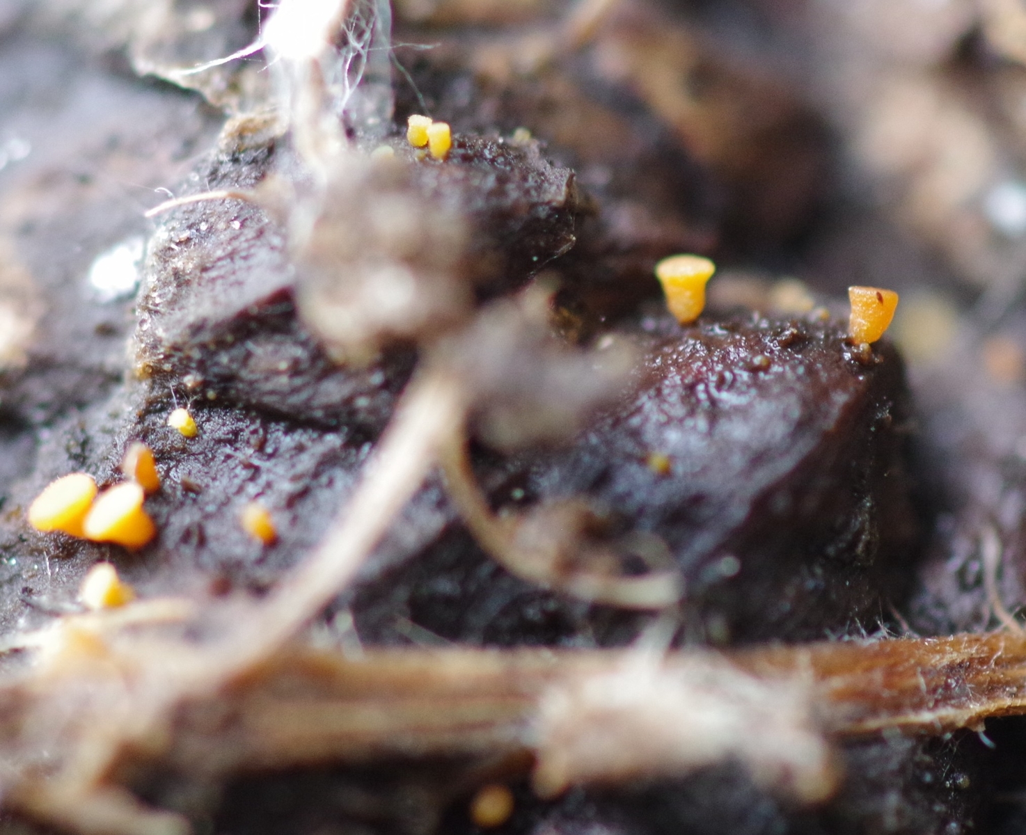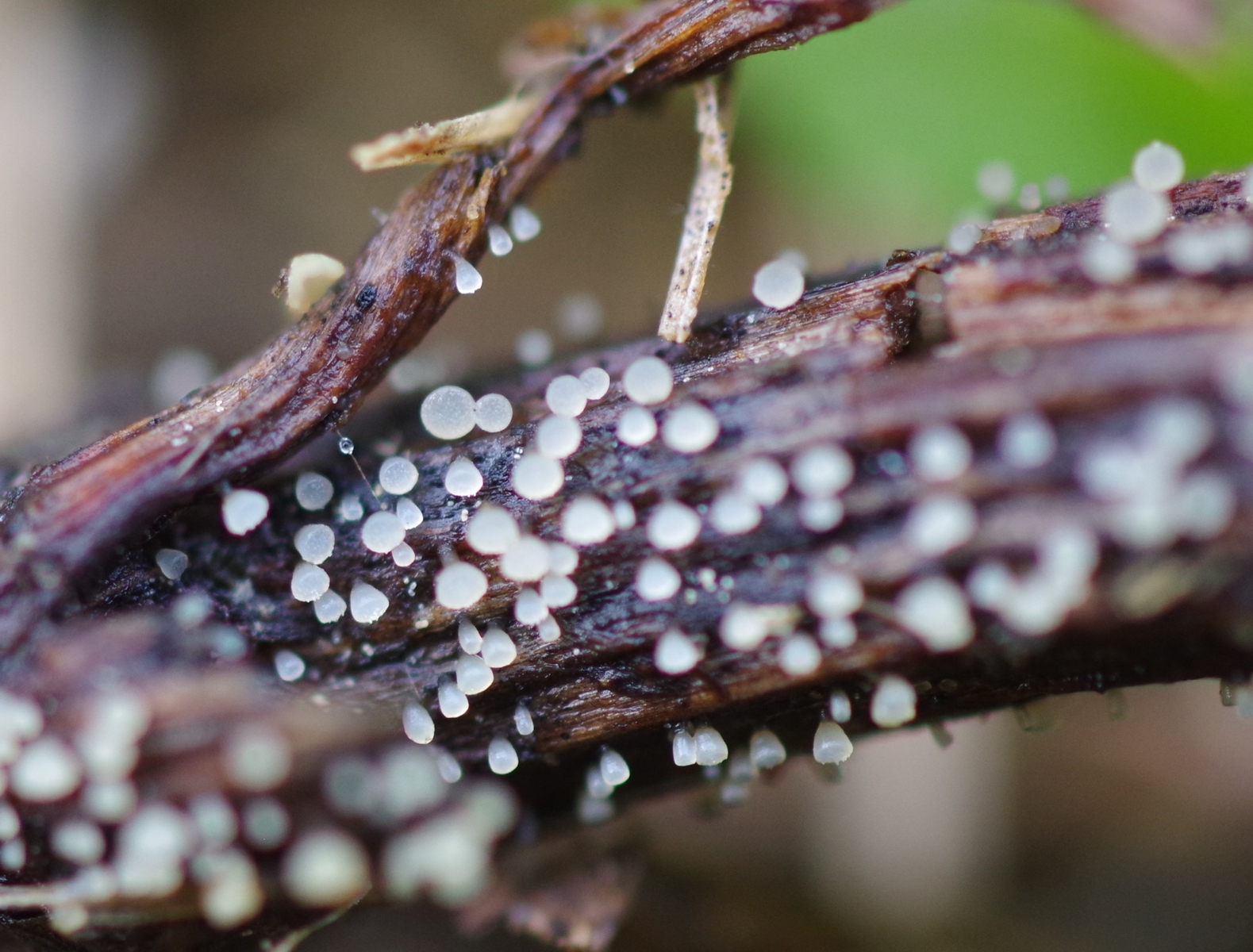 3) weiße winzige Becher an (vor)vorjährigem Schnitt auf der Weide, der Halm hat einen Durchmesser von etwa 4 mm