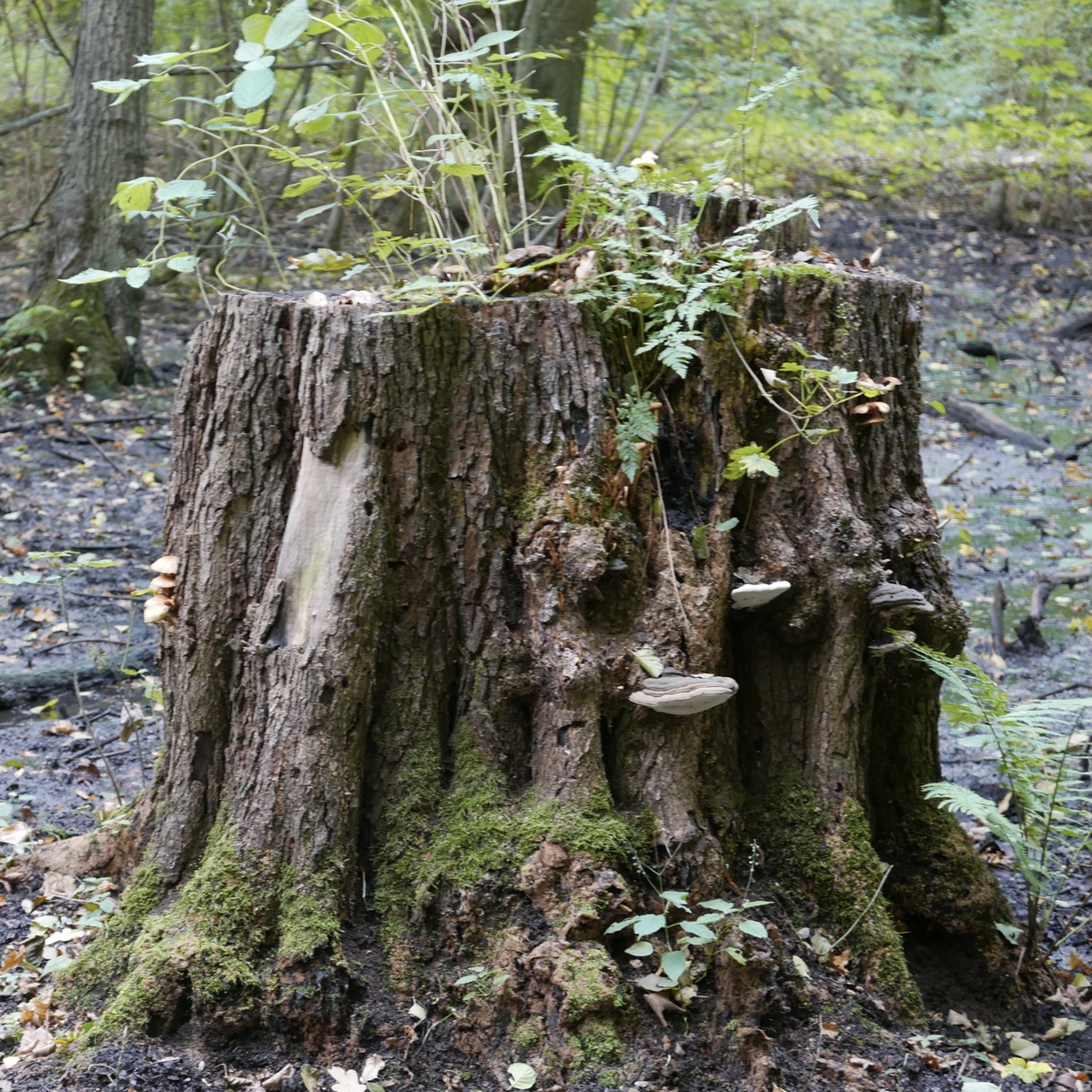 0. Zuerst begrüßt mich am Fahrradabstellplatz immer dieser bewachsene Baumstumpf, unerreichbar mitten im Morast