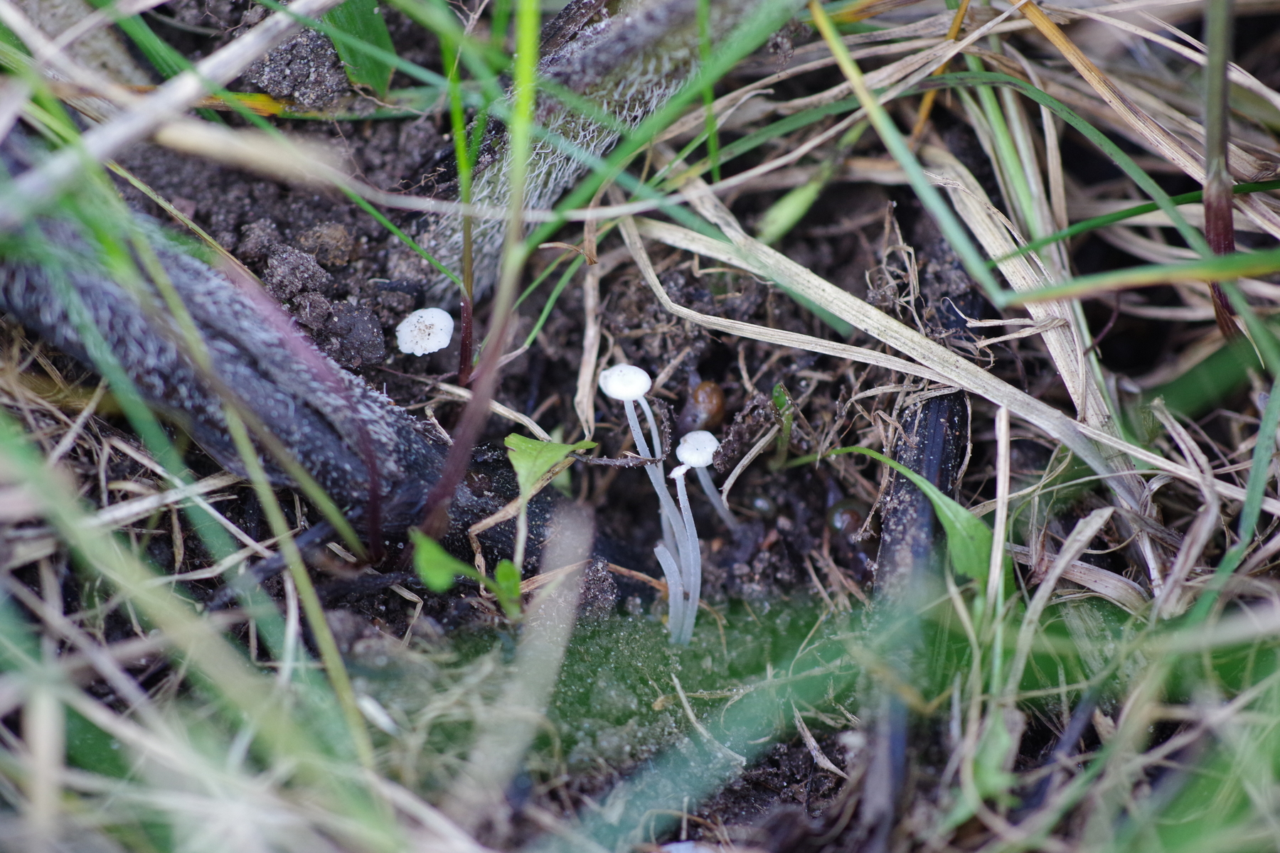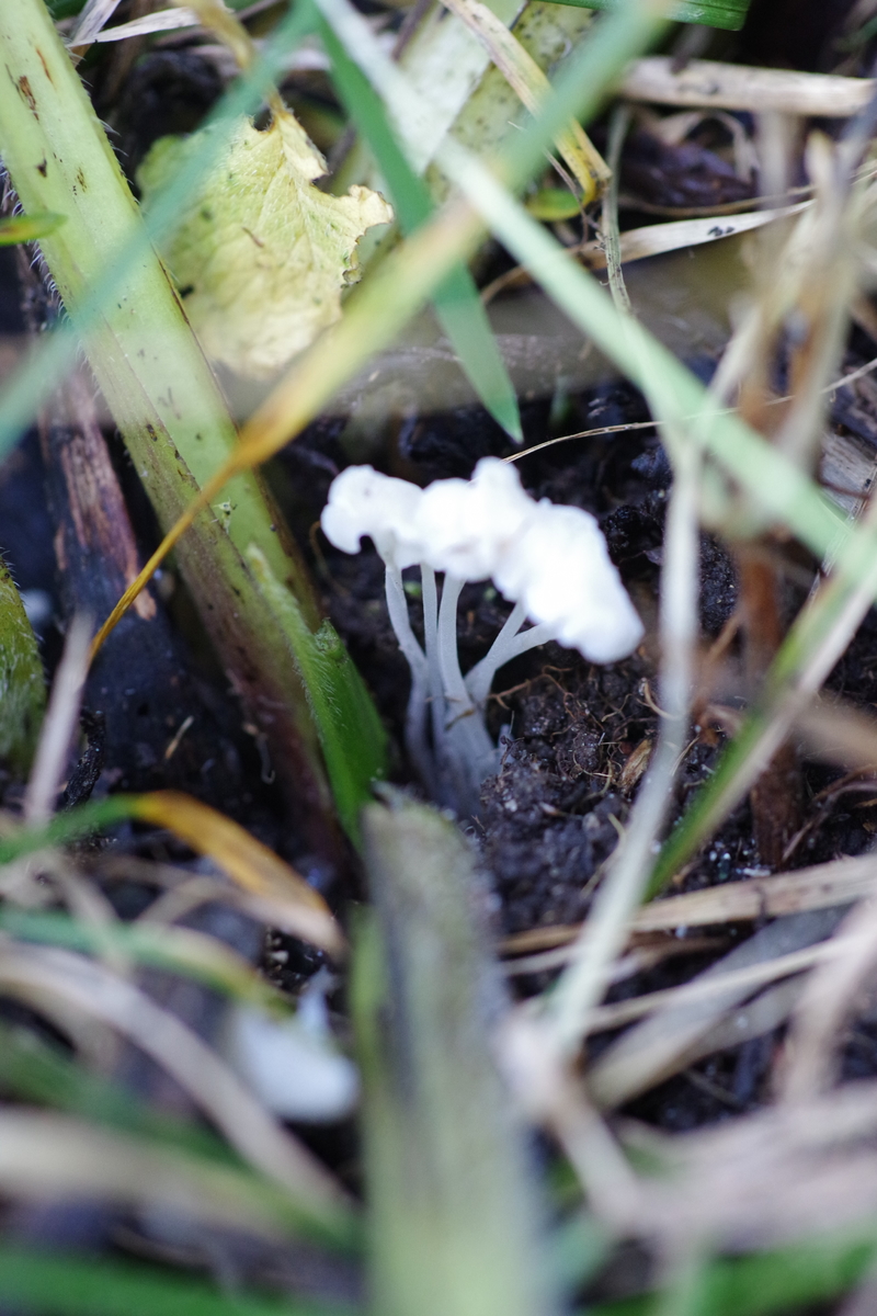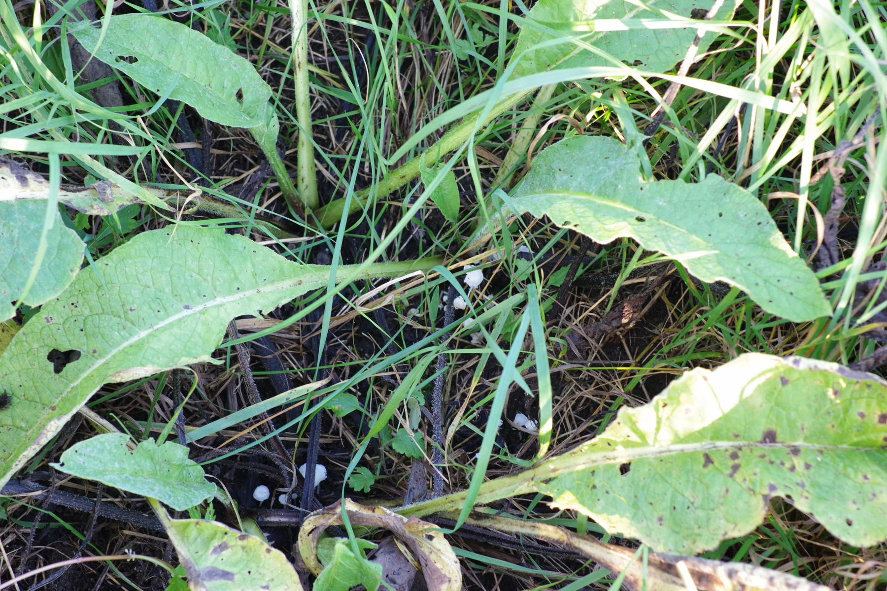 auf der Wiese wächst an fetteren Stellen auch reichlich Beinwell. Am Stielansatz ist fast überall dieser kleine weiße Pilz, der schnecklingsartig daherkommt zu sehen. Jetzt vermute ich aber, dass es sich um Atheniella delectabilis handeln könnte. Beim Geruch ist mir nichts aufgefallen, aber dazu muss man wohl auch ein ganzes Büschel pflücken. Beim Geschmack bleibt ein seifiger Nachklapp. Größe so bis 12 mm. Wachstum teils im Cluster.