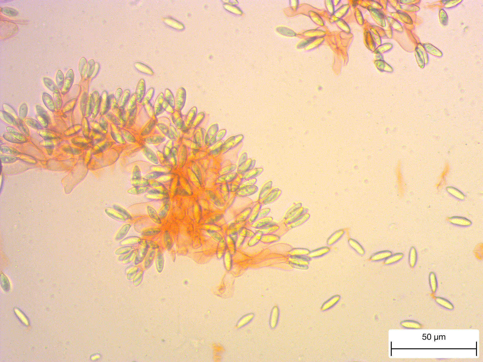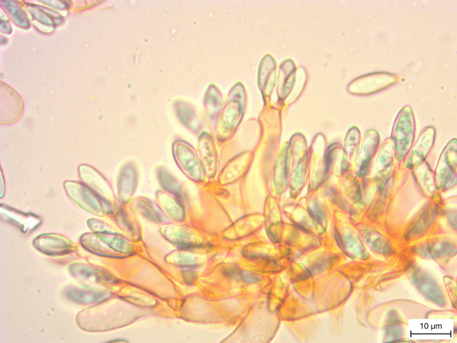 Es handelt sich um Basidiomyceten mit jeweils vier auffällig angewachsenen Sporen. Der Apiculus wirkt sehr dick und wie abgebrochen.