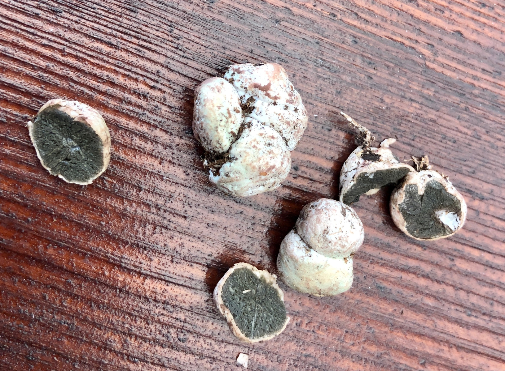 eine Pilzfreundin brachte kleine, rundliche, weiße Fruchtkörper mit, die noch niemand aus unserer Saalfeld-Rudolstädter Pilzgruppe gesehen hatte. Sie standen an einer uralten Buche. Ich hab sie mir mit den scharfen Augen angesehen. Vielleicht sind es Wurzeltrüffel? Kann jemand den Verdacht bestätigen und hat jemand einen Namen für diese kleinen Pilze?