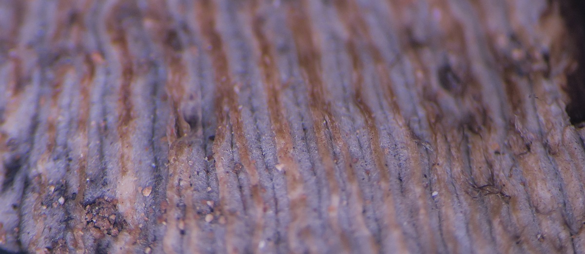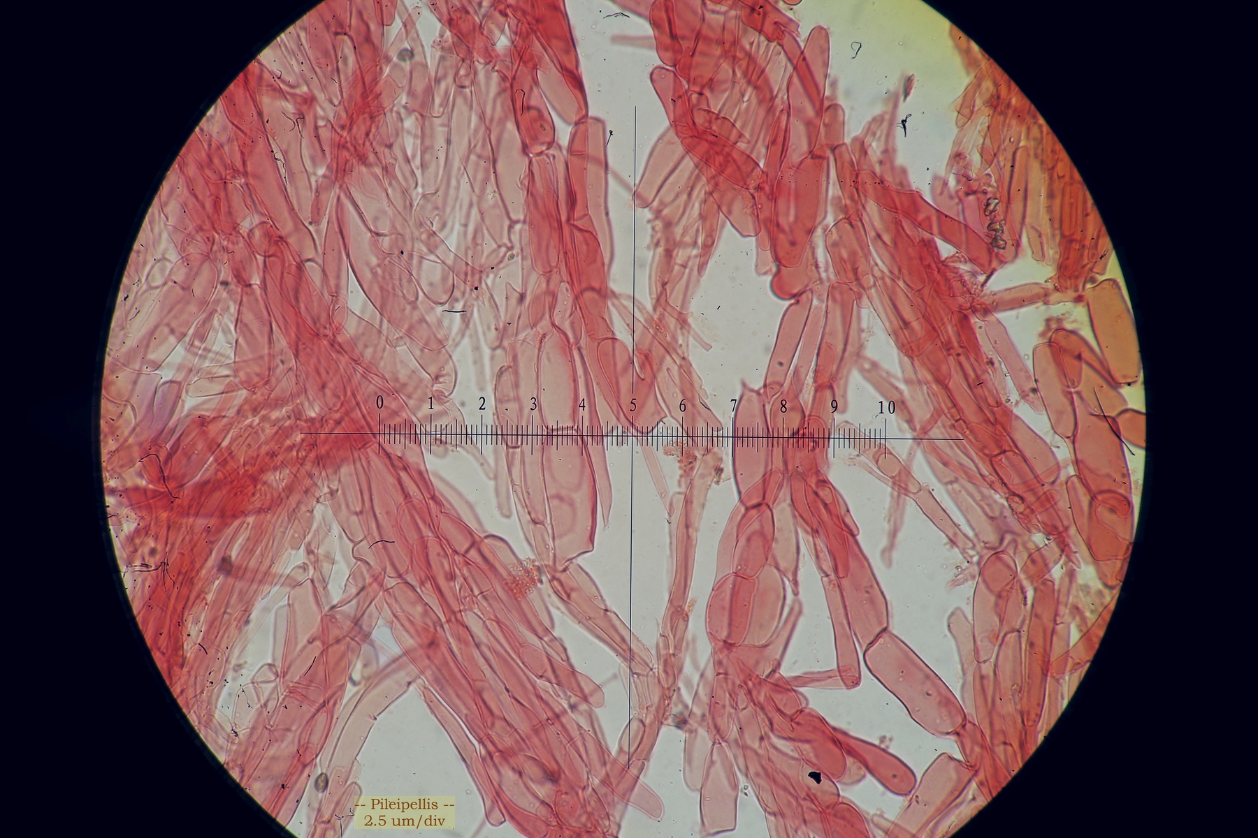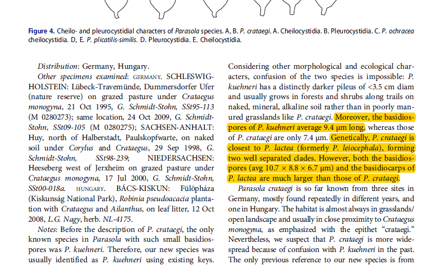 First of all, a strange character is the presence of pubescence especially at the base of the stipe (I am used to glabrous stipes for Parasola). Next the pileus lacked the typical thick-walled setae (see images) but there was some kind of hyphae forming free fibrillose tufts on the pileus. The pileus was ribbed, with the ribs being brownish and the furrows being grey. The exsiccata has lost its basidia and most cheilocystidia since the edges had eroded/deliquesced, but I managed to see two large spherical bodies which might represent cheilo-or pleurocystidia, but since being globular, they might be something else. The pileipellis consisted of not very long rectangular to cylindrical hyphae, with truncated ends, sometimes a small branch (foot) and with some pigmented (?) incrustations. The following sizes were measured:
