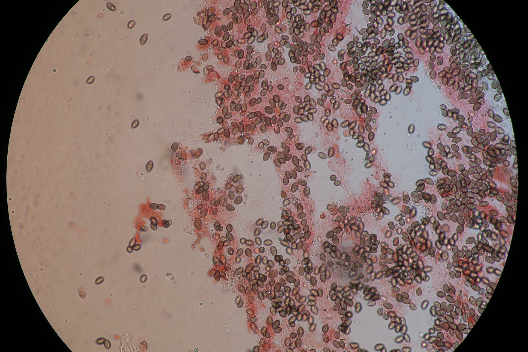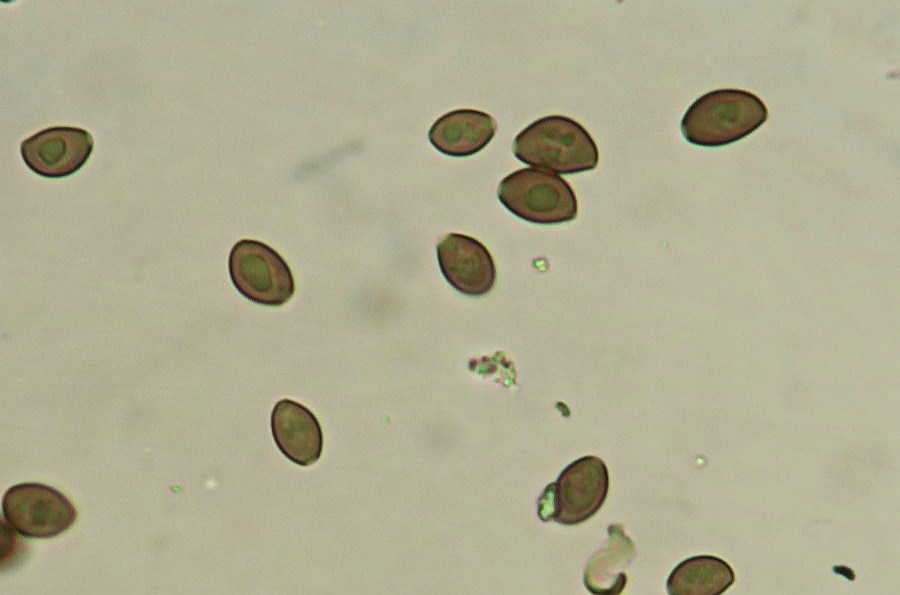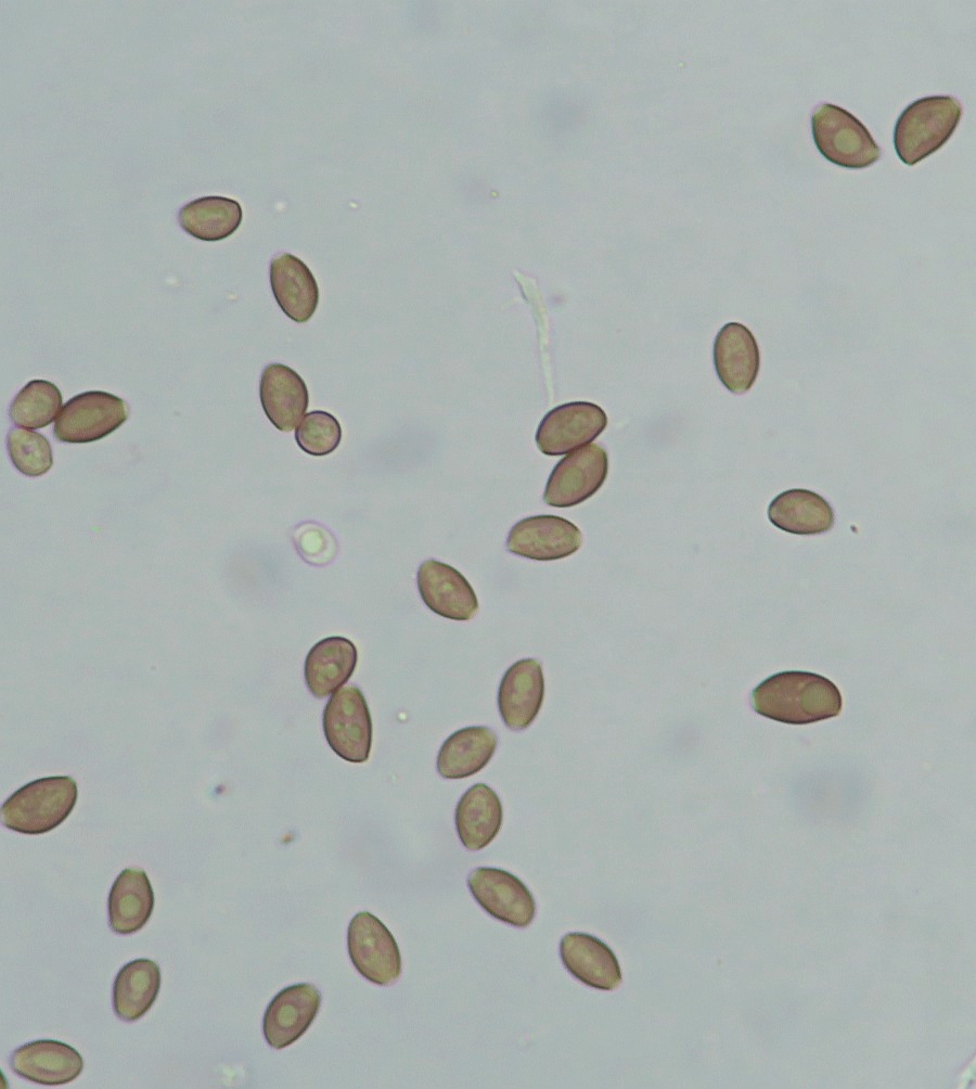 The spores are ovoid or almond shaped (depending the plane of view) with a distinct germpore