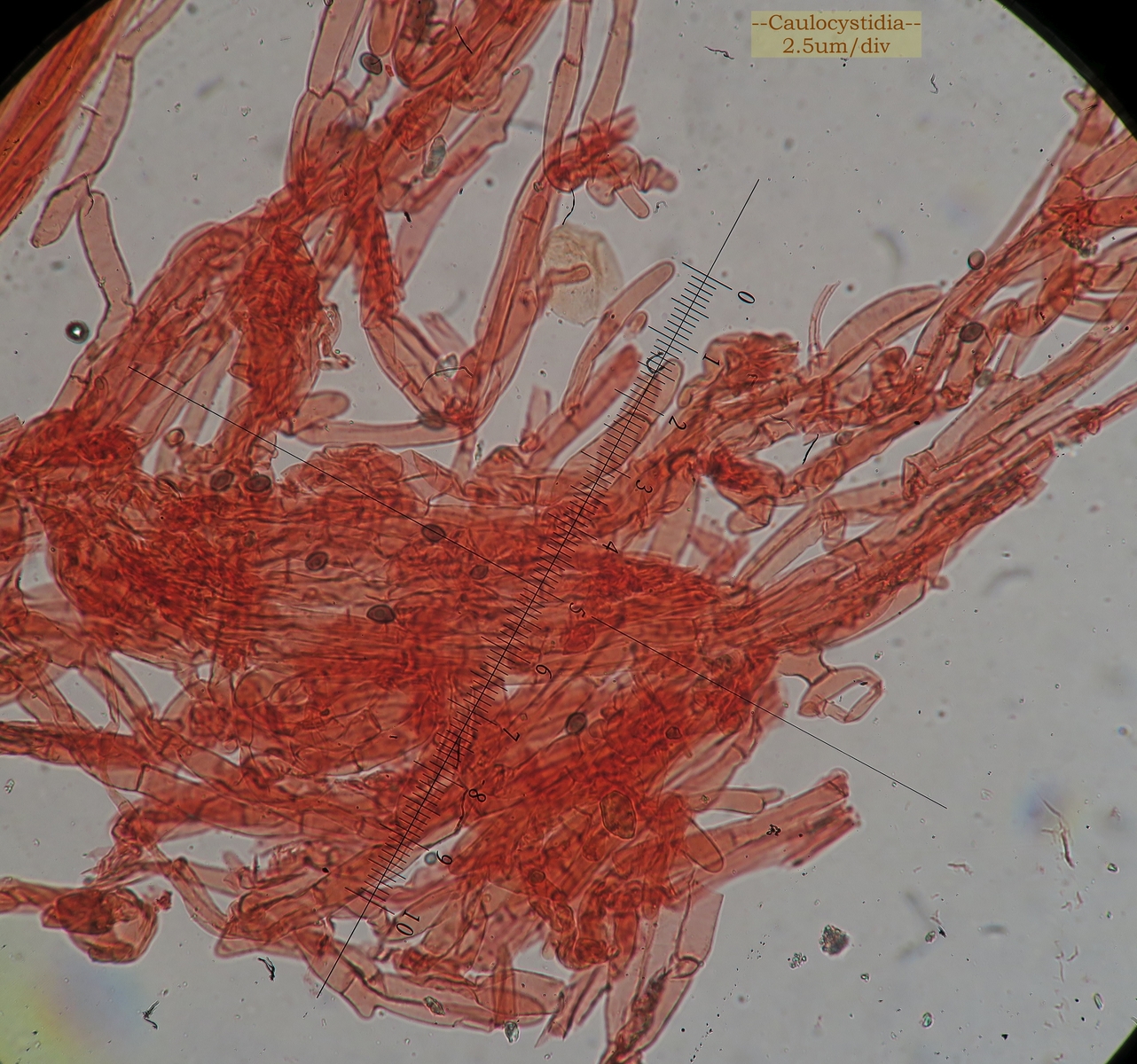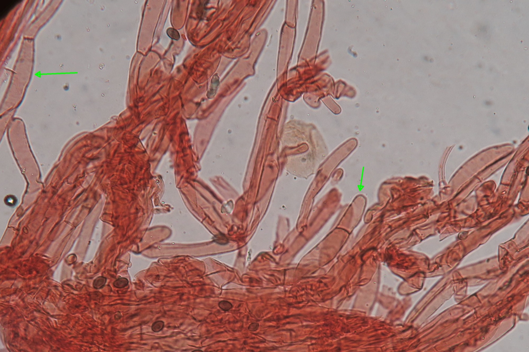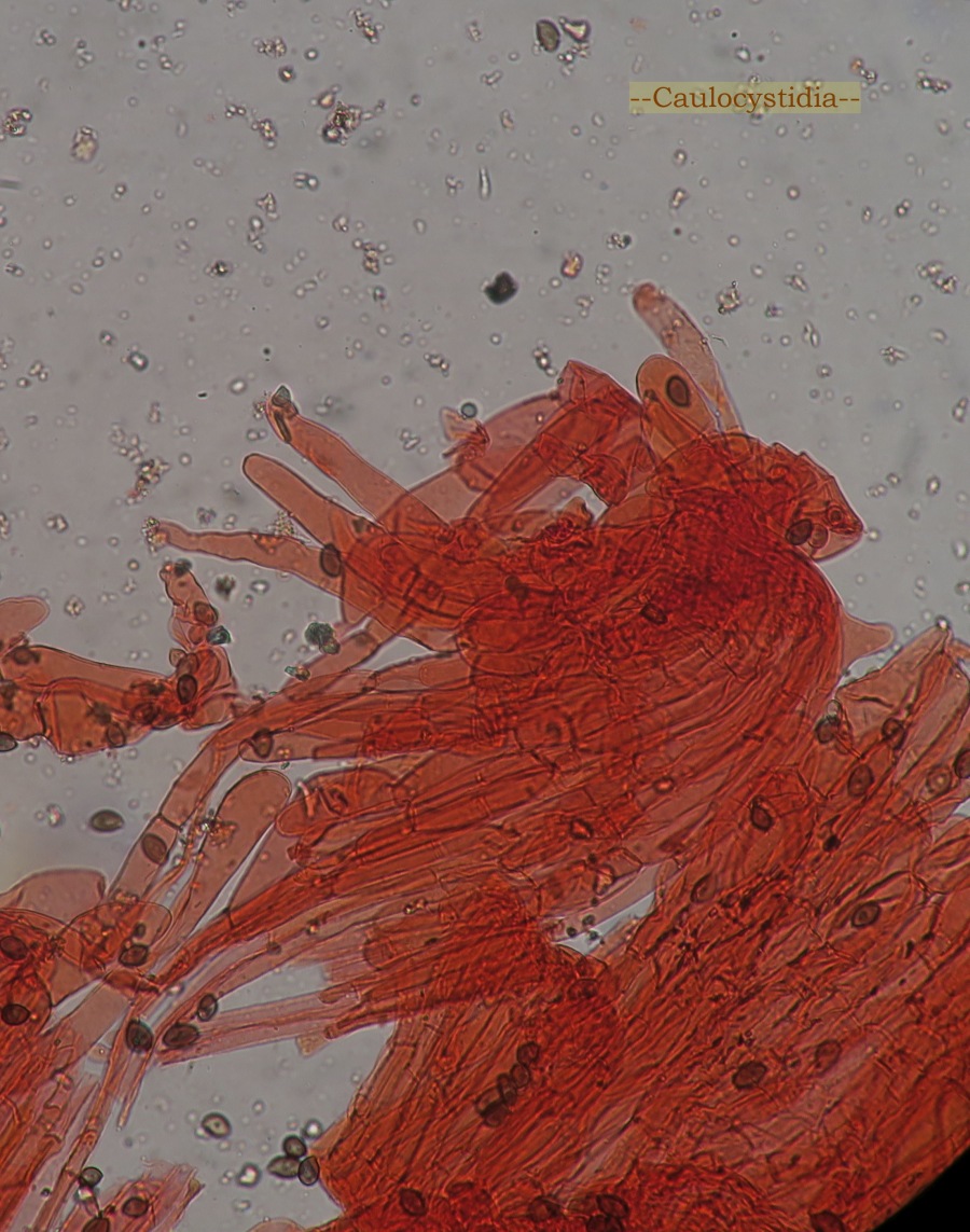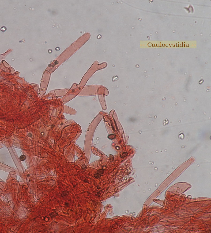 Caulocystidia or hairs looked as elongated shortly-cylindrical hyphae
