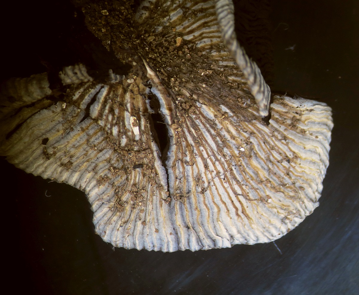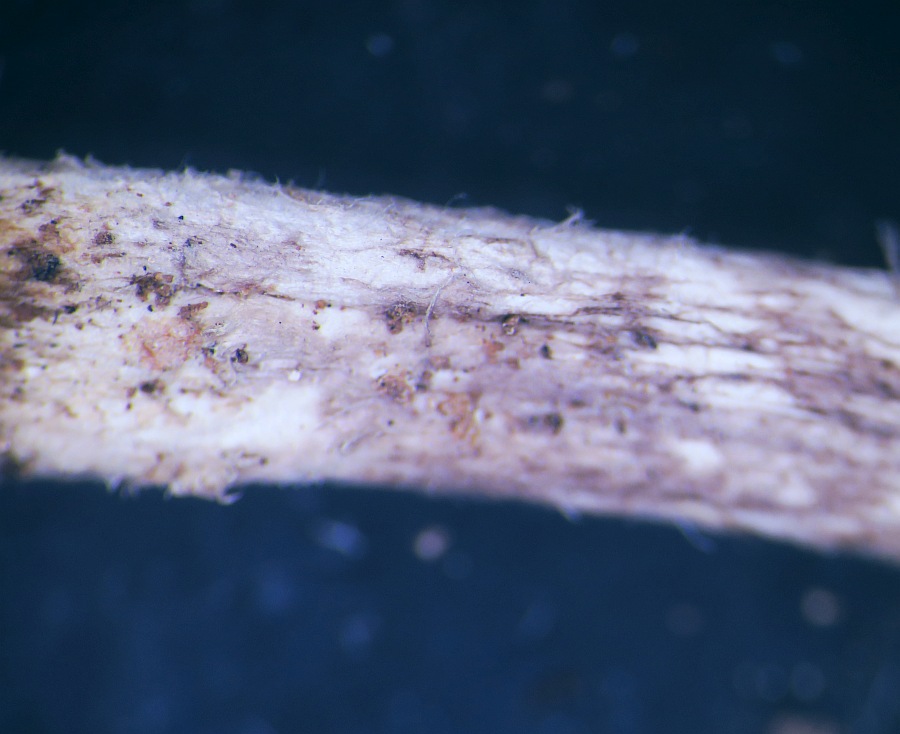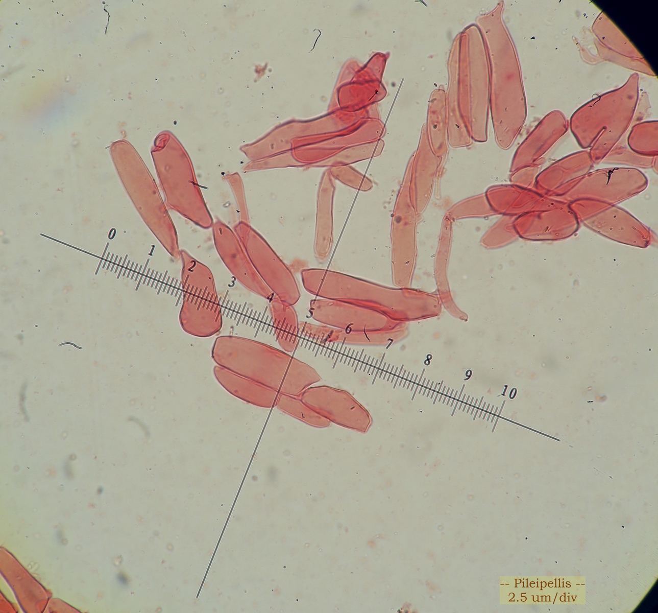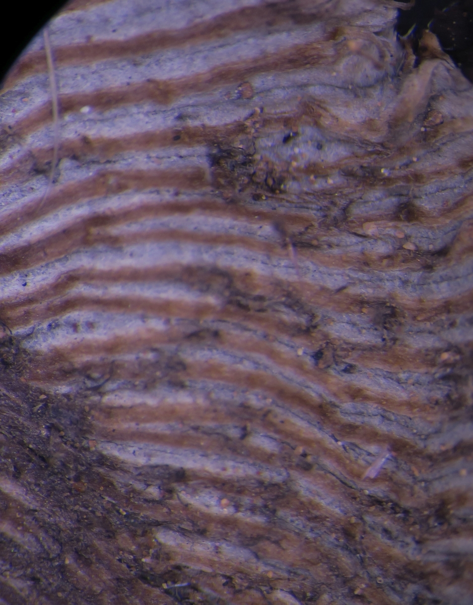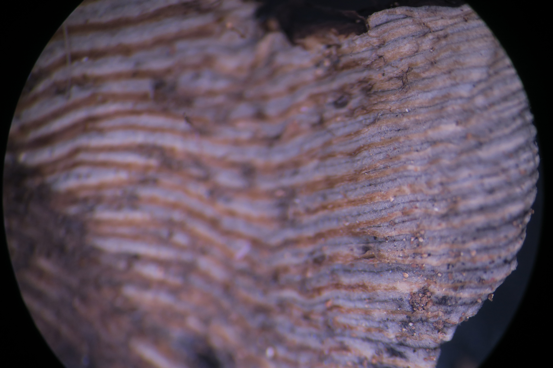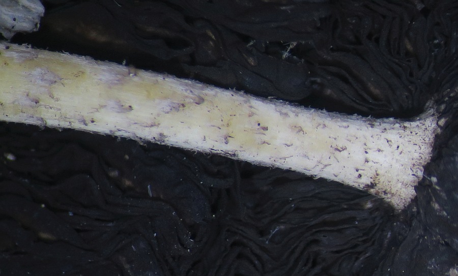 First of all, a strange character is the presence of pubescence especially at the base of the stipe (I am used to glabrous stipes for Parasola). Next the pileus lacked the typical thick-walled setae (see images) but there was some kind of hyphae forming free fibrillose tufts on the pileus. The pileus was ribbed, with the ribs being brownish and the furrows being grey. The exsiccata has lost its basidia and most cheilocystidia since the edges had eroded/deliquesced, but I managed to see two large spherical bodies which might represent cheilo-or pleurocystidia, but since being globular, they might be something else. The pileipellis consisted of not very long rectangular to cylindrical hyphae, with truncated ends, sometimes a small branch (foot) and with some pigmented (?) incrustations. The following sizes were measured: