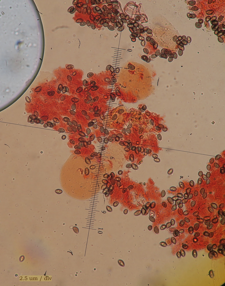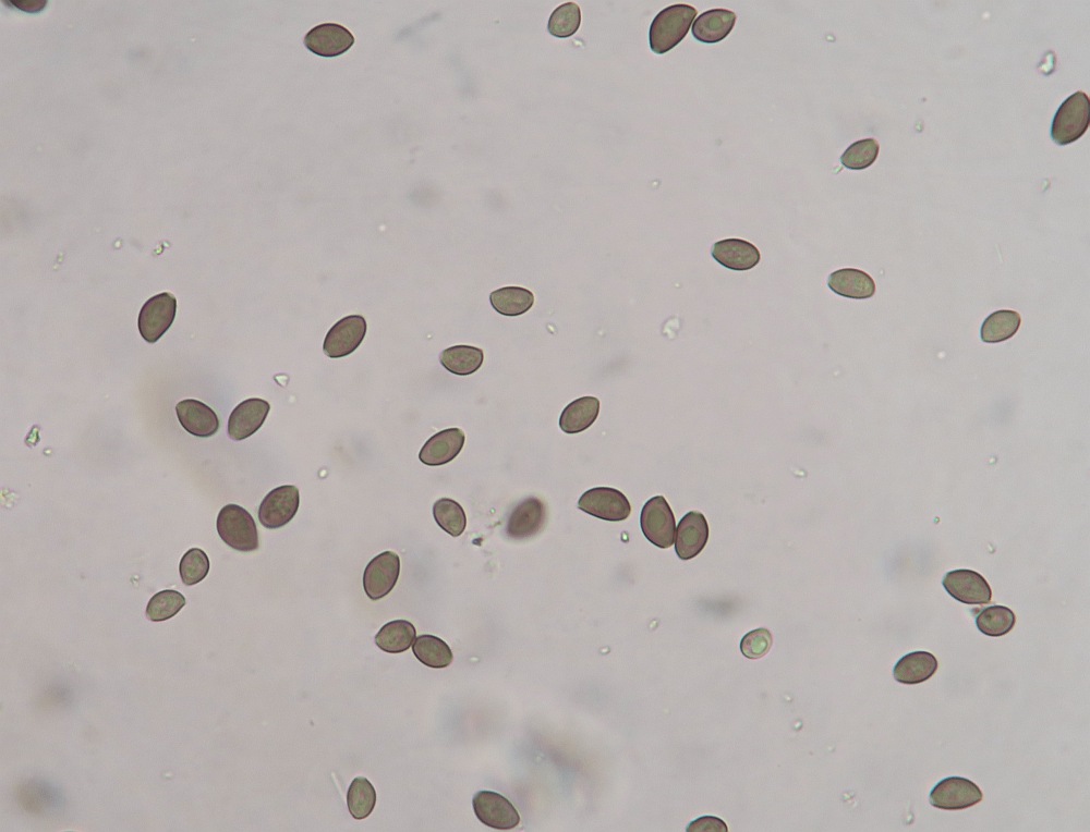 The spores are ovoid or almond shaped (depending the plane of view) with a distinct germpore