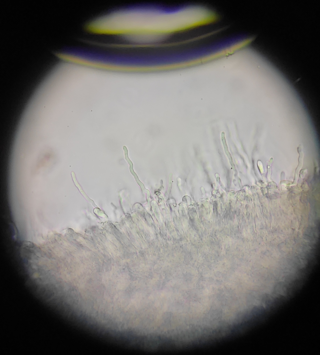 Ich dachte ursprünglich an Hohenbuehelia petaloides, aber da passen die Sporen so gar nicht dazu. Also wohl ein Seitling. Bei denen sehe ich aber nicht durch, finde ich fast nie aus irgendeinem Grund.