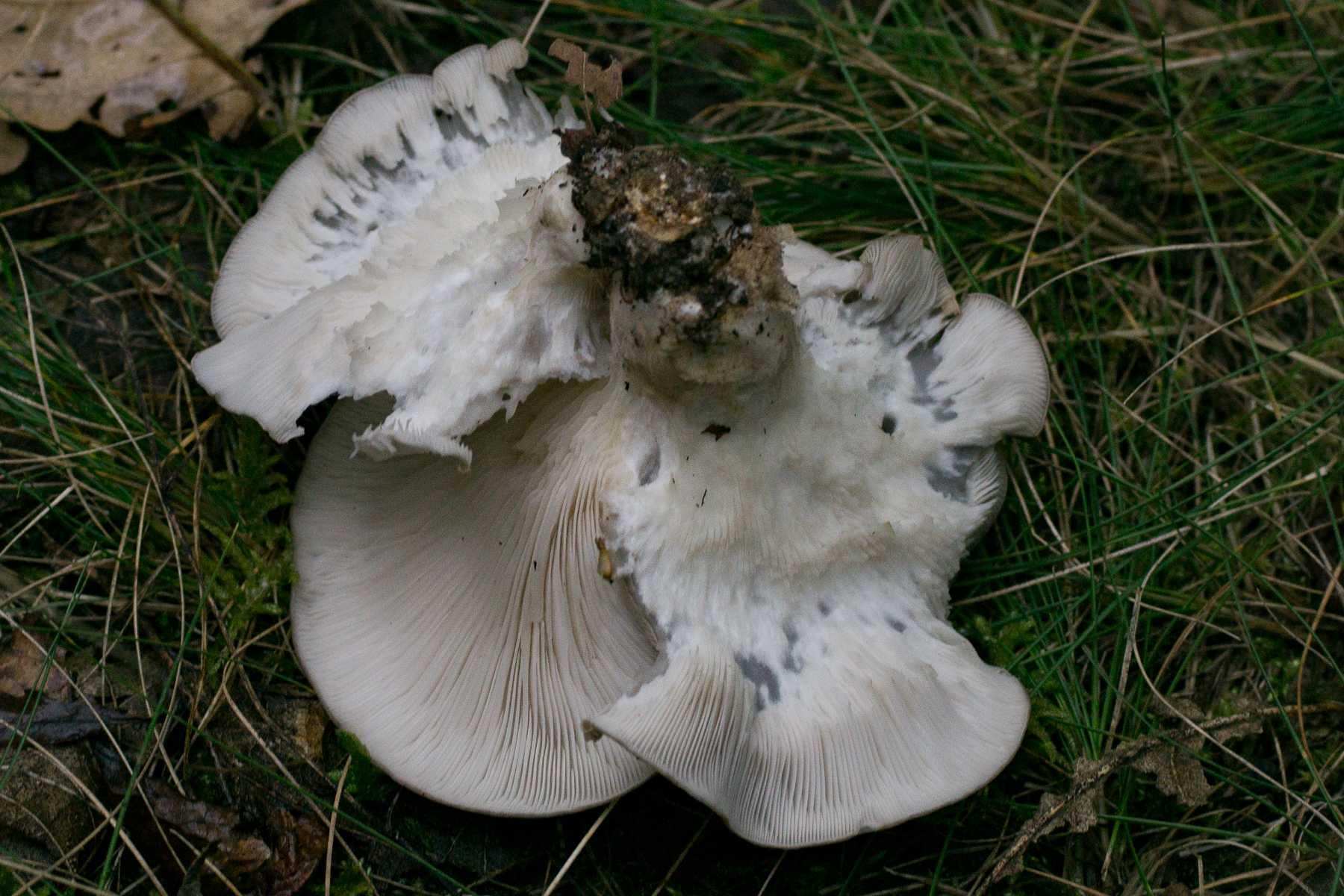 Das hier sind meiner Ansicht nach ganz normale Austernseitlinge (Pleurotus ostreatus), die kommen auch mal auf vergrabenem Substrat vor und schieben ihre Fruchtkörper dann halt durch die darüberliegende Erdschicht.
