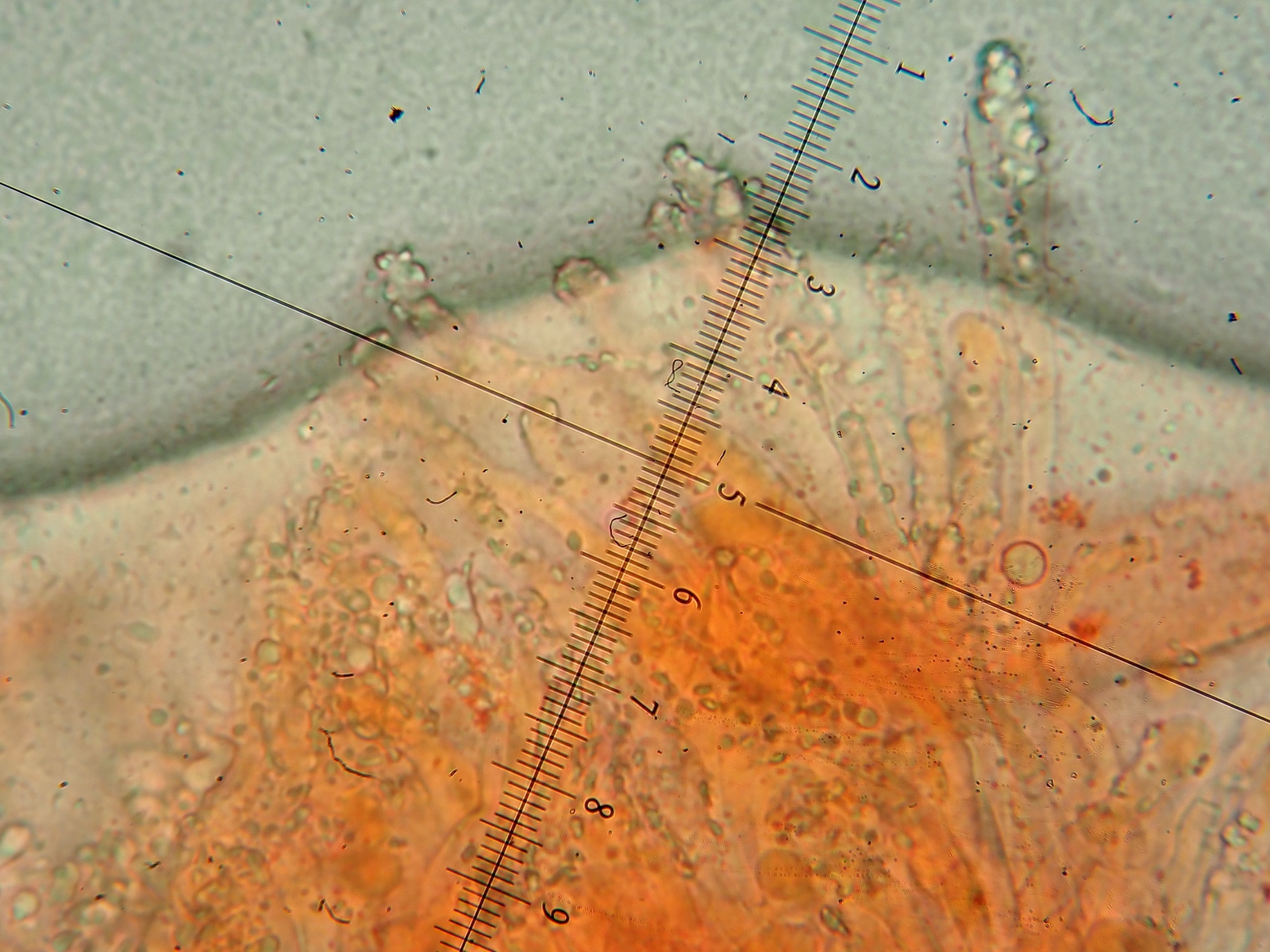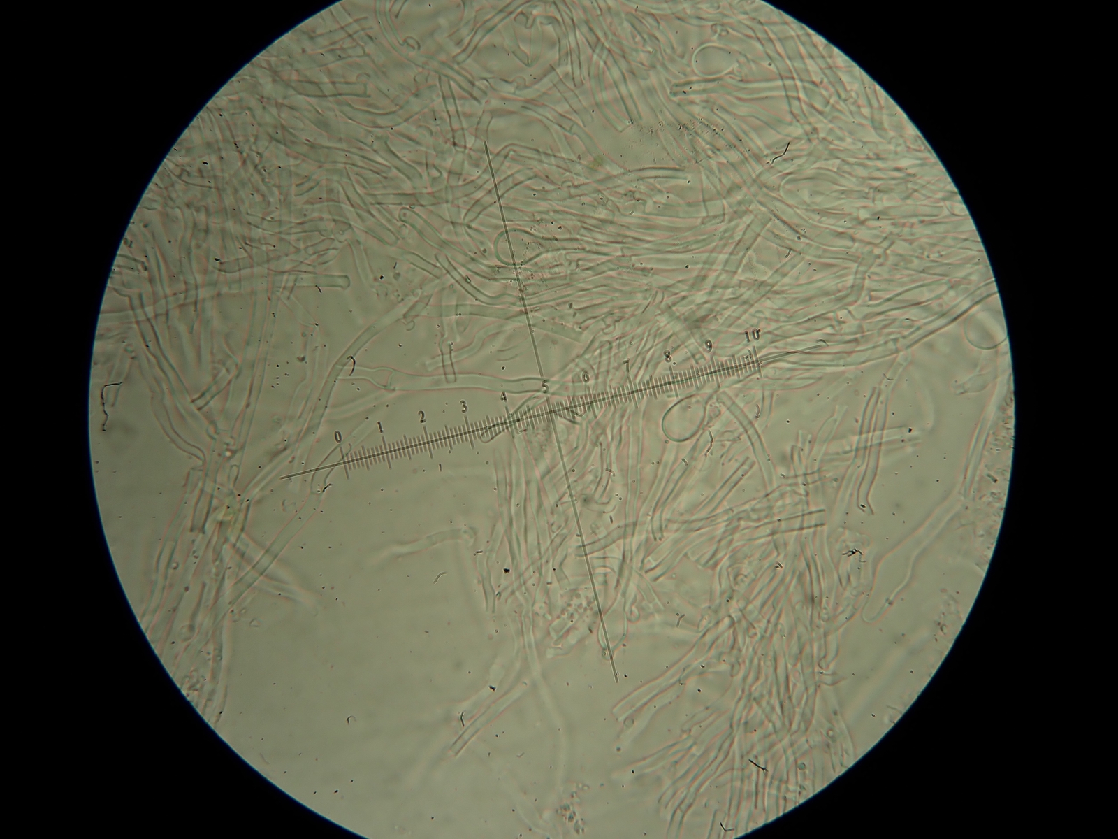 Die an ihren Enden stark inkrustierten Skeletthyphen sind nur unwesentlich breiter als die generativen Hyphen. Schnallen scheinen überall vorhanden zu sein. Leider fand ich keine Sporen an dem mir bislang unbekannten Pilz.
