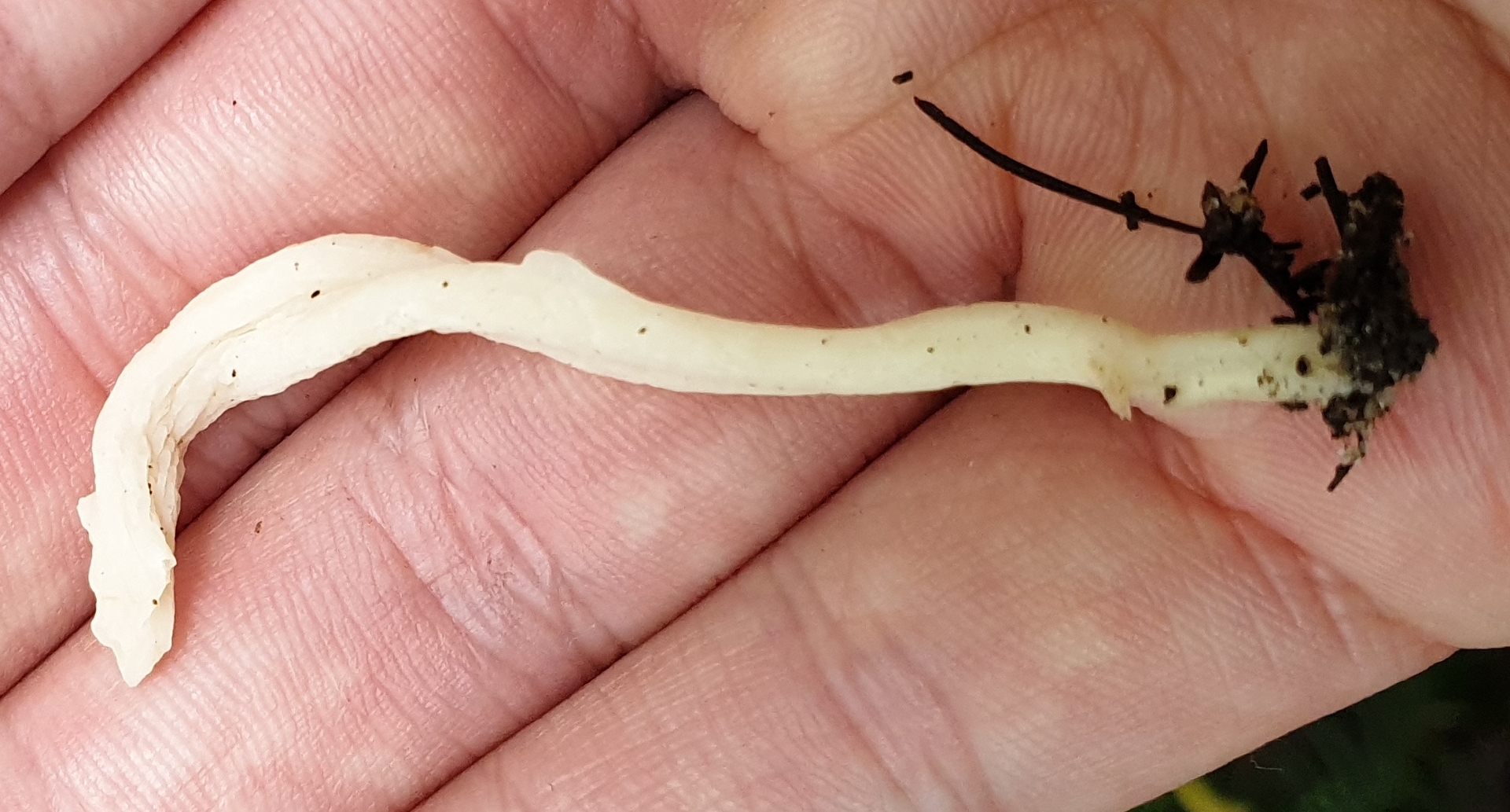 Jüngere Exemplare strahlend weiß, ältere eher cremefarben, runzelig und oben teilweise spatelförmig.