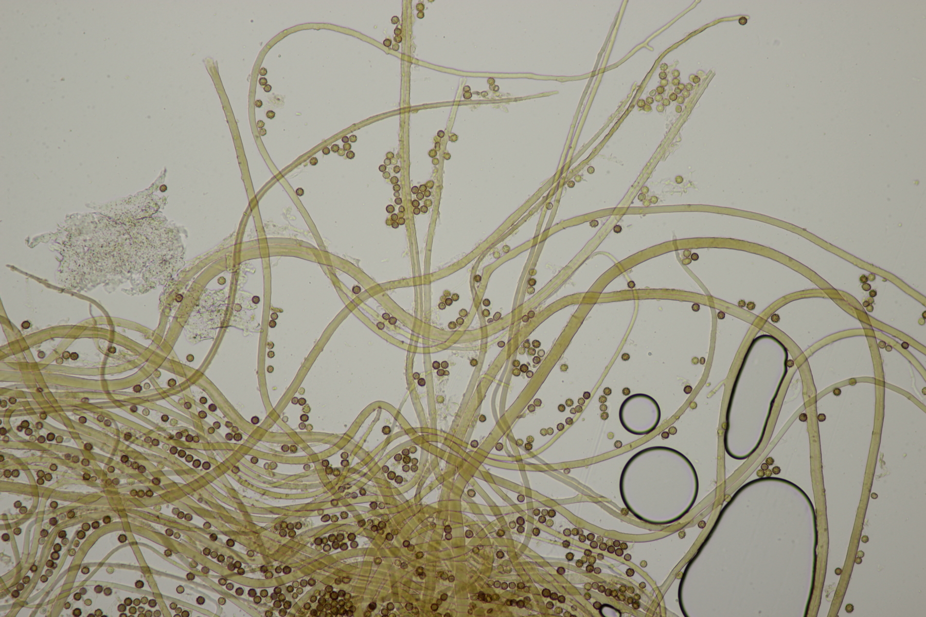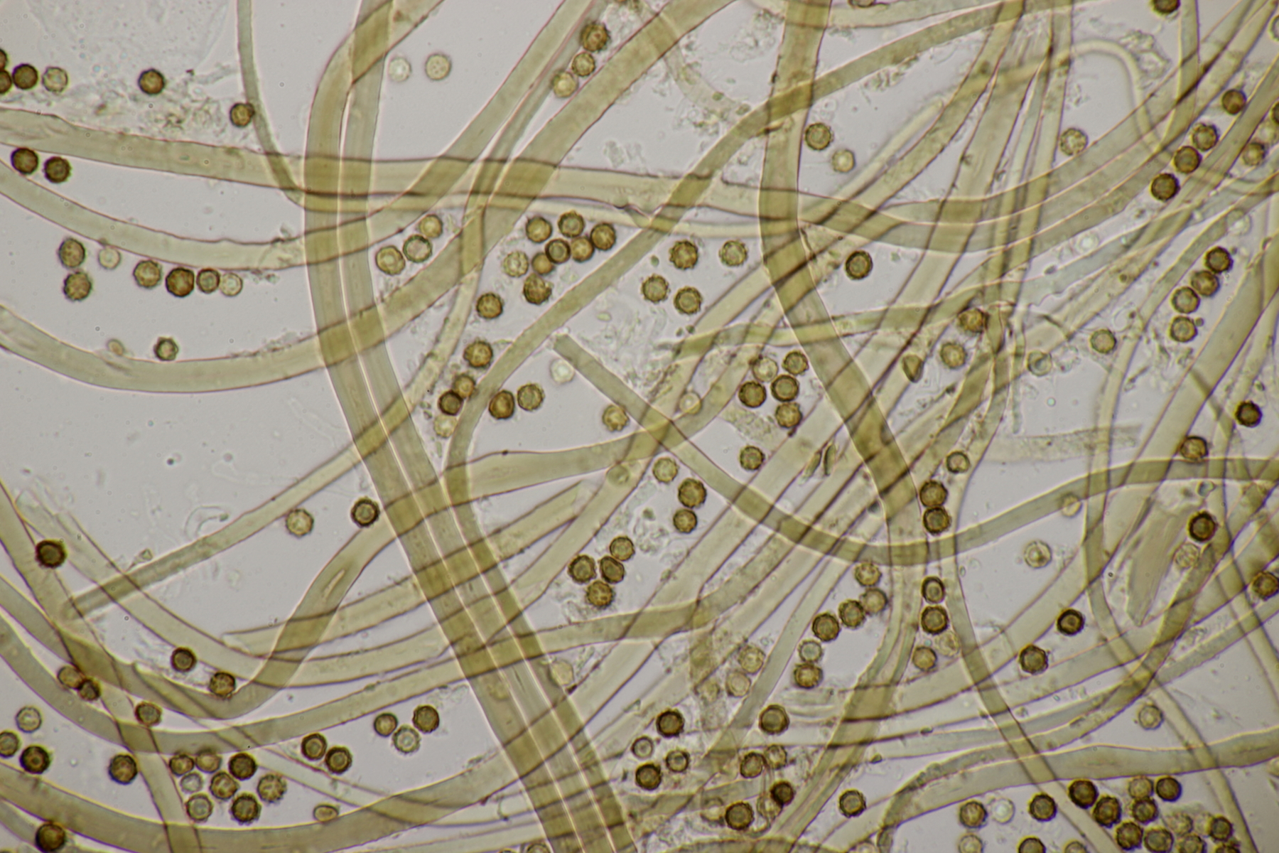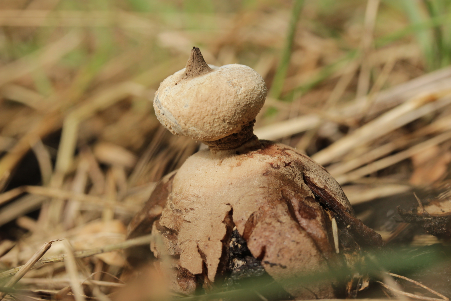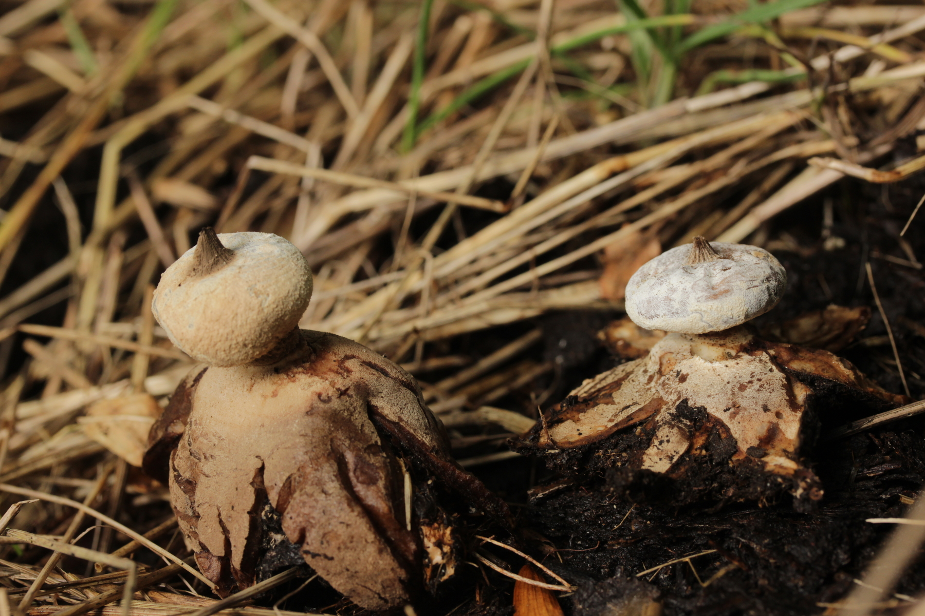 bei der Tour in die Rheinaue Walsum gab es auch einen Erdstern, der nicht zu den hier in der Gegend häufig vorkommenden Arten G. fimbriatum und G. triplex gehört. Fundort war der Übergang von einer Ecke zu einer Wiese, potentiell ein nährstoffreicher Standort mit Stroh und Pflanzenabfällen/Mist. Das Peristom ist kegelförmig, gefurcht. Die Endoperidie ist gestielt, wobei an der Unterseite eine Art Kragen erkennbar ist. Die Sporen messen 4.2-5.0 µm und sind relativ grobwarzig. Das Capillitium ist unseptiert und sehr dickwandig. Damit lande ich dann bei Geastrum striatum. Was sagen die Erdstern-Expert:innen wie lamproderma dazu?