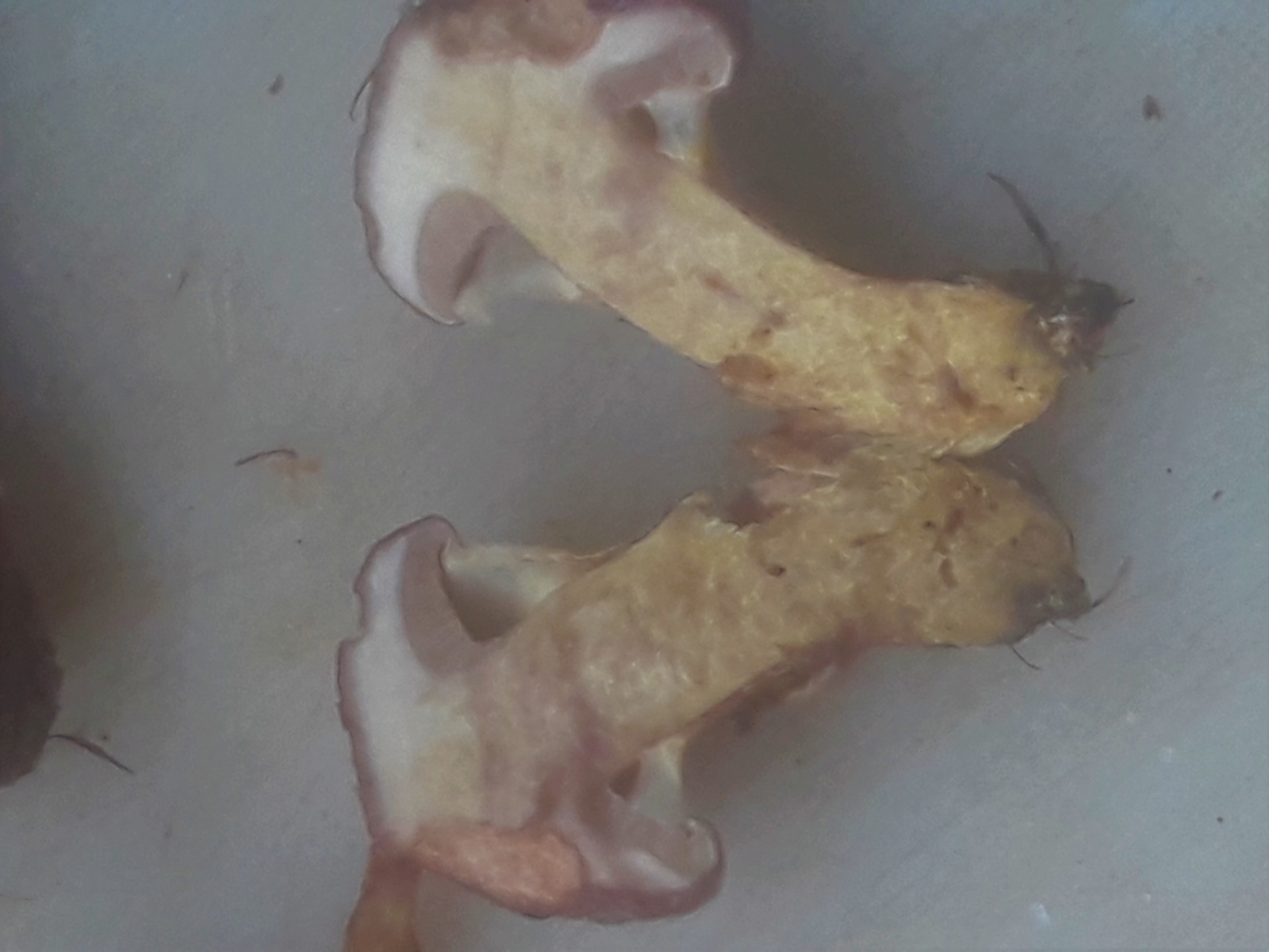 Sorry, weitere brauchbare Bilder hat mein bescheuertes Handy nicht mehr machen wollen und inzwischen sind die Pilzlein verfrühstückt. Auffällig die kaum gelblichen Röhren samt blassem Hutfleisch. Frisch angeschnitten sah das Fleisch der Stielbasis aber doch typisch goldröhrlingsgelb aus. Kiefern waren im weiteren Umfeld auch vorhanden, aber dass Butterröhrlinge dieses typische Gelb im Stielfleisch hätten, hab ich nirgendwo verifizieren hätten.