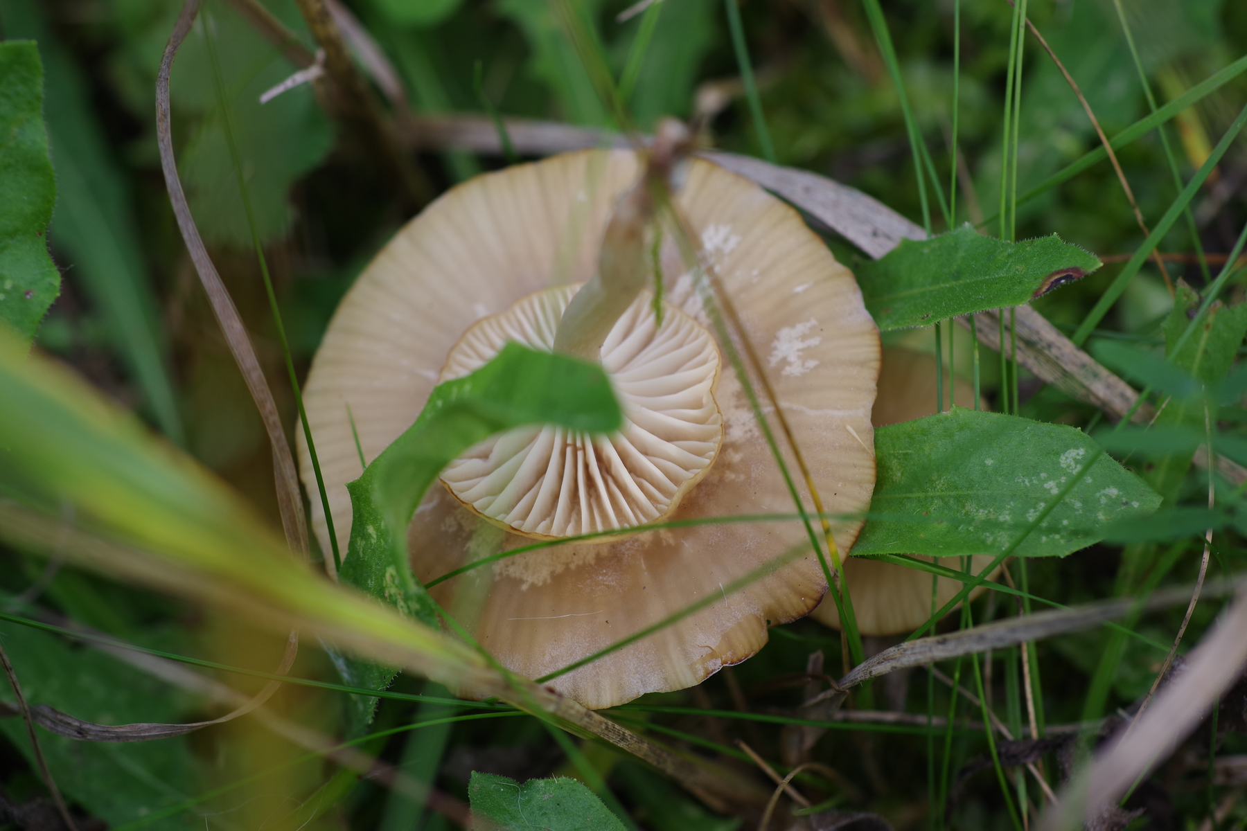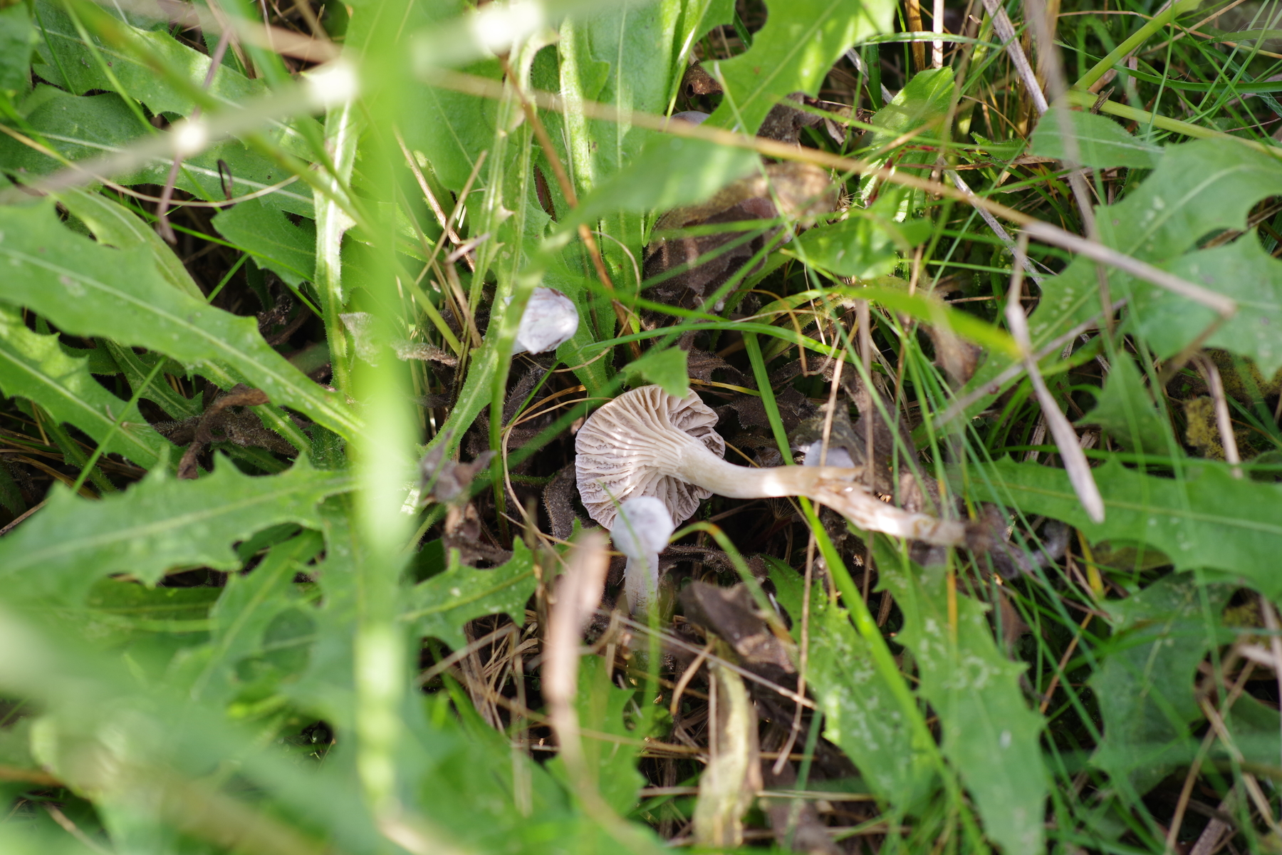 3) Lamellenpilz aus der Ellerlingsecke, leicht hellblau, grau bemehlt, wenn man das abwischt, wird es ockerbraun; mit auffällig oben verdicktem Stiel. Der große hat einen Hutdurchmesser von 28 mm