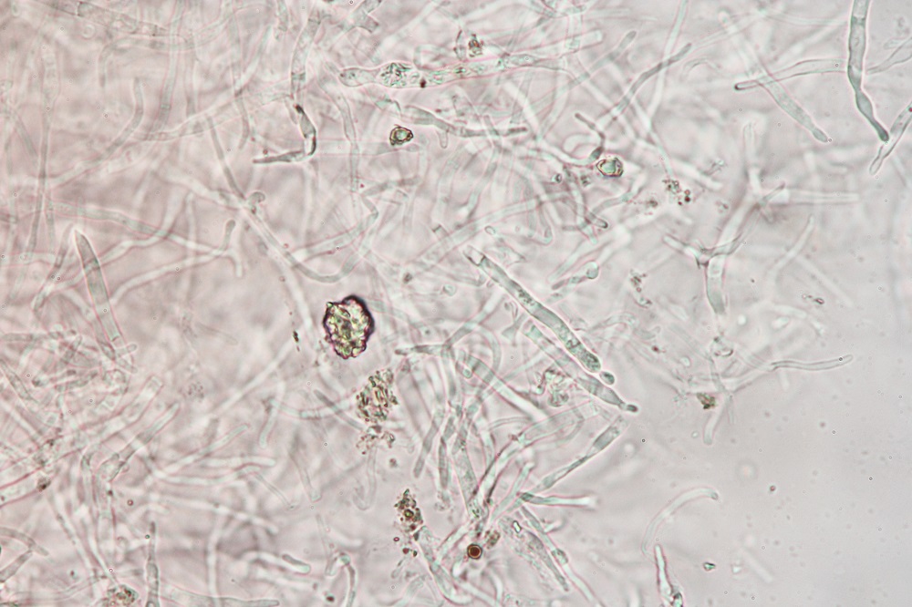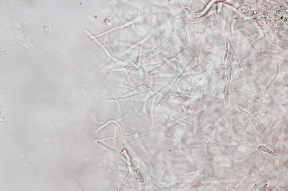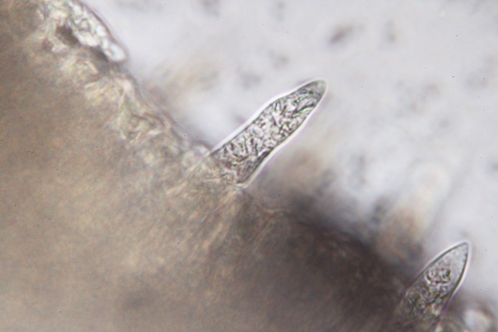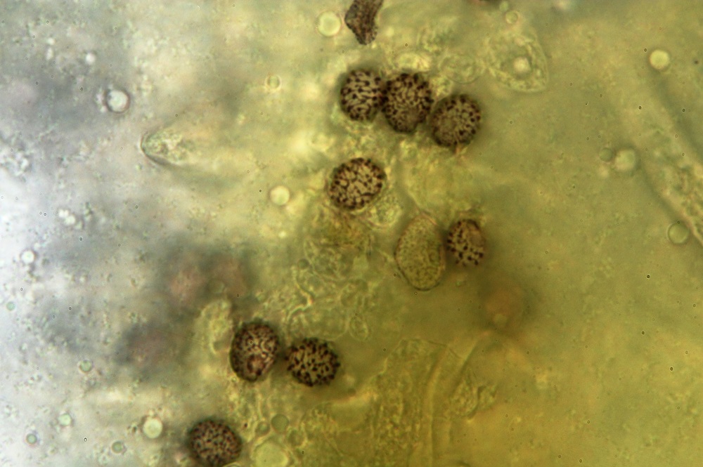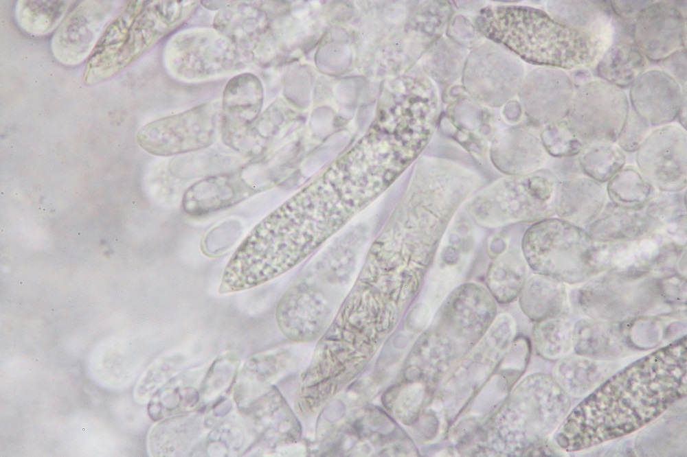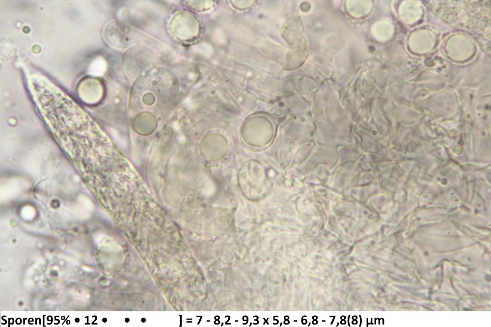 Ein Sporenabwurfpräparat hat nicht geklappt, da der Pilz zu wenig Sporen abgeworfen hat, aber die Sporen sind entweder weiß/ocker/gelb, aber nicht dunkel oder anders farblich gefärbt.