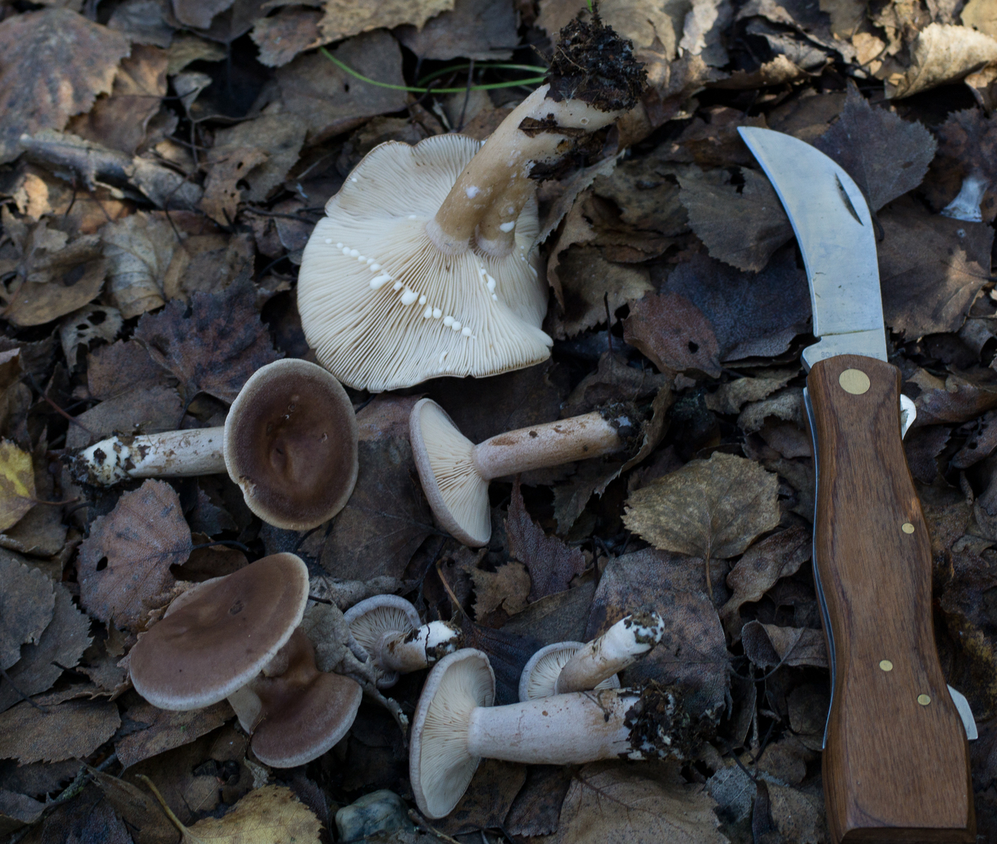 4. Und an dem knabbere ich ein wenig. Fundort an Gewässerrand auf lehmigem Boden unter Birke. Eiche war aber auch im Einzugsbereich. Milch scharf und weiß. Auffällig ist die weiße Stielspitze und der weiße Hutrand, der bei einigen älteren auch gerippt erscheint. Der Stiel bekommt bräunliche Flecken nach dem Anfassen. Irgendwie finde ich nix richtig gut passendes mit so einer braunen Hutfarbe. Evtl. trocknet die Milch auch grünlich ein, da muss ich aber morgen nochmal bei Tageslicht schauen. Lactarius fluens hatte ich z.B. überlegt aber kann der so braun sein? Und die Bäume passen wohl auch nicht so richtig, oder?