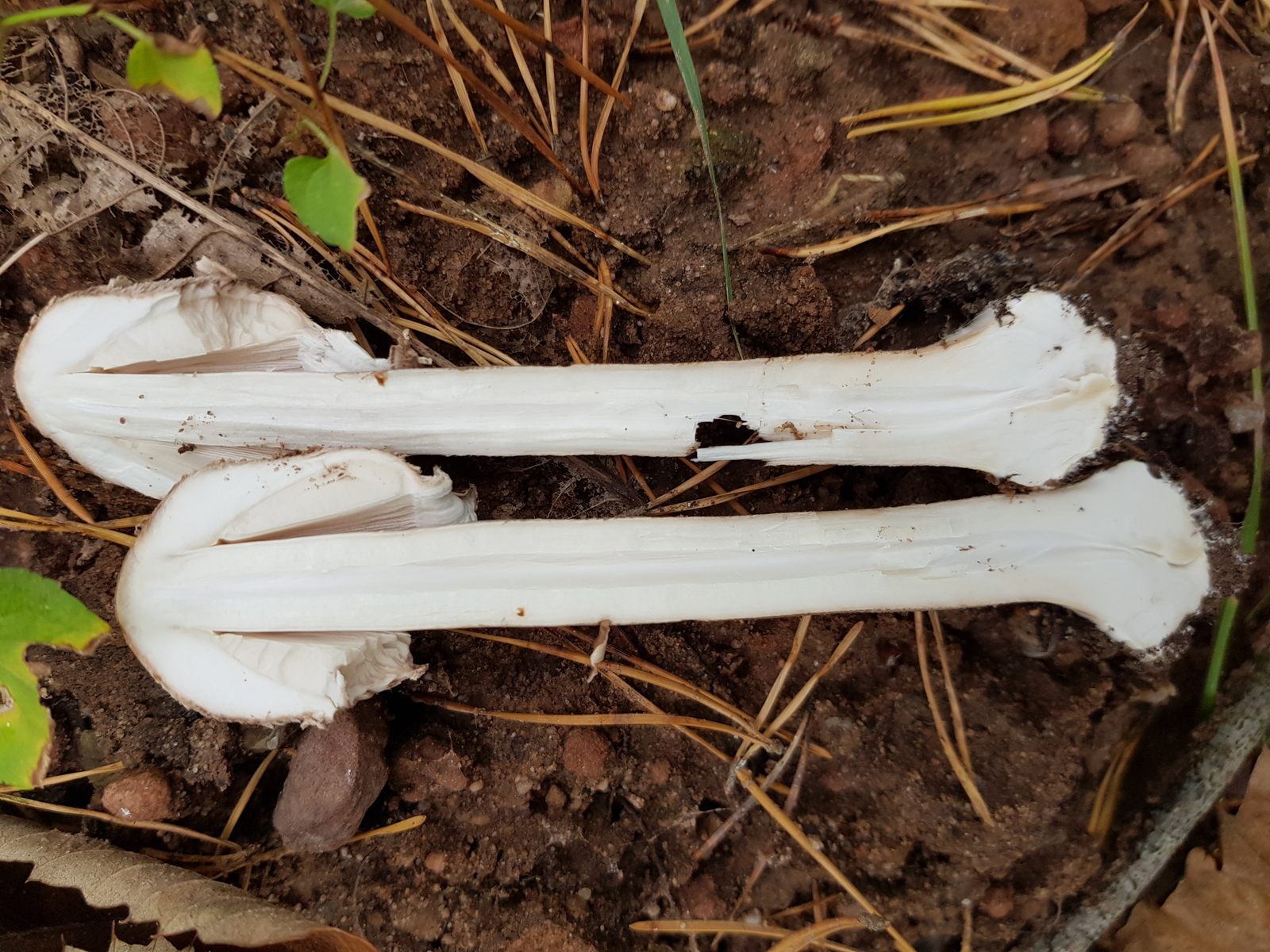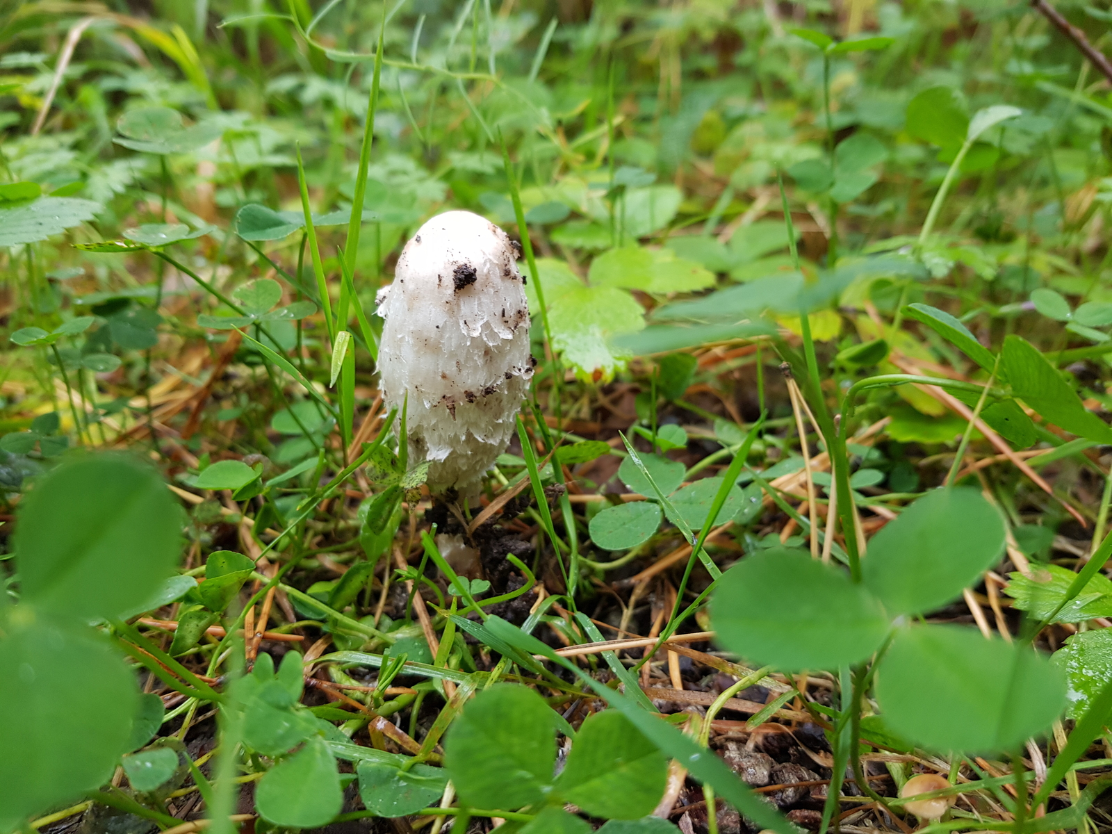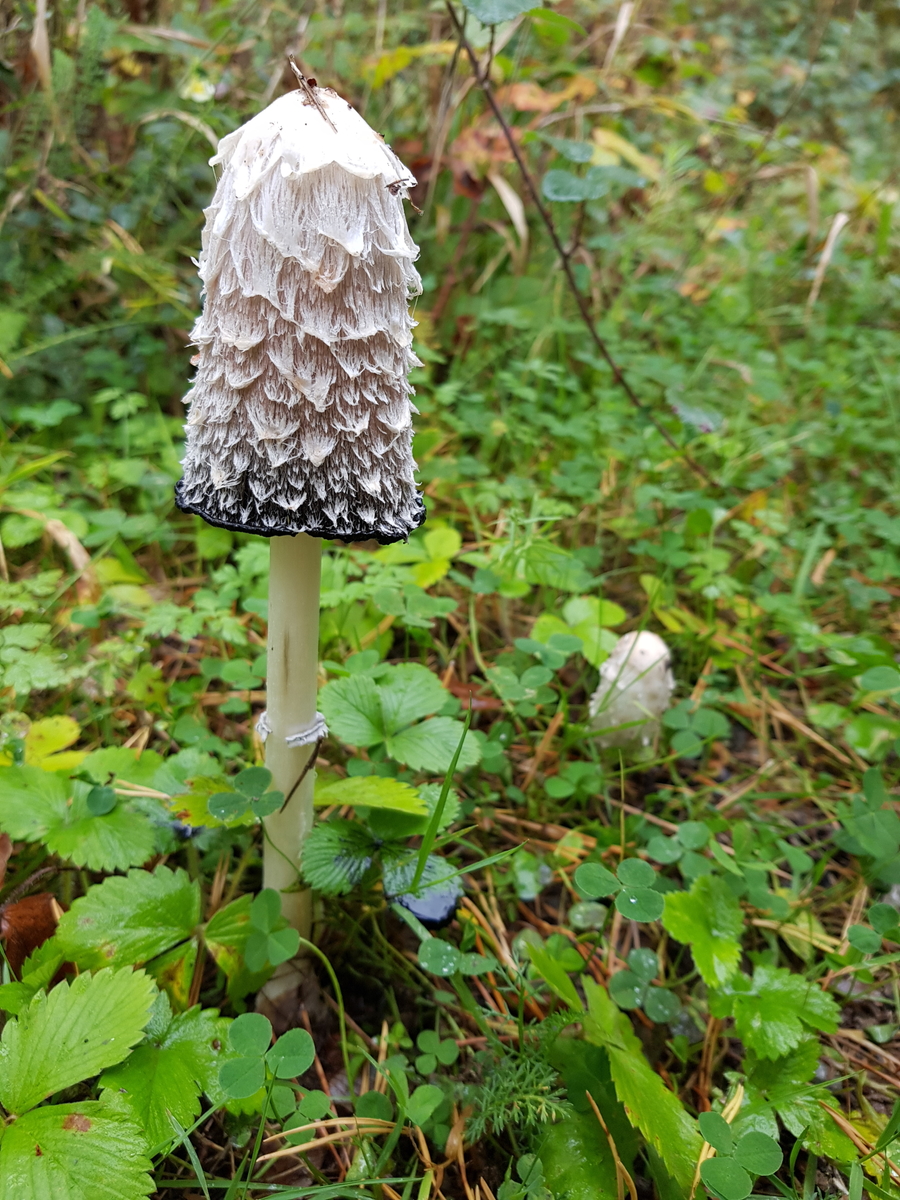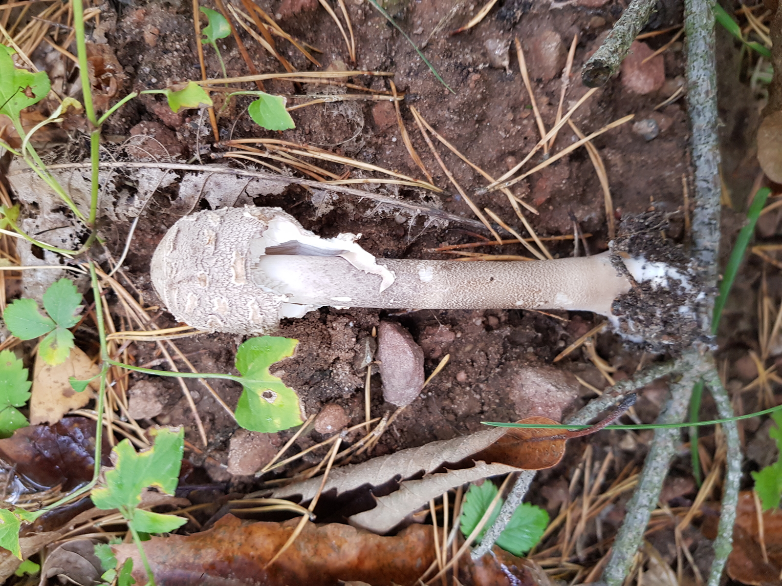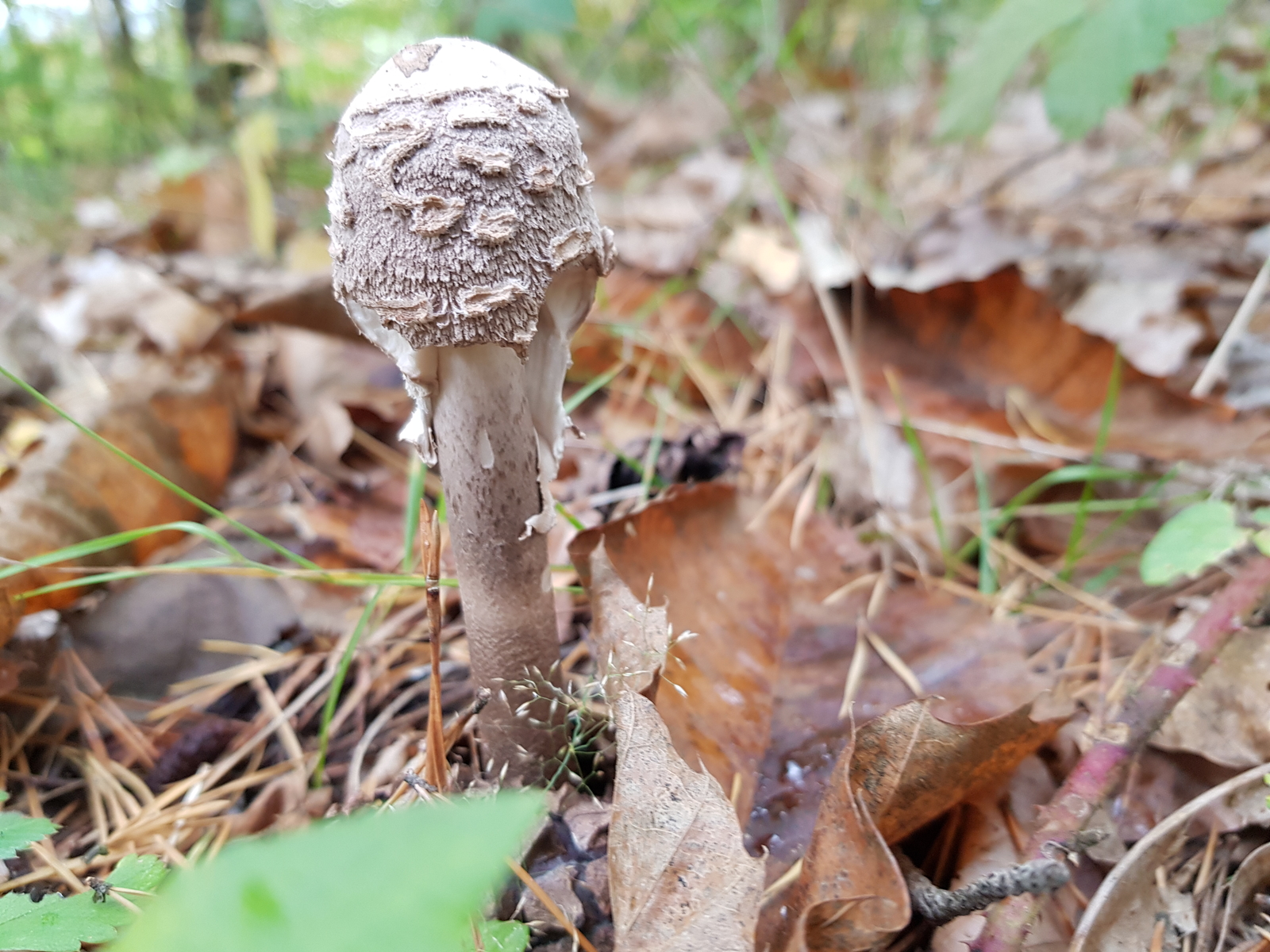 Und dann stand da im Kiefernwald, zwischen einer Birke und vermutlich einer Buche (extrem große Blätter) dieser Paukenschlegel? Schupfnudel Schupfi, eigentlich wollte ich dieses Baby hier nicht zeigen, aber die Hutoberfläche zwischen den Schuppen-Schollen ist so rau und schuppig, dass ich doch zu fragen wage, was das sein könnte. Wenn die Oberfläche weniger aufgerissen wäre, könnte es ein Parasol sein. Aber ein Ring sollte da scheinbar auch nicht entstehen. Wer hat eine Idee, was das sein könnte?