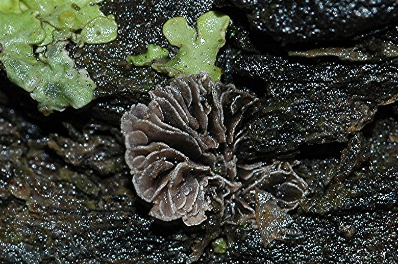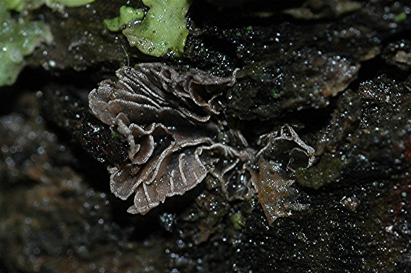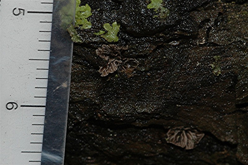 Mein Tipp wäre alte Fruchtkörper von Resupinatus trichotis/applicatus (Dichtblättriger Liliputseitling), die sehen alt auch so aus und sind zudem recht häufig.