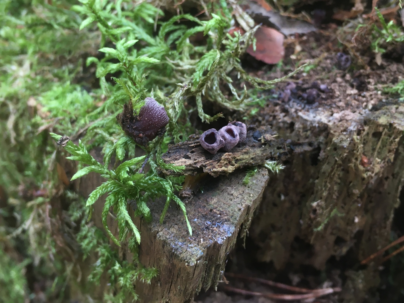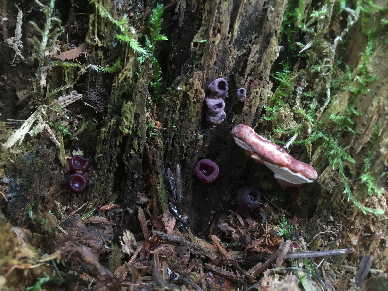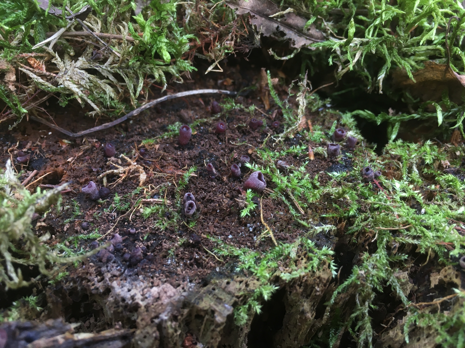 letzte Woche fand ich in einem Sand-Kiefern-Eichenwald an zwei verschiedenen Standorten auf stark verwitterten, bemoosten Stümpfen (leider ohne Rindenreste... Edit: das ist doch ein Wurzelschwamm da -> dann muss es also Kiefer sein) kleine schwarz-violette, außenseits hell bekleiite bis ca 6mm hohe und 3-4mm breite Becherchen. Eine erste Recherche ließ mich trotz Mikroskopie (keine Sporen, furchtbar kleine hyaline Asci) ratlos zurück, nicht mal eine Gattung wollte passen.