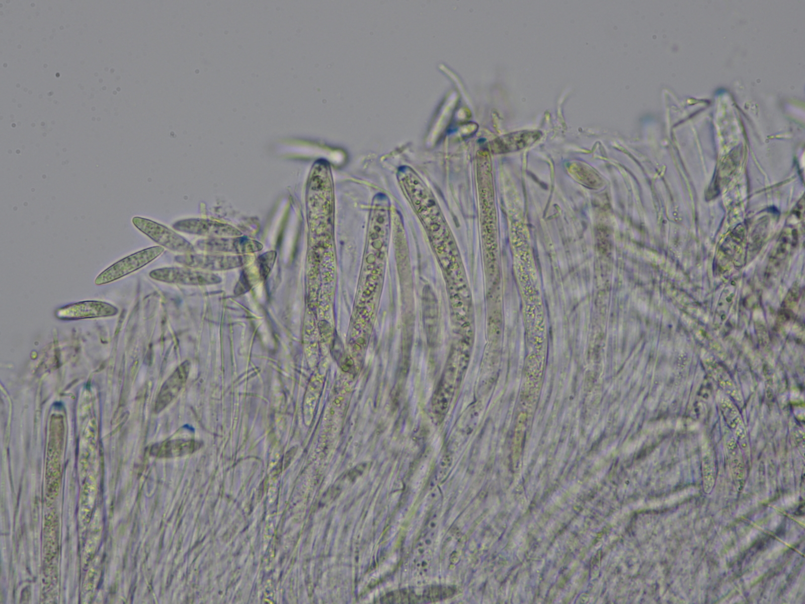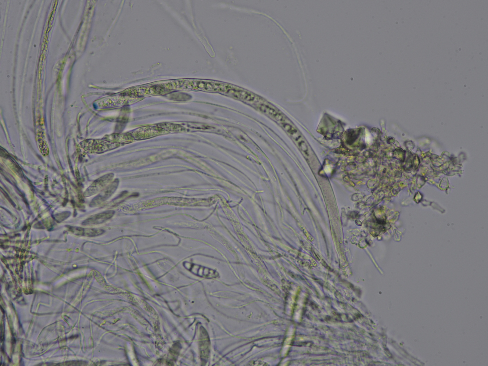 Heute habe ich mir die Kleinen nochmal vorgenommen und siehe da, sie waren offenbar gereift und plötzlich gab es reichlich reife Sporen. Die Konsistenz der Apothecien war bei der Präparation auffallend knorpelig und ich fand einige schöne Kristalle die mich an Zitterlinge erinnerten- zusamen mit der violetten Farbe kam mir die Idee es könnte vielleicht eine Hauptfruchtform einer Ascocoryne sein. Bisher fand ich nur die "Pilzgehirne" aka Nebenfruchtform vom Fleischroten Gallertbecher (Acocoryne sarcoides), selten auch in Gemeinschaft mit der Hauptfruchtform. Allerdings fand ich die Becher bisher nie alleinstehend und immer in einer flach ausgebreitenen Form. Leider fand ich im Netz auch keine Bilder der jungen Becher- ob sie wirklich so hohe Formen bilden können? Die mikroskopischen Details würden nach dem Schlüssel von Baral gut zu Ascocoryne cylichnium dem Großsporigen Gallertbecher passen. Aber auf dem makroskopischen Bild im Schlüssel sind aber auch wieder so flache und viel hellere Flatschn zu sehen. Was meint ihr dazu?