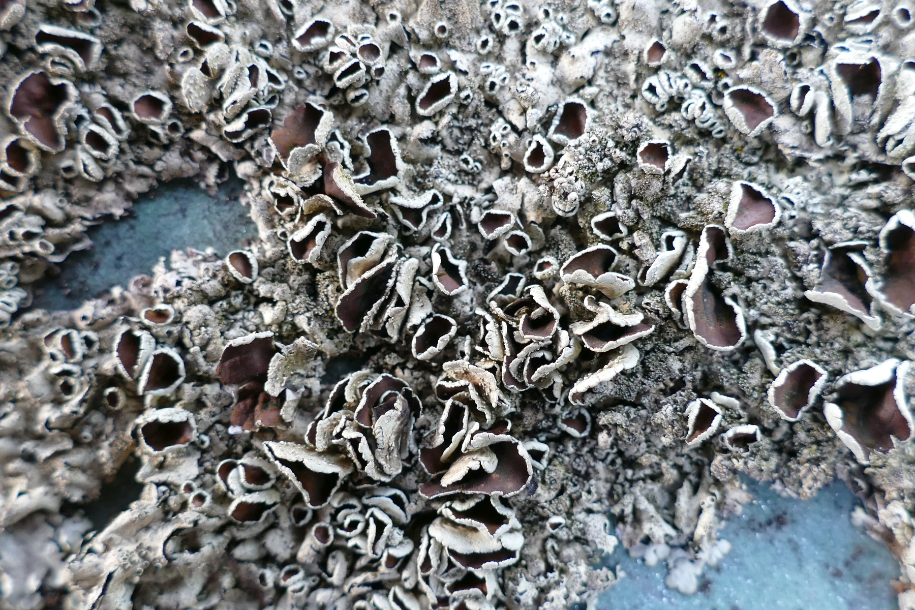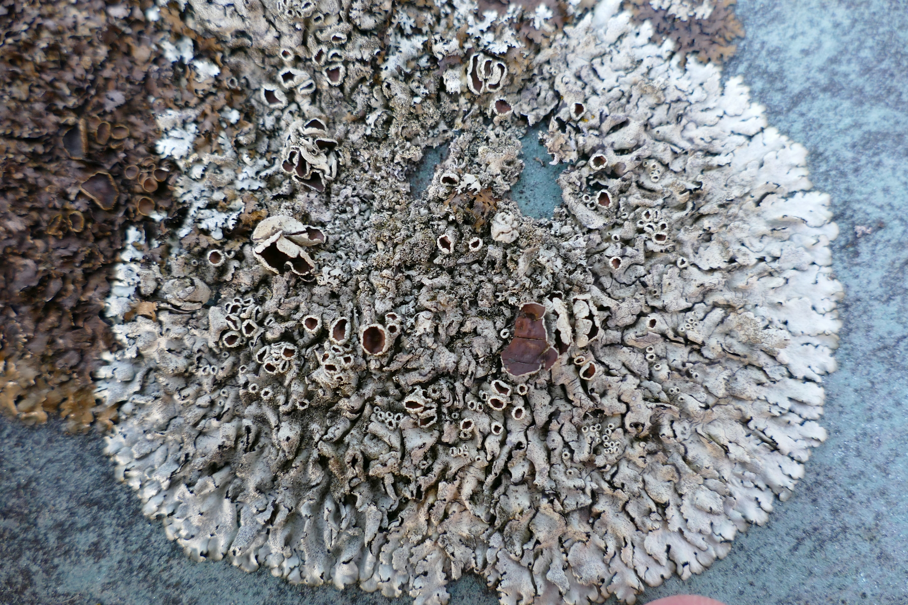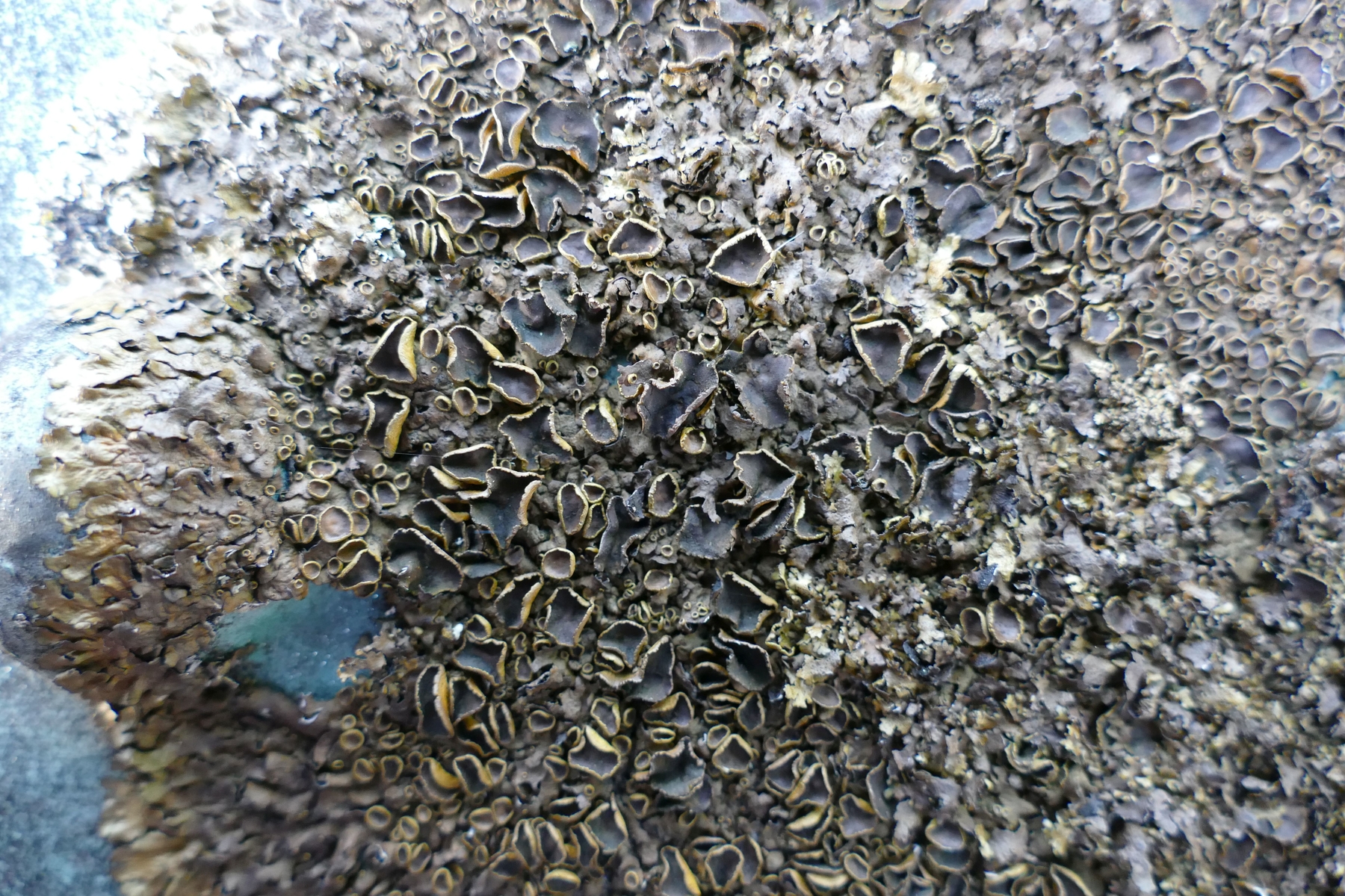 Eine dunkle Sorte, deren große Exemplare flächig mit Apothecien bewachsen sind (eventuell xanthoparmelia cf. pulla)