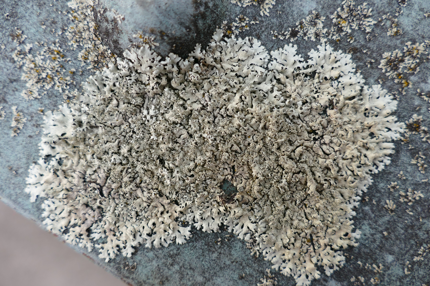 Neben den Xanthoparmelien waren aber auch viele andere, kleinere Flechten auf dem alten Geländeranstrich zu finden: